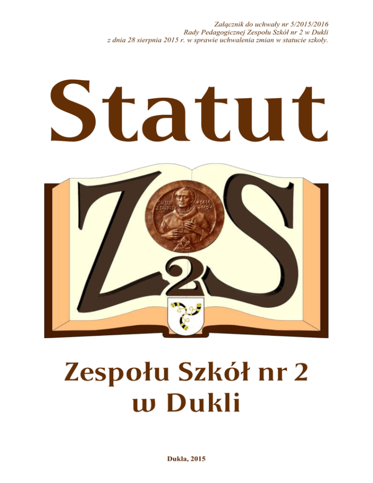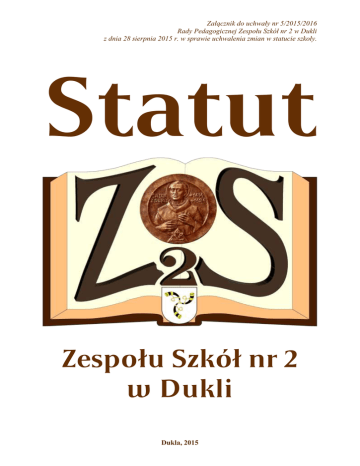 Załącznik do uchwały nr 5/2015/2016 Rady Pedagogicznej Zespołu Szkół nr 2 w Dukli z dnia 28 sierpnia 2015 r. w sprawie uchwalenia zmian w statucie szkoły. Statut Zespołu Szkół nr 2 w Dukli Dukla, 2015 SPIS TREŚCI Rozdział I Postanowienia ogólne .................................................................................. 3 Rozdział II Cele i zadania szkół wchodzących w skład Zespołu Szkół nr 2 ............. 4 Rozdział III Organy Zespołu Szkół nr 2 w Dukli ........................................................... 6 Rozdział IV Zasady współpracy i sposób rozstrzygania sporów między organami Zespołu Szkół nr 2 w Dukli........................................................................ 11 Rozdział V Organizacja Zespołu Szkół nr 2 w Dukli ................................................. 11 Rozdział VI Zasady rekrutacji uczniów do Zespołu Szkół nr 2 w Dukli .................. 15 Rozdział VII Wewnątrzszkolny system oceniania ........................................................ 16 Rozdział VIII Projekty edukacyjne w gimnazjum ......................................................... 22 Rozdział IX Uczniowie Zespołu Szkół nr 2 w Dukli ................................................... 32 Rozdział X Wyróżnienia, nagrody i kary. ................................................................... 37 Rozdział XI Nauczyciele i inni pracownicy Zespołu Szkół nr 2 w Dukli................. 39 Rozdział XII Rodzice (prawni opiekunowie) uczniów Zespołu Szkół nr 2 w Dukli ......................................................................................................... 46 Rozdział XIII Tradycja szkolna Zespołu Szkół nr 2 w Dukli ......................................... 47 Rozdział XIV Procedury postępowania nauczycieli w sytuacjach zagrożenia .......... 47 Rozdział XV Postanowienia końcowe ............................................................................ 49 2 Rozdział I Postanowienia ogólne §1. Zespół Szkół nr 2 w Dukli, zwany dalej ZS nr 2, jest placówką publiczną prowadzoną przez Gminę Dukla. Nadzór pedagogiczny sprawuje Podkarpacki Kurator Oświaty. §2. Podstawę prawną działania ZS nr 2 stanowi: Konstytucja Rzeczypospolitej Polskiej z dnia 2 kwietnia 1997 roku; Ustawa z dnia 7 września 1991roku o systemie oświaty (Dz. U. z 2004r. Nr 256, poz. 2572 z późniejszymi zmianami); Ustawa –Karta Nauczyciela z dnia 26 stycznia 1982 roku (Dz. U. z 2006 r. nr 97, poz. 674 z późniejszymi zmianami) oraz akt założycielski szkoły. §3. W skład ZS nr 2 wchodzą: 1) Gimnazjum im. Świętego Jana z Dukli w Dukli - zwane dalej Gimnazjum. 2) Liceum Ogólnokształcące im. Świętego Jana z Dukli w Dukli- zwane dalej Liceum, 3) Technikum w Dukli. 4) Uzupełniające Liceum Ogólnokształcące dla Dorosłych w Dukli. 5) Szkoła Policealna dla Dorosłych w Dukli. §4. Siedzibą Zespołu Szkół nr 2 jest budynek położony w Dukli, ul. Armii Krajowej 1. §5. 1. W Zespole Szkół nr 2 w Dukli używa się pieczęci urzędowych małej i dużej o treści następującej: 1) „Gimnazjum w Dukli”. 2) „Liceum Ogólnokształcące w Dukli”, 3) „Technikum w Dukli”, 4) „Uzupełniające Liceum Ogólnokształcące dla Dorosłych w Dukli”, 5) „Szkoła Policealna dla Dorosłych w Dukli”, 2. Pieczęć nagłówkowa wspólna dla wszystkich szkół wchodzących w skład ZS nr 2 zawiera nazwę: „Zespół Szkół nr 2 w Dukli. §6. Zespół Szkół nr 2: 1. Zapewnia bezpłatne nauczanie w zakresie ramowych planów nauczania. 2. Przeprowadza rekrutację uczniów w oparciu o zasady powszechnej dostępności. 3. Realizuje ustalone przez Ministerstwo Edukacji Narodowej (MEN) podstawę programową, zawartą w programach MEN, programach własnych i autorskich, szkolny program wychowawczy, szkolny program profilaktyczny i wewnątrzszkolny system oceniania. 3 Rozdział II Cele i zadania szkół wchodzących w skład Zespołu Szkół nr 2 §7. Główne cele i zadania: 1. ZS nr 2 pełni funkcję kształcącą, wychowawczą i kulturotwórczą, tworząc warunki intelektualnego, emocjonalnego, etycznego, społecznego, estetycznego i fizycznego rozwoju uczniów. 2. ZS nr 2, jako ogniwo edukacji narodowej realizuje politykę oświatową państwa, daje możliwość zdobycia wykształcenia średniego, przygotowuje do podjęcia nauki w szkołach programowo wyższych. 3. ZS nr 2 bierze na siebie obowiązek kształcenia u młodzieży wartości narodowopatriotycznych, a także umiejętności ich uzewnętrzniania, podkreślając jednocześnie szacunek dla innych narodów, zapobiegając wszelkim przejawom rasizmu, szowinizmu i ksenofobi. 4. ZS nr 2 wychowuje uczniów w duchu tolerancji wynikającej z humanistycznej zdolności rozumienia innych postaw społecznych, politycznych, religijnych. 5. ZS nr 2 stara się zapewnić każdemu uczniowi niezbędne warunki do jego rozwoju, przygotować do pełnienia obowiązków rodzinnych i obywatelskich w oparciu o zasady solidarności, demokracji, tolerancji, sprawiedliwości i wolności. 6. Podstawowym zadaniem szkół ponadgimnazjalnych jest przygotowanie uczniów do studiów wyższych i nauki w szkołach policealnych. Podstawowym kryterium pomiaru wartości realizacji tego zadania są wyniki egzaminów maturalnych oraz ilościowe i jakościowe wyniki przyjęć absolwentów na wyższe uczelnie. 7. Podstawowym zadaniem gimnazjum jest przygotowanie uczniów do nauki w szkołach ponadgimnazjalnych. Podstawowym kryterium pomiaru wartości realizacji tego zadania są wyniki egzaminów gimnazjalnych oraz ilościowe i jakościowe wyniki przyjęć absolwentów do szkół ponadgimnazjalnych. 8. Proces dydaktyczno – wychowawczy ZS nr 2 organizuje w oparciu o nowe i efektywne trendy w pedagogice współczesnej, dobrze służące rozwojowi wrodzonych zdolności uczniów – pedagogika różnic indywidualnych, nauczanie wielopoziomowe i zindywidualizowane (koła zainteresowań, indywidualny 