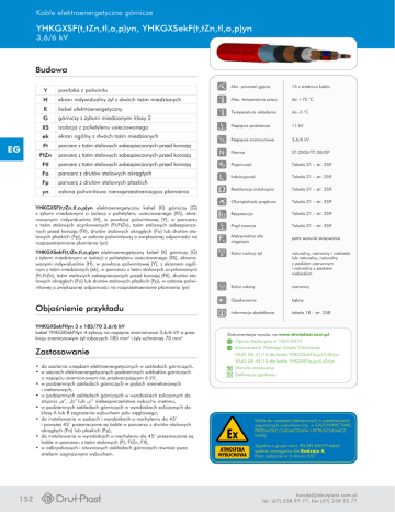 Kable elektroenergetyczne górnicze YHKGXSF(t,tZn,tl,o,p)yn, YHKGXSekF(t,tZn,tl,o,p)yn 3,6/6 kV Budowa EG Min. promień gięcia 15 x średnica kabla Max. temperatura pracy do +70 °C Temperatura układania do -5 °C Napięcie probiercze 11 kV Napięcie znamionowe 3,6/6 kV pancerz z taśm stalowych zabezpieczonych przed korozją Norma ST-2005/TT-28/DP Ftl pancerz z taśm stalowych zabezpieczonych przed korozją Pojemność Tabela 21 – str. 259 Fo pancerz z drutów stalowych okrągłych Indukcyjność Tabela 21 – str. 259 Fp pancerz z drutów stalowych płaskich yn osłona polwinitowa nierozprzestrzeniająca płomienia Reaktancja indukcyjna Tabela 21 – str. 259 Obciążalność prądowa Tabela 21 – str. 259 Rezystancja Tabela 21 – str. 259 Prąd zwarcia Tabela 21 – str. 259 Maksymalna siła ciągnąca patrz warunki stosowania Y powłoka z polwinitu H ekran indywidualny żył z dwóch taśm miedzianych K kabel elektroenergetyczny G górniczy z żyłami miedzianymi klasy 2 XS izolacja z polietylenu usieciowanego ek ekran ogólny z dwóch taśm miedzianych Ft pancerz z taśm stalowych zabezpieczonych przed korozją FtZn YHKGXSF(t,tZn,tl,o,p)yn elektroenergetyczny kabel (K) górniczy (G) z żyłami miedzianymi o izolacji z polietylenu usieciowanego (XS), ekranowanymi indywidualnie (H), w powłoce polwinitowej (Y), w pancerzu z taśm stalowych ocynkowanych (Ft,FtZn), taśm stalowych zabezpieczonych przed korozją (Ftl), drutów stalowych okrągłych (Fo) lub drutów stalowych płaskich (Fp), w osłonie polwinitowej o zwiększonej odporności na rozprzestrzenianie płomienia (yn) YHKGXSekF(t,tZn,tl,o,p)yn elektroenergetyczny kabel (K) górniczy (G) z żyłami miedzianymi o izolacji z polietylenu usieciowanego (XS), ekranowanymi indywidualnie (H), w powłoce polwinitowej (Y), z ekranem ogólnym z taśm miedzianych (ek), w pancerzu z taśm stalowych ocynkowanych (Ft,FtZn), taśm stalowych zabezpieczonych przed korozją (Ftl), drutów stalowych okrągłych (Fo) lub drutów stalowych płaskich (Fp), w osłonie polwinitowej o zwiększonej odporności na rozprzestrzenianie płomienia (yn) Objaśnienie przykładu YHKGXSekFtlyn 3 x 185/70 3,6/6 kV kabel YHKGXSekFtlyn 4-żyłowy na napięcie znamionowe 3,6/6 kV o przekroju znamionowym żył roboczych 185 mm2 i żyły ochronnej 70 mm2 Zastosowanie • do zasilania urządzeń elektroenergetycznych w zakładach górniczych, • w sieciach elektroenergetycznych podziemnych zakładów górniczych o napięciu znamionowym nie przekraczającym 6 kV, • w podziemnych zakładach górniczych w polach niemetanowych i metanowych, • w podziemnych zakładach górniczych w wyrobiskach zaliczanych do stopnia „a”, „b” lub „c” niebezpieczeństwa wybuchu metanu, • w podziemnych zakładach górniczych w wyrobiskach zaliczanych do klasy A lub B zagrożenia wybuchem pyłu węglowego, • do instalowania w szybach i wyrobiskach o nachyleniu do 45° i powyżej 45° przeznaczone są kable w pancerzu z drutów stalowych okrągłych (Fo) lub płaskich (Fp), • do instalowania w wyrobiskach o nachyleniu do 45° przeznaczone są kable w pancerzu z taśm stalowych (Ft, FtZn, Ftl), • w odkrywkowych i otworowych zakładach górniczych również poza strefami zagrożonymi wybuchem. 152 Kolor izolacji żył naturalny, czerwony i niebieski lub naturalny, naturalny z paskiem czerwonym i naturalny z paskiem niebieskim Kolor osłony czerwony Opakowanie bębny informacja dodatkowa tabela 18 – str. 258 Dokumentacja wyrobu na www.drutplast.com.pl Opinia Atestacyjna nr 1851/2010 Dopuszczenie Wyższego Urzędu Górniczego WUG GE-41/10 dla kabla YHKGXSekF(o,p,t,tl,tZn)yn WUG GE-49/10 dla kabla YHKGXSF(o,p,t,tl,tZn)yn Warunki stosowania Deklaracja zgodności Ex ATMOSFERA WYBUCHOWA Kable do urządzeń elektrycznych w przestrzeniach zagrożonych wybuchem (np. w GAZOWNICTWIE, PRZEMYŚLE CHEMICZNYM I PETROCHEMICZNYM). Zgodnie z grupa norm PN-EN 60079 kabel spełnia wymagania dla Rodzaju A. Patrz załącznik nr 3 strona 270 [email protected] tel. (67) 258 97 77, fax (67) 258 95 77 Kable elektroenergetyczne górnicze YHKGXSF(t,tZn,tl,o,p)yn, YHKGXSekF(t,tZn,tl,o,p)yn 3,6/6 kV Ilość i przekrój znamionowy żył oraz najmniejszy dopuszczalny przekrój żyły ochronnej n x mm2/mm2 Średnica zewn. obl. mm Masa kabla (netto) kg/km YHKGXSF(t,tZn,tl)yn 3,6/6 kV Średnica zewn. obl. mm Masa kabla (netto) kg/km Długość nominalna odcinków kabla m YHKGXSekF(t,tZn,tl)yn 3,6/6 kV 3 x 16/16 32,9 1 777 36,8 2 227 500 3 x 25/16 35,4 2 175 39,3 2 659 500 3 x 35/16 38,0 2 607 41,8 3 123 500 3 x 50/16 41,2 3 228 45,1 3 785 500 3 x 70/16 45,1 4 053 49,8 4 933 500 3 x 95/16 50,1 5 311 53,9 5 995 500 3 x 120/16 53,3 6 257 57,1 6 982 500 3 x 150/25 57,2 7 499 61,0 8 274 500 3 x 185/25 61,5 8 846 65,4 9 679 500 3 x 240/25 67,5 10 932 72,7 12 441 500 3 x 300/25 75,0 13 881 78,8 14 904 500 Średnica zewn. obl. mm Masa kabla (netto) kg/km Średnica zewn. obl. mm Masa kabla (netto) kg/km Długość nominalna odcinków kabla m Ilość i przekrój znamionowy żył oraz najmniejszy dopuszczalny przekrój żyły ochronnej n x mm2/mm2 YHKGXSFoyn 3,6/6 kV YHKGXSekFoyn 3,6/6 kV 3 x 16/16 35,1 2 418 39,8 3 214 500 3 x 25/16 38,4 3 127 42,3 3 714 500 3 x 35/16 41,0 3 627 44,8 4 246 500 3 x 50/16 44,2 4 334 48,0 4 995 500 3 x 70/16 48,1 5 263 53,0 6 428 500 3 x 95/16 53,3 6 815 57,1 7 614 500 3 x 120/16 56,5 7 857 60,4 8 699 500 3 x 150/25 60,4 9 216 64,2 10 107 500 3 x 185/25 64,8 10 695 68,6 11 643 500 3 x 240/25 70,7 12 960 76,0 14 838 500 3 x 300/25 78,3 16 355 82,2 17 505 500 Średnica zewn. obl. mm Masa kabla (netto) kg/km Średnica zewn. obl. mm Masa kabla (netto) kg/km Długość nominalna odcinków kabla m Ilość i przekrój znamionowy żył oraz najmniejszy dopuszczalny przekrój żyły ochronnej n x mm2/mm2 YHKGXSFpyn 3,6/6 kV YHKGXSekFpyn 3,6/6 kV 3 x 16/16 33,3 1 953 37,2 2 425 500 3 x 25/16 35,9 2 366 39,7 2 870 500 3 x 35/16 38,4 2 812 42,3 3 349 500 3 x 50/16 41,6 3 450 45,5 4 029 500 3