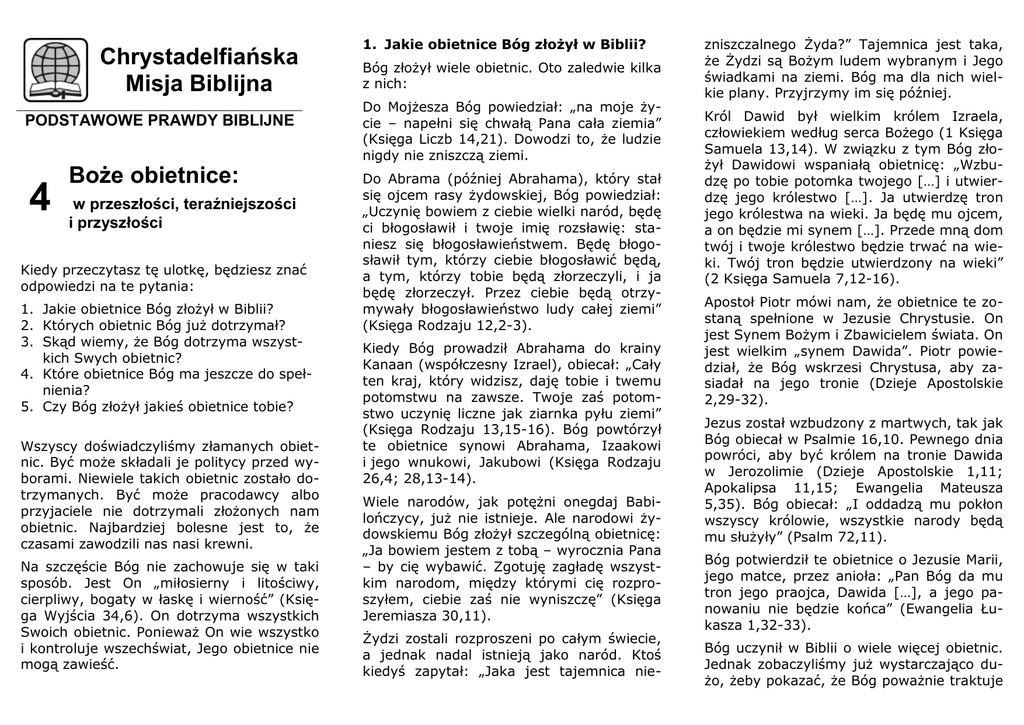 Chrystadelfiańska Misja Biblijna PODSTAWOWE PRAWDY BIBLIJNE 4 Boże obietnice: w przeszłości, teraźniejszości i przyszłości Kiedy przeczytasz tę ulotkę, będziesz znać odpowiedzi na te pytania: 1. Jakie obietnice Bóg złożył w Biblii? 2. Których obietnic Bóg już dotrzymał? 3. Skąd wiemy, że Bóg dotrzyma wszystkich Swych obietnic? 4. Które obietnice Bóg ma jeszcze do spełnienia? 5. Czy Bóg złożył jakieś obietnice tobie? Wszyscy doświadczyliśmy złamanych obietnic. Być może składali je politycy przed wyborami. Niewiele takich obietnic zostało dotrzymanych. Być może pracodawcy albo przyjaciele nie dotrzymali złożonych nam obietnic. Najbardziej bolesne jest to, że czasami zawodzili nas nasi krewni. Na szczęście Bóg nie zachowuje się w taki sposób. Jest On „miłosierny i litościwy, cierpliwy, bogaty w łaskę i wierność” (Księga Wyjścia 34,6). On dotrzyma wszystkich Swoich obietnic. Ponieważ On wie wszystko i kontroluje wszechświat, Jego obietnice nie mogą zawieść. 1. Jakie obietnice Bóg złożył w Biblii? Bóg złożył wiele obietnic. Oto zaledwie kilka z nich: Do Mojżesza Bóg powiedział: „na moje życie – napełni się chwałą Pana cała ziemia” (Księga Liczb 14,21). Dowodzi to, że ludzie nigdy nie zniszczą ziemi. Do Abrama (później Abrahama), który stał się ojcem rasy żydowskiej, Bóg powiedział: „Uczynię bowiem z ciebie wielki naród, będę ci błogosławił i twoje imię rozsławię: staniesz się błogosławieństwem. Będę błogosławił tym, którzy ciebie błogosławić będą, a tym, którzy tobie będą złorzeczyli, i ja będę złorzeczył. Przez ciebie będą otrzymywały błogosławieństwo ludy całej ziemi” (Księga Rodzaju 12,2-3). Kiedy Bóg prowadził Abrahama do krainy Kanaan (współczesny Izrael), obiecał: „Cały ten kraj, który widzisz, daję tobie i twemu potomstwu na zawsze. Twoje zaś potomstwo uczynię liczne jak ziarnka pyłu ziemi” (Księga Rodzaju 13,15-16). Bóg powtórzył te obietnice synowi Abrahama, Izaakowi i jego wnukowi, Jakubowi (Księga Rodzaju 26,4; 28,13-14). Wiele narodów, jak potężni onegdaj Babilończycy, już nie istnieje. Ale narodowi żydowskiemu Bóg złożył szczególną obietnicę: „Ja bowiem jestem z tobą – wyrocznia Pana – by cię wybawić. Zgotuję zagładę wszystkim narodom, między którymi cię rozproszyłem, ciebie zaś nie wyniszczę” (Księga Jeremiasza 30,11). Żydzi zostali rozproszeni po całym świecie, a jednak nadal istnieją jako naród. Ktoś kiedyś zapytał: „Jaka jest tajemnica nie- zniszczalnego Żyda?” Tajemnica jest taka, że Żydzi są Bożym ludem wybranym i Jego świadkami na ziemi. Bóg ma dla nich wielkie plany. Przyjrzymy im się później. Król Dawid był wielkim królem Izraela, człowiekiem według serca Bożego (1 Księga Samuela 13,14). W związku z tym Bóg złożył Dawidowi wspaniałą obietnicę: „Wzbudzę po tobie potomka twojego […] i utwierdzę jego królestwo […]. Ja utwierdzę tron jego królestwa na wieki. Ja będę mu ojcem, a on będzie mi synem […]. Przede mną dom twój i twoje królestwo będzie trwać na wieki. Twój tron będzie utwierdzony na wieki” (2 Księga Samuela 7,12-16). Apostoł Piotr mówi nam, że obietnice te zostaną spełnione w Jezusie Chrystusie. On jest Synem Bożym i Zbawicielem świata. On jest wielkim „synem Dawida”. Piotr powiedział, że Bóg wskrzesi Chrystusa, aby zasiadał na jego tronie (Dzieje Apostolskie 2,29-32). Jezus został wzbudzony z martwych, tak jak Bóg obiecał w Psalmie 16,10. Pewnego dnia powróci, aby być królem na tronie Dawida w Jerozolimie (Dzieje Apostolskie 1,11; Apokalipsa 11,15; Ewangelia Mateusza 5,35). Bóg obiecał: „I oddadzą mu pokłon wszyscy królowie, wszystkie narody będą mu służyły” (Psalm 72,11). Bóg potwierdził te obietnice o Jezusie Marii, jego matce, przez anioła: „Pan Bóg da mu tron jego praojca, Dawida […], a jego panowaniu nie będzie końca” (Ewangelia Łukasza 1,32-33). Bóg uczynił w Biblii o wiele więcej obietnic. Jednak zobaczyliśmy już wystarczająco dużo, żeby pokazać, że Bóg poważnie traktuje Swoje przyszłe plany dla ziemi i dla Abrahama, Izaaka, Jakuba, Dawida, Jezusa oraz Żydów. 2. Których obietnic Bóg już dotrzymał? Boża obietnica złożona Abrahamowi, Izaakowi i Jakubowi, że Izrael stanie się wielkim narodem, została dotrzymana. Bóg dotrzymał także Swej obietnicy dla Żydów, że nigdy nie wyginą pomimo strasznych prześladowań. Jezus Chrystus został wskrzeszony z martwych, dokładnie tak jak Bóg obiecał. Bóg ma jednak nadal kilka ważnych obietnic do spełnienia. 3. Skąd wiemy, że Bóg dotrzyma wszystkich Swych obietnic? Wiemy o tym z dwóch bardzo dobrych powodów: (a) Każda obietnica, jaką Bóg kiedykolwiek uczynił, odnosząca się do przeszłości, została dotrzymana. Daje nam to pewność, że dotrzyma On także i tych, które dotyczą przyszłości. (b) Boża moc góruje nad wszystkim. Nic nie może pokrzyżować Jego przyszłych planów. 4. Które obietnice Bóg ma jeszcze do spełnienia? Abraham jeszcze nie odziedziczył ziemi Izraela na wieczne posiadanie. Ani nie zostały jeszcze wszystkie narody na ziemi pobłogosławione w Abrahamie. List do Hebrajczyków 11,13 mówi, że Abraham, Izaak i Jakub „w wierze pomarli […] wszyscy, nie osiągnąwszy tego, co im przyrzeczono”. Czyżby więc było za późno? Nie. Bóg wskrzesi ich z martwych, tak samo jak wskrzesił Jezusa. Wtedy Bóg spełni wobec nich Swe obietnice. Sam Jezus powiedział, że Abraham, Izaak i Jakub będą w królestwie Bożym (Ewangelia Łukasza 13,28). Jezus nie został jeszcze królem, zasiadającym na tronie Dawida. Ale tak się stanie, kiedy powróci na ziemię (Dzieje Apostolskie 3,19-21). Żydzi nadal istnieją jako naród. Są z powrotem w Izraelu, ziemi, którą Bóg obiecał Abrahamowi. To jest pierwsza faza rozwoju Bożego planu dla nich, poniewa