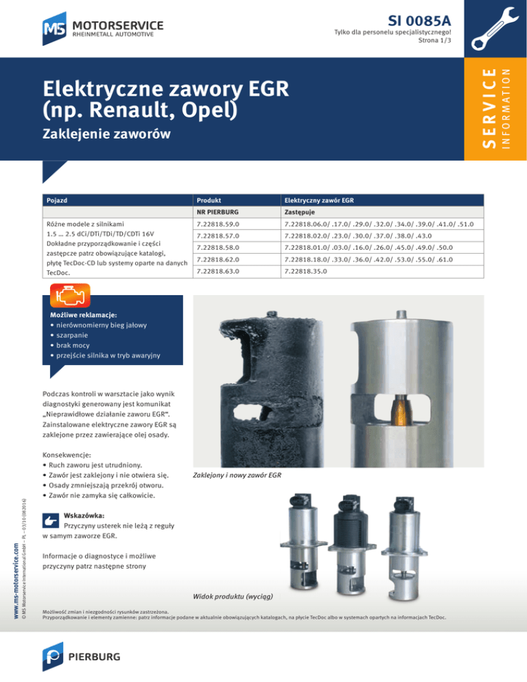 SI 0085A Tylko dla personelu specjalistycznego! Strona 1/3 Elektryczne zawory EGR (np. Renault, Opel) Zaklejenie zaworów Pojazd Różne modele z silnikami 1.5 … 2.5 dCi/DTi/TDi/TD/CDTi 16V Dokładne przyporządkowanie i części zastępcze patrz obowiązujące katalogi, płytę TecDoc-CD lub systemy oparte na danych TecDoc. Produkt Elektryczny zawór EGR NR PIERBURG Zastępuje 7.22818.59.0 7.22818.06.0/ .17.0/ .29.0/ .32.0/ .34.0/ .39.0/ .41.0/ .51.0 7.22818.57.0 7.22818.02.0/ .23.0/ .30.0/ .37.0/ .38.0/ .43.0 7.22818.58.0 7.22818.01.0/ .03.0/ .16.0/ .26.0/ .45.0/ .49.0/ .50.0 7.22818.62.0 7.22818.18.0/ .33.0/ .36.0/ .42.0/ .53.0/ .55.0/ .61.0 7.22818.63.0 7.22818.35.0 Możliwe reklamacje: •nierównomierny bieg jałowy •szarpanie •brak mocy •przejście silnika w tryb awaryjny www.ms-motorservice.com © MS Motorservice International GmbH – PL – 03/10 (082016) Podczas kontroli w warsztacie jako wynik diagnostyki generowany jest komunikat „Nieprawidłowe działanie zaworu EGR“. Zainstalowane elektryczne zawory EGR są zaklejone przez zawierające olej osady. Konsekwencje: •Ruch zaworu jest utrudniony. •Zawór jest zaklejony i nie otwiera się. •Osady zmniejszają przekrój otworu. •Zawór nie zamyka się całkowicie. Zaklejony i nowy zawór EGR Wskazówka: Przyczyny usterek nie leżą z reguły w samym zaworze EGR. Informacje o diagnostyce i możliwe przyczyny patrz następne strony Widok produktu (wyciąg) Możliwość zmian i niezgodności rysunków zastrzeżona. Przyporządkowanie i elementy zamienne: patrz informacje podane w aktualnie obowiązujących katalogach, na płycie TecDoc albo w systemach opartych na informacjach TecDoc. SI 0085A Tylko dla personelu specjalistycznego! Strona 2/3 Możliwe przyczyny Nietypowo silne osady mogą mieć kilka przyczyn: •Silnie zanieczyszczone olejem powietrze zasysane i doładowujące •Niedokładne, nieczyste spalanie •Błąd w systemie zarządzania silnikiem •Nieprawidłowa wersja oprogramowania sterownika silnika •Częsta jazda po krótkich odcinkach (zwłaszcza w czasie zimnych pór roku – powstawanie emulsji wodno-olejowej dostającej się do układu odpowietrzania silnika) W systemie OBD błędy tego rodzaju są rozpoznawane tylko częściowo i niekiedy nieprawidłowo przyporządkowywane. Możliwe kody błędów w systemie EOBD to: P0172 Za bogata mieszanka – rząd cylindrów 1 P0175 Za uboga mieszanka – rząd cylindrów 2 P0400 Recyrkulacja spalin – wadliwy współczynnik przepływu P0401 Recyrkulacja spalin – zarejestrowano niedostateczny współczynnik przepływu P0402 Recyrkulacja spalin – zarejestrowano nadmierny współczynnik przepływu P0403 Recyrkulacja spalin – wadliwe działanie obwodu elektrycznego P0404 Recyrkulacja spalin – błąd zakresu/działania Możliwe kody błędów firmy Renault to: DF077 DF084 DF241 www.ms-motorservice.com © MS Motorservice International GmbH – PL – 03/10 (082016) Wskazówka: Znaczna zawartość sadzy w spalinach silników dieslowskich zwiększa intensywność osadów. Przyczynami zanieczyszczenia powietrza zasysanego lub doładowującego olejem mogą być na przykład: •Awarie odpowietrzacza skrzyni korbowej (np. oddzielacza oleju, zaworu odpowietrzającego silnika) •Nadmierny wydech gazów przedmuchowych1 z powodu nadmiernego zużycia tłoków i cylindrów •Usterki turbosprężarki (np. zużyte łożyska, zatkany przewód przepływu wstecznego oleju) •Niezachowanie terminów przeglądów (wadliwa wymiana oleju i filtra oleju) •Używanie olejów silnikowych o nieodpowiedniej jakości •Zbyt wysoki poziom oleju silnikowego •Zużyte uszczelki zaworów lub prowadnice powodujące nadmierny transfer oleju do kanału ssącego Zawór EGR w pojeździe Renault Master JD1M (podkreślony) Gazy przedmuchowe: Przedmuchiwany gaz, który przy normalnym spalaniu przedostaje się przez zespół pierścieni tłokowych do skrzyni korbowej. Dzięki systemowi odpowietrzania obudowy wału korbowego gazy te odprowadzane są do spalania w silniku. 1 SI 0085A Tylko dla personelu specjalistycznego! Strona 3/3 Wskazówki diagnostyczne W przypadku usterek, nieprawidłowego działania i uszkodzeń systemu EGR należy oprócz komponentów układu EGR sprawdzić również elementy znajdujące się w jego otoczeniu. 6 5 Wskazówka: Błędy czujników mogą spowodować nieprawidłowości w działaniu systemu recyrkulacji spalin. W przypadku wymienionych tutaj zaworów EGR najczęstszymi przyczynami usterek są osady nagromadzone na talerzu lub w gnieździe zaworu. Zawór EGR należy sprawdzić i w razie potrzeby wymienić. Odradzamy próby wyczyszczenia zaworu EGR; może to spowodować jego uszkodzenie. Szybka kontrola •Odłączyć wtyczkę od zaworu EGR •Zmierzyć napięcie na wtyczce między pinem 5 i masą pojazdu. Wartość zadana: wartość napięcia akumulatora •Podłączyć do pinów 1 i 5 napięcie stałe 12 V i na zmianę włączać je i wyłączać www.ms-motorservice.com © MS Motorservice International GmbH – PL – 03/10 (082016) Nie łączyć układu zasilania napięciem z pinami 2 do 4. 4 2 1 1 2 4 5 masa sterowana zasilanie napięciem masa zasilanie napięciem 6 sygnał ślizgacza cewka potencjometr (+ 5 V) potencjometr cewka (napięcie instalacji elektrycznej) potencjometr Funkcje pinów wtyczki (widok zaworu EGR) Kontrola sygnału EGR ze sterownika •Wtyczka podłączona •Silnik rozgrzany do temperatury roboczej i na biegu jałowym •Zmierzyć napięcie między pinami 1 i 5. Wartość zadana: 0 V na biegu jałowym •Nacisnąć pedał gazu, musi to spowodować wzrost napięcia. Wartość zadana: do ok. 5 V Jeżeli wartość zadana nie została osiągnięta, odszukać błąd na podstawie schematu instalacji elektrycznej dostarczonego przez producenta pojazdu. Wskazówka: W wielu przypadkach problemy związane z zaklejeniem zaworu może zlikwidować aktualizacja oprogramowania sterownika. Kontrola napięcia ślizgacza między potencjometre