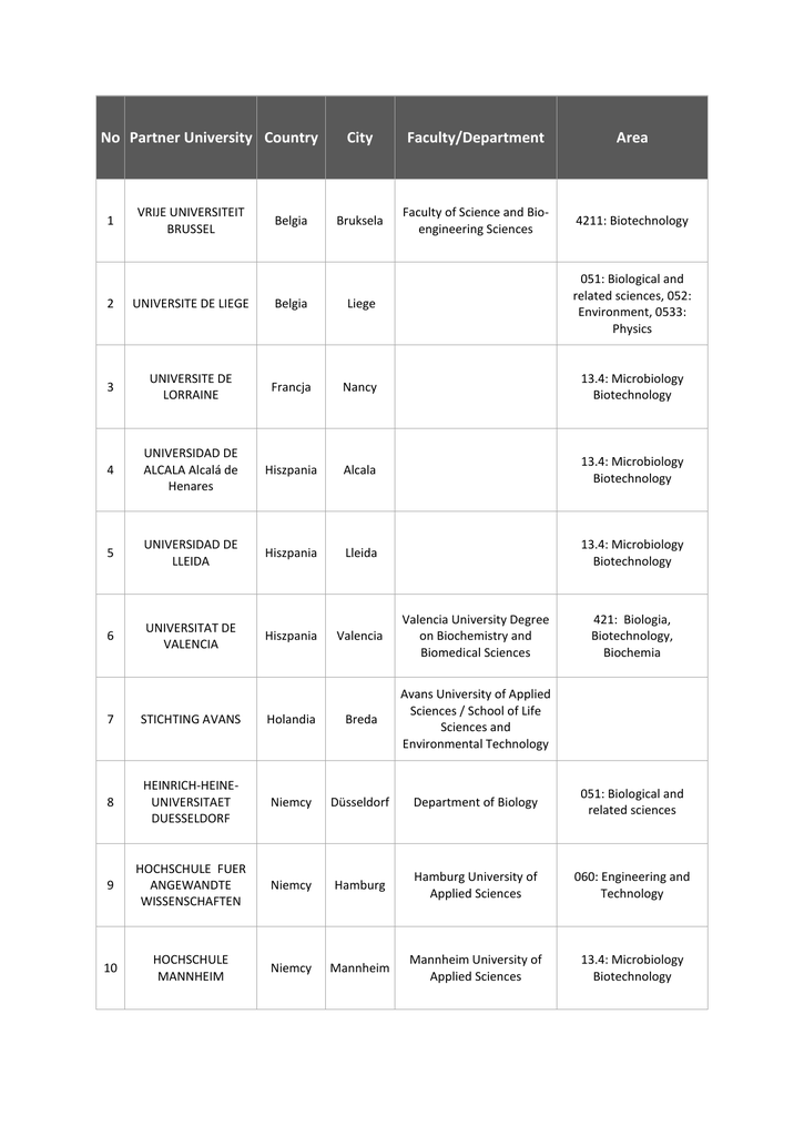 Partner University Wydziały Dyscypliny