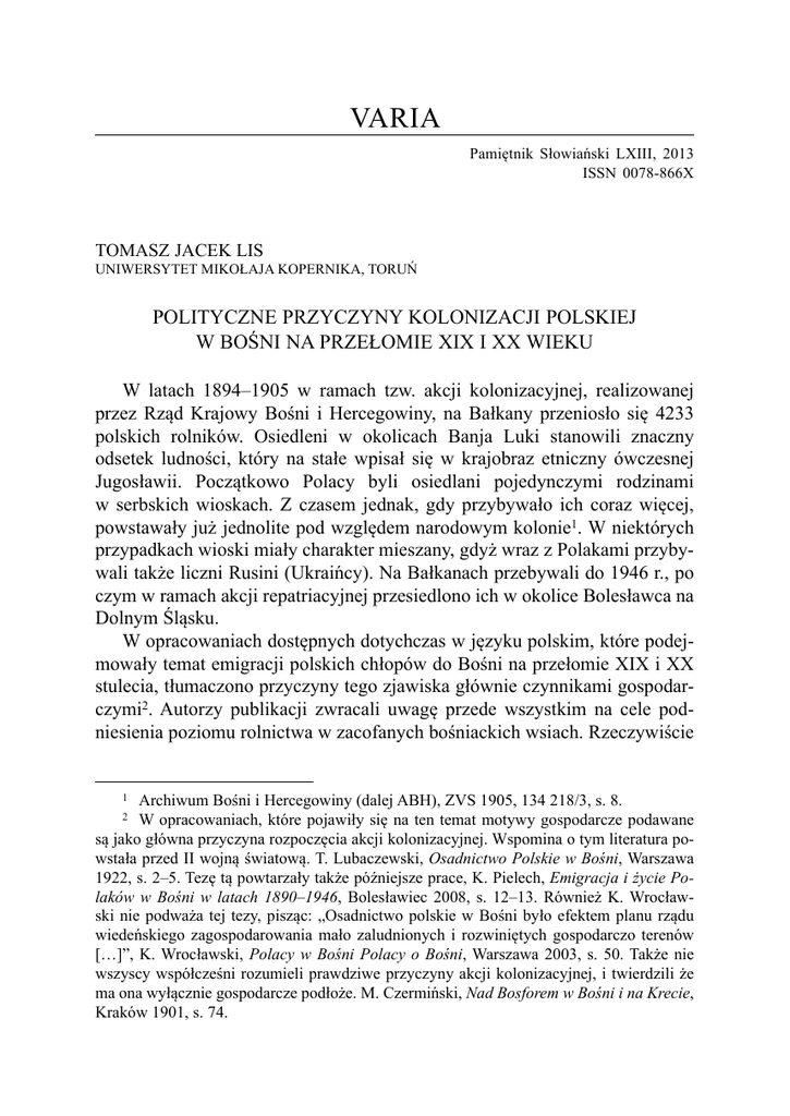 VARIA Pamiętnik Słowiański LXIII, 2013 ISSN 0078-866X TOMASZ JACEK LIS UNIWERSYTET MIKOŁAJA KOPERNIKA, TORUŃ POLITYCZNE PRZYCZYNY KOLONIZACJI POLSKIEJ W BOŚNI NA PRZEŁOMIE XIX I XX WIEKU W latach 1894–1905 w ramach tzw. akcji kolonizacyjnej, realizowanej przez Rząd Krajowy Bośni i Hercegowiny, na Bałkany przeniosło się 4233 polskich rolników. Osiedleni w okolicach Banja Luki stanowili znaczny odsetek ludności, który na stałe wpisał się w krajobraz etniczny ówczesnej Jugosławii. Początkowo Polacy byli osiedlani pojedynczymi rodzinami w serbskich wioskach. Z czasem jednak, gdy przybywało ich coraz więcej, powstawały już jednolite pod względem narodowym kolonie1. W niektórych przypadkach wioski miały charakter mieszany, gdyż wraz z Polakami przybywali także liczni Rusini (Ukraińcy). Na Bałkanach przebywali do 1946 r., po czym w ramach akcji repatriacyjnej przesiedlono ich w okolice Bolesławca na Dolnym Śląsku. W opracowaniach dostępnych dotychczas w języku polskim, które podejmowały temat emigracji polskich chłopów do Bośni na przełomie XIX i XX stulecia, tłumaczono przyczyny tego zjawiska głównie czynnikami gospodarczymi2. Autorzy publikacji zwracali uwagę przede wszystkim na cele podniesienia poziomu rolnictwa w zacofanych bośniackich wsiach. Rzeczywiście Archiwum Bośni i Hercegowiny (dalej ABH), ZVS 1905, 134 218/3, s. 8. W opracowaniach, które pojawiły się na ten temat motywy gospodarcze podawane są jako główna przyczyna rozpoczęcia akcji kolonizacyjnej. Wspomina o tym literatura powstała przed II wojną światową. T. Lubaczewski, Osadnictwo Polskie w Bośni, Warszawa 1922, s. 2–5. Tezę tą powtarzały także późniejsze prace, K. Pielech, Emigracja i życie Polaków w Bośni w latach 1890–1946, Bolesławiec 2008, s. 12–13. Również K. Wrocławski nie podważa tej tezy, pisząc: „Osadnictwo polskie w Bośni było efektem planu rządu wiedeńskiego zagospodarowania mało zaludnionych i rozwiniętych gospodarczo terenów […]”, K. Wrocławski, Polacy w Bośni Polacy o Bośni, Warszawa 2003, s. 50. Także nie wszyscy współcześni rozumieli prawdziwe przyczyny akcji kolonizacyjnej, i twierdzili że ma ona wyłącznie gospodarcze podłoże. M. Czermiński, Nad Bosforem w Bośni i na Krecie, Kraków 1901, s. 74. 1 2 152 VARIA Polacy, podobnie jak inni nowo przybyli osadnicy, pełnili rolę „edukatorów” wśród miejscowej ludności. Jest to fakt niezaprzeczalny, potwierdzony przez wiele źródeł3. Niemniej jednak unowocześnienie miejscowego rolnictwa poprzez wprowadzenie nowych technik rolniczych, zastosowanie bardziej wytrzymałych i innowacyjnych narzędzi pracy, a wreszcie bardziej ekonomiczną hodowlę bydła, dzięki wprowadzeniu zagród było niejako „skutkiem ubocznym”, a nie najważniejszym, jak się powszechnie przyjmuje, powodem osiedlania kolonistów w Bośni. Tym samym modernizacja wsi wynikająca z ich obecności, choć nie stanowiła zaskoczenia dla władz i była raczej przewidziana, nie była głównym powodem ich przybycia na Bałkany. Teza ta nie powinna być zaskoczeniem dla historyków interesujących się polityką gospodarczą Austro-Węgier w Bośni za czasów okupacji tej byłej tureckiej prowincji. Jest to jednak temat dość niszowy i zanim przejdę do zaprezentowania najważniejszych czynników, które miały wpływ na decyzję o przyjęciu tysięcy Polaków oraz chłopów z innych prowincji Monarchii i nie tylko, poświęcę kilka słów wyjaśnieniu sytuacji wsi bośniackiej za czasów austriackiej okupacji. Powszechnie przyjętą opinią, która ma uzasadnienie w źródłach, jest niebywały wzrost poziomu gospodarki i infrastruktury Bośni za czasów okupacji. Z opinią tą nie sposób się nie zgodzić, choć w Polsce nie posiadamy odpowiedniego opracowania dotyczącego tamtego okresu jej dziejów. Jugosłowiańska historiografia dostarcza nam jednak ogromną liczbę publikacji opisujących wzrost poziomu życia, a także ogólny rozwój kraju4. Potwierdzają to także relacje Polaków zamieszkujących wówczas tamte tereny, bądź przebywających tam w ramach podróży5. 3 Archiwum Generalne Zgromadzenia Sióstr Felicjanek w Rzymie (AGSF) 12.06.1903, 2173/903, s. 23. Por. ABH, ZVS, 1905, 134 218/3, s. 7. Archiwum Towarzystwa Jezusowego w Krakowie (ATJKr), List s. Odrzywolskiej do Marcina Czermińskiego, 17.08.1903, 271/III. 4 Por. H. Kreševljaković, Sarajevo za vrijeme Austrougarske uprave, Sarajevo 1969, lub z nowszych prac M. Bojić, Historija Bosne i Bosnjaka, Sarajevo 2001. S. 129–154. 5 W Bośni poza chłopami przebywało także kilka tysięcy przedstawicieli polskiej inteligencji, która pełniła funkcje państwowe w administracji, sądach, radach miejskich. Wielu absolwentów wyższych szkół z Krakowa i Lwowa pracowało w bośniackiej służbie zdrowia zajmując tam najwyższe stanowiska (J. Albin, Polacy w Jugosławii, Lublin 1983, s. 26). Pierwszymi kobietami lekarkami, pracującymi z muzułmankami były polskie lekarki Teodora Krajewska, Jadwiga Olszewska i Bronisława Prasek-Całczyńska (D. S. Kastratović, Istorija medicine požarevačkog okruga (1822–1914), Požarevac 1991, s. 132). Polacy w znaczny sposób przyczynili się do modernizacji Bośni i Hercegowiny, por. D. J. Gregorczyk, Polscy urzędnicy w administracji Bośni i Hercegowiny w latach 1879–1914, „Rocznik Administracji i Prawa”, r. 10, 2010, s. 88–111. VARIA 153 Modernizacja kraju była dla władz cesarskich sprawą priorytetową. Skoro chciano czerpać realne korzyści z okupacji tej byłej tureckiej prowincji, a następnie włączyć ją w granice Monarchii, należało wpierw wprowadzić szereg reform. W efekcie tych działań, w stosunkowo krótkim czasie, zacofany, tkwiący w feudalizmie kraj zmienił się nie do poznania. Już pod koniec stulecia mógł pochwalić się jednym z najnowocześniejszych szpitali specjalistycznych na Bałkanach, a także ciągle rozrastającą się s