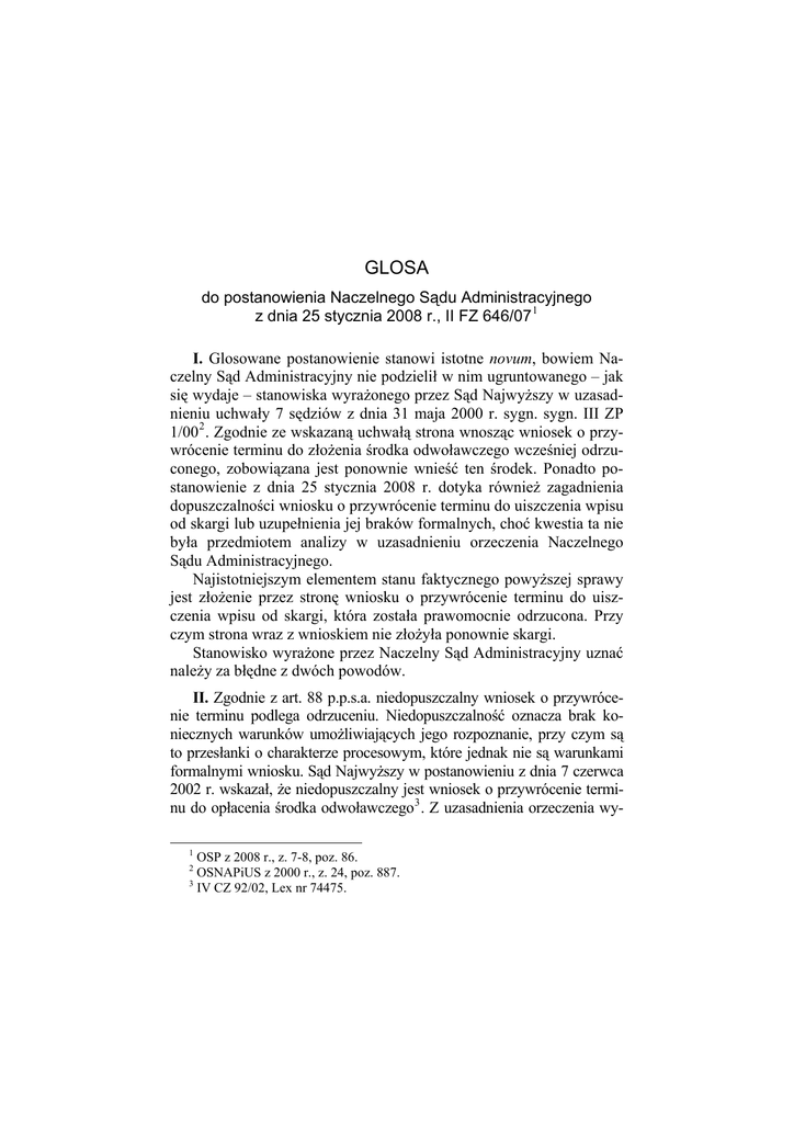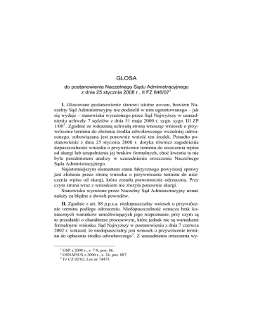 GLOSA do postanowienia Naczelnego Sądu Administracyjnego z dnia 25 stycznia 2008 r., II FZ 646/07 1 I. Glosowane postanowienie stanowi istotne novum, bowiem Naczelny Sąd Administracyjny nie podzielił w nim ugruntowanego – jak się wydaje – stanowiska wyrażonego przez Sąd Najwyższy w uzasadnieniu uchwały 7 sędziów z dnia 31 maja 2000 r. sygn. sygn. III ZP 1/00 2 . Zgodnie ze wskazaną uchwałą strona wnosząc wniosek o przywrócenie terminu do złożenia środka odwoławczego wcześniej odrzuconego, zobowiązana jest ponownie wnieść ten środek. Ponadto postanowienie z dnia 25 stycznia 2008 r. dotyka również zagadnienia dopuszczalności wniosku o przywrócenie terminu do uiszczenia wpisu od skargi lub uzupełnienia jej braków formalnych, choć kwestia ta nie była przedmiotem analizy w uzasadnieniu orzeczenia Naczelnego Sądu Administracyjnego. Najistotniejszym elementem stanu faktycznego powyższej sprawy jest złożenie przez stronę wniosku o przywrócenie terminu do uiszczenia wpisu od skargi, która została prawomocnie odrzucona. Przy czym strona wraz z wnioskiem nie złożyła ponownie skargi. Stanowisko wyrażone przez Naczelny Sąd Administracyjny uznać należy za błędne z dwóch powodów. II. Zgodnie z art. 88 p.p.s.a. niedopuszczalny wniosek o przywrócenie terminu podlega odrzuceniu. Niedopuszczalność oznacza brak koniecznych warunków umożliwiających jego rozpoznanie, przy czym są to przesłanki o charakterze procesowym, które jednak nie są warunkami formalnymi wniosku. Sąd Najwyższy w postanowieniu z dnia 7 czerwca 2002 r. wskazał, że niedopuszczalny jest wniosek o przywrócenie terminu do opłacenia środka odwoławczego3 . Z uzasadnienia orzeczenia wy1 OSP z 2008 r., z. 7-8, poz. 86. OSNAPiUS z 2000 r., z. 24, poz. 887. 3 IV CZ 92/02, Lex nr 74475. 2 Dorota Lebowa nika, że opłacenie środka odwoławczego nie będzie stanowiło odrębnej czynności w rozumieniu art. 87 § 4 p.p.s.a., gdyż jest jej częścią – immanentnym elementem prawidłowego wniesienia środka zaskarżenia. Ponieważ nie sposób wyodrębnić i nadać samoistny charakter obu czynnościom procesowym np. wniesieniu zażalenia i jego opłaceniu, to uzasadniona jest teza, że nie może być skutecznie wniesiony wniosek o przywrócenie terminu do uiszczenia opłaty od środka odwoławczego. Takie żądanie, jako niedopuszczalne podlega odrzuceniu. Ten sam skutek w postaci odrzucenia –spowoduje wniosek o przywrócenie terminu do usunięcia braków formalnych środka odwoławczego. Nie sposób przecież uznać za odrębne czynności w toku postępowania sądowoadministracyjnego np. wniesienie zażalenia i złożenia jego odpisu. Pismo procesowe, w którym strona uzupełnia braki formalne środka odwoławczego (np. wskazanie czy domaga się zmiany czy uchylenia zaskarżonego orzeczenia) samo może być dotknięte brakiem formalnym (najczęstsze to brak podpisu strony lub brak odpisu) i w konsekwencji spowodować odrzucenie tego środka. Pismo to nie będzie jednak stanowiło samoistnej czynności procesowej, której może dotyczyć wniosek o przywrócenie terminu. Prezentowany pogląd Sądu Najwyższego jest w pełni zasadny, wymaga jednak uzupełnienia. Otóż wniosek o przywrócenie terminu do usunięcia braków formalnych środka odwoławczego (lub o przywrócenie terminu do uiszczenia wpisu) będzie niedopuszczalny tylko wówczas, gdy wydane zostało już postanowienie o odrzuceniu tego środka. Bez znaczenia jest przy tym, czy postanowienie takie jest już prawomocne, czy nie jest. Wcześniej zanim takie postanowienie zostanie wydane przez sąd z powodu nie uzupełnienia w terminie braków formalnych zażalenia, bądź z powodu jego nieopłacenia, wniosek o przywrócenie terminu do uzupełnienia braków formalnych zażalenia lub też do jego opłacenia jest jak najbardziej dopuszczalny4 . Jak wyżej wskazano w takiej sytuacji sąd w pierwszej kolejności rozpozna wniosek o przywrócenie terminu, a dopiero w dalszej kolejności w przypadku uprawomocniania się postanowienia o jego oddaleniu, orzeknie o odrzuceniu środka odwoławczego. Jeżeli natomiast wydane zostało już orzeczenie o odrzuceniu zażalenia 4 Uzasadnienie postanowienia Sądu Okręgowego w Lublinie z dnia 27 września 2006 r., II Cz 970/06, niepubl. 238 Glosa do postanowienia NSA z dnia 25 stycznia 2008 r., II FZ 646/07 z powodu jego nieopłacenia lub też nie uzupełnienia w wyznaczonym terminie jego braków formalnych, aktualizuje się możliwość złożenia jedynie wniosku o przywrócenie terminu do wniesienia środka odwoławczego. Wniosek o przywrócenie terminu do uzupełnienia braku czynności, która prawnie nie istnieje, jest niedopuszczalny i podlega odrzuceniu. Tak więc w stanie faktycznym niniejszej sprawy wniosek strony o przywrócenie terminu do uiszczenia wpisu od skargi, która został uprzednio odrzucona (z powodu nie uiszczenia wpisu) powinien zostać odrzucony jako niedopuszczalny na podstawie art. 88 p.p.s.a. III. Wywody Naczelnego Sądu Administracyjnego pomijają argumentację wyrażoną w powołanym na wstępie uzasadnieniu uchwały siedmiu sędziów Sądu Najwyższego z dnia 31 maja 2000 r. III ZP 1/00. Sąd Najwyższy wskazał, że w razie zgłoszenia wniosku o przywrócenie terminu do wniesienia środka odwoławczego mamy w istocie do czynienia z dwiema odrębnymi czynnościami procesowymi: z wniesieniem tego środka oraz z towarzyszącym mu wnioskiem o przywrócenie terminu. Obydwie te czynności procesowe – jakkolwiek bardzo ściśle z sobą powiązane – podlegają odrębnemu rozpoznaniu; każda z nich pełni odmienną funkcję. Wniosek o przywrócenie terminu wszczyna wyłącznie postępowanie w tym przedmiocie, nie dotyczy natomiast głównego postępowania zainicjowanego wniesieniem środka odwoławczego, ponieważ ten skutek powoduje dopiero dokonanie tej właśnie czynności, jeżeli żądanie przywrócenia terminu okaże się uzasadnione. Bezpośrednim skutkiem u