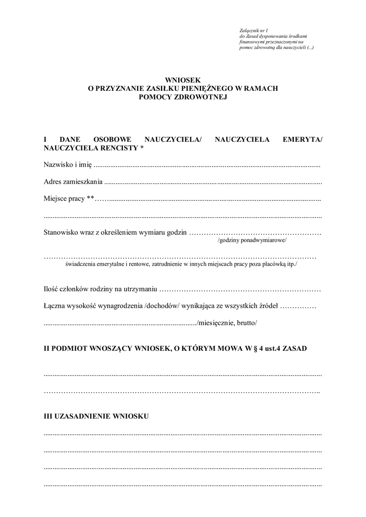 Załącznik nr 1 do Zasad dysponowania środkami finansowymi przeznaczonymi na pomoc zdrowotną dla nauczycieli (...) WNIOSEK O PRZYZNANIE ZASIŁKU PIENIĘŻNEGO W RAMACH POMOCY ZDROWOTNEJ I DANE OSOBOWE NAUCZYCIELA/ NAUCZYCIELA RENCISTY * NAUCZYCIELA EMERYTA/ Nazwisko i imię ........................................................................................................................... Adres zamieszkania ...................................................................................................................... Miejsce pracy **……................................................................................................................... ....................................................................................................................................................... Stanowisko wraz z określeniem wymiaru godzin ……………………………………………… /godziny ponadwymiarowe/ ………………………………………………………………………………………………… świadczenia emerytalne i rentowe, zatrudnienie w innych miejscach pracy poza placówką itp./ Ilość członków rodziny na utrzymaniu ………………………………………………………… Łączna wysokość wynagrodzenia /dochodów/ wynikająca ze wszystkich źródeł …………… .................................................................................../miesięcznie, brutto/ II PODMIOT WNOSZĄCY WNIOSEK, O KTÓRYM MOWA W § 4 ust.4 ZASAD ....................................................................................................................................................... ………………………………………………………………………………………………….. III UZASADNIENIE WNIOSKU ....................................................................................................................................................... ....................................................................................................................................................... ....................................................................................................................................................... ....................................................................................................................................................... ....................................................................................................................................................... ....................................................................................................................................................... ....................................................................................................................................................... ....................................................................................................................................................... ....................................................................................................................................................... ....................................................................................................................................................... ....................................................................................................................................................... ....................................................................................................................................................... ....................................................................................................................................................... ....................................................................................................................................................... ....................................................................................................................................................... data i podpis ……………………………………… IV POŚWIADCZENIE LEKARZA ....................................................................................................................................................... ....................................................................................................................................................... ....................................................................................................................................................... ....................................................................................................................................................... ....................................................................................................................................................... ....................................................................................................................................................... ....................................................................................................................................................... ....................................................................................................................................................... data i podpis ……………………………………… V OPINIA DYREKTORA SZKOŁY/PLACÓWKI OŚWIATOWEJ ....................................................................................................................................................... ....................................................................................................................................................... ....................................................................................................................................................... …………………
