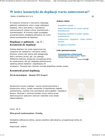 W które kosmetyki do depilacji warto zainwestować? - Portal profesjon... 1 z 15 http://kosmetologia.com.pl/index.php?view=article&catid=310%3Aprz... W które kosmetyki do depilacji warto zainwestować? ŚRODA, 25 SIERPNIA 2010 10:10 Zobacz także W kolejnym artykule o tworzeniu własnego gabinetu poświęcimy nieco uwagi zabiegowi Kupujemy sprzęt i... depilacji, który jest jedną z najczęściej Nowe formularze na zużyty sprzęt wykonywanych usług w pracy kosmetyczek i kosmetyczny kosmetologów. W trzeciej części przeglądu przeanalizujemy dostępną aktualnie na rynku ofertę kosmetyków do depilacji. Depilacja woskiem to pełen zabieg kosmetyczny Praktycznie i wygodnie - łóżka, fotele i Depilacja w gabinecie – cz. 3 – Kosmetyki do depilacji Zabieg depilacji nie może ograniczać się wyłącznie do nałożenia i zerwania wosku. Wszyscy wiemy jak ważna jest pielęgnacja skóry zarówno przed, jak i po zabiegu. Właściwie dobrane preparaty przygotują skórę leżanki W gąszczu frezarek... Link sponsorowany Kosmetologia w Katowicach Zapraszamy na nowe studia. Śląska Wyższa Szkoła Medyczna www.swsm.pl do woskowania, ale też złagodzą podrażnienia, opóźnią odrost włosków i zapobiegną ich wrastaniu. Pozwolą nam również usunąć kłopotliwe resztki wosku. Kosmetyki przed depilacją Żel do demakijażu – Beauty SPA Expert Skutecznie zmywa makijaż i usuwa zanieczyszczenia z powierzchni skóry. Dzięki zawartości D-Panthenolu łagodzi podrażnienia, nawilża oraz pozostawia skórę gładka i napiętą w dotyku. Ekstrakt z zielonej herbaty chroni skórę przed destrukcyjnym wpływem wolnych rodników oraz działa bakteriobójczo. Cena: 35 zł Płyn przed woskowaniem - Estetiq Dokładnie odtłuszcza skórę, usuwa wszelkie zabrudzenia, przygotowuje skórę do depilacji. Pojemność: 500ml. 2010-08-25 11:45 W które kosmetyki do depilacji warto zainwestować? - Portal profesjon... 2 z 15 http://kosmetologia.com.pl/index.php?view=article&catid=310%3Aprz... Cena: 45 zł Żel przed depilacją - Depilflax Preparat idealnie nadaje się do odtłuszczenia skóry przed depilacją. Zawiera w swym składzie rumianek, bisabolol oraz lawendę, dzięki czemu odświeża skórę i przygotowuje ją do zabiegu depilacji. Skutecznie nawilża i wygładza skórę oraz zapobiega podrażnieniom. Substancje aktywne: ekstrakt z olejków roślinnych, oczaru wirginijskiego, rumianku, olejek drzewa herbacianego, bisabolol, wyciąg z rozmarynu, mentol. Pojemność: 500 ml. Producent: MayStar. Cena: 36 zł Depileve - lotion przed depilacją - Vanilla Oczyszcza skórę, umożliwiając idealną depilację. Zawiera wyciąg z grapefruita. Pojemność: 250 ml. Cena: 28 zł Depil-OK - pianka przed depilacją – Bek i Bek 2010-08-25 11:45 W które kosmetyki do depilacji warto zainwestować? - Portal profesjon... 3 z 15 http://kosmetologia.com.pl/index.php?view=article&catid=310%3Aprz... Oczyszcza skórę przed depilacją, zawiera olejek z drzewa herbacianego. Pojemność: 200ml. Cena: 35 zł Lotion przed depilacją - Miracleshop Preparat przeznaczony do odtłuszczania partii ciała, na których ma być przeprowadzona depilacja. Doskonale oczyszcza, działa antyseptycznie. Sprawia, iż wosk stosowany podczas depilacji skuteczniej usuwa zbędne owłosienie. Pojemność 150 ml. Cena: 15 zł Preparat Before – Tristar Cosmetics Preparat stosowany przed zabiegiem depilacji. Służy do odtłuszczania i oczyszczania włosów oraz skóry, oraz do nadania włosom jednakowego ułożenia, zgodnego z ich naturalnym układem na skórze. Pojemność: 250ml. Marka: Hairaway. Cena: 29 zł Lotion przed depilacją – Corton Cosmetics 2010-08-25 11:45 W które kosmetyki do depilacji warto zainwestować? - Portal profesjon... 4 z 15 http://kosmetologia.com.pl/index.php?view=article&catid=310%3Aprz... Preparat do odtłuszczania i oczyszczania skóry przed zabiegiem. Pojemność: 500 ml Cena: 45 zł Ceny kosmetyków przed depilacją kształtują się w zakresie: 15 – 45 zł. Kosmetyki po depilacji Oliwki Activ - oliwka po depilacji - Depilflax Do usuwania wosku ze skóry o przyjemnym cytrusowym zapachu. Oliwka łagodzi podrażnienia i zaczerwienienia skóry spowodowane depilacją, dokładnie usuwa pozostałości wosku na skórze. Dodatkowo posiada jeszcze działanie antycellulitowe. Substancje aktywne: wyciąg z miłorzębu japońskiego, witaminy A,E i F. Pojemność: 200 ml Cena: 14 zł Depil-OK - oliwka po depilacji – Bek i Bek Usuwa pozostałości wosku po depilacji jednocześnie nawilżając skórę. Zawiera witaminy A, E i F oraz olejek z drzewa herbacianego, rozmarynu i róży piżmowej. Pojemność: 500ml. Cena: 39 zł Oliwka po depilacji - Depilflax 2010-08-25 11:45 W które kosmetyki do depilacji warto zainwestować? - Portal profesjon... 5 z 15 http://kosmetologia.com.pl/index.php?view=article&catid=310%3Aprz... Oliwka do usuwania wosku ze skóry o przyjemnym cytrusowym zapachu. Oliwka łagodzi podrażnienia i zaczerwienienia skóry spowodowane depilacją, dokładnie usuwa pozostałości wosku na skórze. Praktyczna pompka powala na wyciśnięcie odpowiedniej ilości preparatu. Substancje aktywne: oliwa z oliwek, olejek rozmarynowy, bisabolol Pojemność: 500 ml. Producent firma MayStar. Cena: 36 zł Olejek po depilacji – Miracleshop Usuwa ewentualne pozostałości po woskach depilujących, nawilża i odżywia skórę, oczyszcza ją i odświeża. Nadaje się również do masażu. Pojemność 150 ml. Cena: 15 zł Depileve 3 - olejek oczyszczający z azulenem - Vanilla Oczyszczający olejek azulenowy Gold. Oliwka do masażu usuwa pozostałości wosku po depilacji, nawilża i odżywia skóre. Idealna dla skóry suchej. Opakowanie: butelka 500 ml. Cena: 44 zł Oliwka po depilacji eukaliptusowa – Corton Cosmetics Doskonale usuwa resztki wosku ze skóry, delikatnie łagodzi podrażnienia. Pojemność: 500 ml Cena: 35 zł 2010-08-25 11:45 W które kosmetyki do depilacji warto zainwestować? - Portal pro