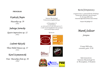 Recital fortepianowy PROGRAM Fryderyk Chopin Mazurkas op. 59 Instytut Muzykologii Uniwersytetu Jagiello"skiego Jadwiga Sarnecka ul. Westerplatte 10 31-033 Kraków tel. (012) 663-16-70, fax (012) 663-16-71 e-mail: [email protected], www.muzykologia.uj.edu.pl Quatre impressions op. 12 Sponsors: (1845) (1911) zorganizowany w ramach W4osko-Polskiego Sympozjum M4odych Muzykologów 14–18 maja 2008 roku Università degli Studi di Pavia (seed Cremona) Instytut Muzykologii UJ Marek Szlezer fortepian Ludomir Ró8ycki Three Polish Dances op. 37 15 maja 2008 roku czwartek, godz. 19.30 (1915) Karol Szymanowski Four Mazurkas from op. 50 (1924) Sala koncertowa Instytutu Muzykologii UJ ul. Westerplatte, 10 Kraków MAREK SZLEZER was born Sept. 4th 1981 in Krakow in the family of professional musicians. He started to play Piano at the age of five under the tutorship of his mother. Between 1994–2000 he studied at Ecole Normale de Musique “A. Cortot” in Paris in the Piano class of professor Marcella Crudeli, being one of the youngest graduates with highest degree available there – “Diplome Superieure de Concertiste”. He was graduated “summa cum laude” from the Academy of Music in Krakow studying with a distinguished professor Ewa Bukojemska. From the year 2004 he commenced in there his work as a piano teacher, being currently an assistant to the piano faculty. In a year 2004/2005 he has received a royal scholarship of Queen Elisabeth’s Music Foundation in Belgium to study in the renowned Chapelle Musicale under the tutorship of A. Rahman El Bacha. He was honored there in June 2005 with the “Master after Master” diploma received “a l’unanimite”. His pianistic career has started at the age of twelve, when he has received Grand prix at IVth International Piano Competition in Rome. Since then the pianist is actively playing concerts abroad and in his homeland participating in many important and prestigious musical events. He was a five time recipient of the Ministry of Culture scholarship, as well as Roussel and Amical foundations in Paris. He has also received a scholarship of YAMAHA Foundation Europe. He took part in a masterclasses of: Dmitri Bashkirov, Aldo Ciccolini, Menahem Pressler, Evgeni Mogilevski, Dominique Merlet, Jean Claude Vanden-Eyden. He is an active performer of modern music – he has being chosen to participate in a class of interpretation of the works created by professor Krzysztof Penderecki held by a composer himself. He is also a first public performer of many modern compositions. Appreciated for his performances of works by Frederic Chopin, he has received various prizes like i.e. I’st prize on a National Chopin Competition in Warsaw, III’rd prize on Chopin International Piano Competition in Marienbad, and special prize of Chopin National Edition as well as the one of the Polish Radio on International Piano Competition “A.Rubinstein in memoriam”. He was honored to play public concert on an original Chopin’s Piano at the Jagiellonian University during the night in which Poland has entered into the European Union. Marek Szlezer has played in such important concert halls as: salle Cortot, chapelle Cziffra, Damascus Opera House, Palais des Beaux-Arts and National Philharmony in Warsaw. In October 2005 on an opening gala-concert of Queen Elisabeth’s Foundation in Belgium he has performed Mozart concerto with English Chamber Orchestra. He has recorded for many Televisions and Radio Broadcasting Companies all over Europe and Middle East. Three CD’s has appeared with his solo recording. MAREK SZLEZER urodzi4 siR w 1981 roku w Krakowie, naukR gry na fortepianie rozpocz94 w wieku lat piRciu. NastRpnie kontynuowa4 j9 w szko4ach muzycznych I i II stopnia m.in. u Krystyny Adamskiej, Jerzego Uukowicza i Stefana Wojtasa. W latach 1994–2000 pobiera4 naukR w „Ecole Normale de Musique de Paris „A. Cortot” we Francji w klasie fortepianu prof. Marcelli Crudeli, zako"czon9 otrzymaniem „Diplome Superieure de Concertiste”. W roku 2004 uko"czy4 studia w Akademii Muzycznej w Krakowie w klasie prof. E. Bukojemskiej uzyskuj9c dyplom z odznaczeniem. W tym samym roku otrzyma4 stypendium królewskie na studia podyplomowe w Chapelle Musicale Reine Elizabeth w Brukseli w klasie A. Rahmana El-Bachy, które uko"czy4 czerwcu 2005 roku z wyróPnieniem otrzymuj9c tytu4 „Master after Master”. Obecnie zajmuje stanowisko asystenta w katedrze fortepianu na Akademii Muzycznej w Krakowie. Jego karierR pianistyczn9 zainicjowa4o zdobycie w wieku lat 12 Grand prix na IV MiRdzynarodowym Konkursie Pianistycznym w Rzymie w 1993 roku. Od tego czasu artysta prowadzi aktywne Pycie koncertowe w kraju i za granica, uczestnicz9c w wielu miRdzynarodowych konkursach i festiwalach pianistycznych. By4 wielokrotnym stypendyst9 Ministerstwa Kultury, fundacji „A. Roussel” i „Amical” we Francji, „Fundacji Promocji Talentu” oraz Fundacji YAMAHA. Uczestniczy4 w kursach mistrzowskich m.in.: D. Bashkirova, A. Ciccoliniego, E. Mogilevskiego, V. Banfielda, M. Presslera, D. Merlet, J. Vanden-Eydena i H. Czerny-Stefa"skiej. WystRpowa4 pod batut9 dyrygentów takich jak: T. Bugaj, W. Czepiel, M. Pijarowski, Z. Rychert, T. Wojciechowski. Ceniony za swoje interpretacje dzie4 Fryderyka Chopina otrzyma4 m.in I miejsce w konkursie stypendialnym Towarzystwa im. F. Chopina w Warszawie, III na MiRdzynarodowym Konkursie chopinowskim w Maria"skich UaVniach, a takPe wiele innych nagród na renomowanych miRdzynarodowych konkursach pianistycznych. Jego recital otwiera4 56. festiwal chopinowski w Dusznikach Zdroju. Mia4 takPe zaszczyt wykonywaO recital na oryginalnym fortepianie Chopina w muzeum Collegium Maius Uniwersytetu Jagiello"skiego w noc wejNcia Polski do Unii Europejskiej w 2004 roku. Ma na swoim koncie liczne Nwiatowe i polskie prawykonania utworów wspó4czesnych (m.in. kwartetu Marka Stachowskiego „Mirroir du Temps” oraz dedykowanych mu utworów A. Walaci"skiego i M. Jab4o"skiego). W t