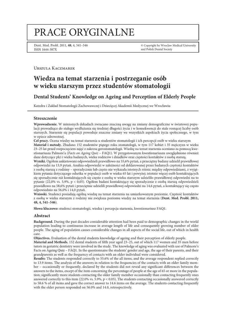 prace oryginalne Dent. Med. Probl. 2011, 48, 4, 541–546 ISSN 1644-387X © Copyright by Wroclaw Medical University and Polish Dental Society Urszula Kaczmarek Wiedza na temat starzenia i postrzeganie osób w wieku starszym przez studentów stomatologii Dental Students’ Knowledge on Ageing and Perception of Elderly People Katedra i Zakład Stomatologii Zachowawczej i Dziecięcej Akademii Medycznej we Wrocławiu Streszczenie Wprowadzenie. W minionych dekadach zwracano znaczną uwagę na zmiany demograficzne w światowej populacji prowadzące do stałego wydłużania się średniej długości życia i w konsekwencji do stale rosnącej liczby osób starszych. Starzenie się populacji powoduje znaczne zmiany we wszystkich aspektach życia społecznego, w tym w opiece zdrowotnej. Cel pracy. Ocena wiedzy na temat starzenia u studentów stomatologii i ich percepcji osób w wieku starszym Materiał i metody. Zbadano 152 studentów piątego roku stomatologii, w tym 117 kobiet i 35 mężczyzn w wieku 23–25 lat przed rozpoczęciem zajęć z zakresu gerostomatologii. Wiedzę na temat starzenia oceniano za pomocą kwestionariusza Palmore’a (Facts on Ageing Quiz – FAQ1). W przygotowanym kwestionariuszu uwzględniono również dane dotyczące płci i wieku badanych, wieku rodziców i dziadków oraz częstości kontaktów z osobą starszą. Wyniki. Ogółem ankietowani odpowiedzieli prawidłowo na 55,6% pytań, a przeciętny badany udzielił prawidłowej odpowiedzi na 13,9 pytań. Analiza odpowiedzi w zależności od deklarowanej przez badanych częstości kontaktów z osobą starszą z rodziny – sporadycznie lub często nie wykazała istotnych różnic między odpowiedziami, z wyjątkiem pytania dotyczącego odsetka w populacji osób w wieku 65 lat i powyżej; istotnie więcej osób kontaktujących się sporadycznie niż kontaktujących się często z osobą w wieku starszym udzieliło prawidłowej odpowiedzi na to pytanie (22,0% vs. 5,9%, p < 0,05). Ogółem badani kontaktujący się sporadycznie z osobą starszą odpowiedzieli prawidłowo na 58,6% pytań i przeciętnie udzielili prawidłowej odpowiedzi na 14,6 pytań, a kontaktujący się często odpowiednio na 56,0% i 14,0 pytań. Wnioski. Studenci posiadają ogólną wiedzę na temat starzenia na umiarkowanym poziomie. Częstość kontaktów z osobą w wieku starszym z rodziny nie zwiększa poziomu wiedzy na temat starzenia (Dent. Med. Probl. 2011, 48, 4, 541–546). Słowa kluczowe: studenci stomatologii, wiedza i percepcja starzenia, kwestionariusz FAQ1. Abstract Background. During the past decades considerable attention had been paid to demographic changes in the world population leading to continuous increase in average length of life and consequently growing number of older people. The aging of population causes considerable changes in all aspects of the social life, out of which in health care. Objectives. Evaluation of the dental students knowledge of ageing and their perception of elderly people. Material and Methods. 152 dental students of fifth year aged 23–25, out of which 117 women and 35 men before tutors in geriatric dentistry were involved in the study. The knowledge of aging was evaluated with use of Palmore’s Facts on Ageing Quiz – FAQ1. In the questionnaire the students’ gender and age, the age of their parents, and their grandparents as well as the frequency of contacts with an older individual were considered. Results: The students responded correctly to 55.6% of the all items, and the average respondent replied correctly to 13.9 items. The analysis of the answers in relation to the frequencies of the contacts with an older family member – occasionally or frequently, declared by the students did not reveal any significant differences between the answers to the items, except of the item concerning the percentage of people at the age of 65 or more in the population; significantly more students contacting the older family member occasionally than contacting frequently ones answered correctly to this item (22.0% vs. 5.9%, p < 0.05). The students contacting occasionally answered correctly to 58.6 % of all items and gave the correct answer to 14.6 items on the average. The students contacting frequently with the older person responded on 56.0% and 14.0, retrospectively. 542 U. Kaczmarek Conclusions. The dental student’s general knowledge on ageing can be estimated satisfactory. The frequency of contacts with an older family member did not increase the level of knowledge of ageing (Dent. Med. Probl. 2011, 48, 4, 541–546). Key words: dental students, knowledge and perception of ageing, FAQ1 questionnaire. Brakuje dotąd jednolitego określenia chronologicznego wieku dla osób starszych. Organizacja Narodów Zjednoczonych uznaje wiek 60 lat i powyżej za kryterium zaliczenia osób do populacji w wieku starszym. W krajach rozwiniętych (w tym w krajach europejskich) za człowieka w wieku starszym uważa się osobę, która ukończyła 65 lat i więcej, jednakże w rozwijających się krajach afrykańskich kryterium to stanowi ukończenie 50 lub 55 lat [1]. W minionych dekadach zwracano znaczną uwagę na zmiany demograficzne w populacji świata prowadzące do stałego wydłużania się średniej długości życia (a przez to wydłużania się fazy starości) i w konsekwencji do stale rosnącej liczby osób starszych. Zmiany cywilizacyjne spowodowały ponadto, że granica starości pojmowana jako stan fizycznej i umysłowej niesprawności została wyraźnie przesunięta się w czasie [2]. Z danych Eurostatu za rok 2010 [3] wynika, że już obecnie 13,5% populacji Polski osiągnęło lub przekroczyło 65 rok życia, co stanowi wzrost o 3,5% tej grupy osób w odniesieniu do sytuacji sprzed 10 lat. Odsetek ten jest nieco niższy niż dla ogółu [27] krajów europejskich, który osiąga wartość 17,4%, przy czym najniższy występuje w populacji Turcji – 7,0%, a najwyższy w populacji Włoch – 20,2%. Mediana wieku