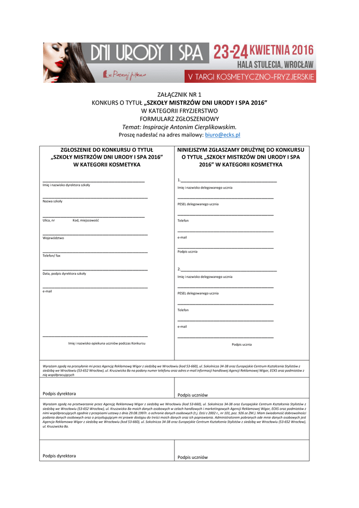 ZAŁĄCZNIK NR 1 KONKURS O TYTUŁ „SZKOŁY MISTRZÓW DNI URODY I SPA 2016” W KATEGORII FRYZJERSTWO FORMULARZ ZGŁOSZENIOWY Temat: Inspiracje Antonim Cierplikowskim. Proszę nadesłać na adres mailowy: [email protected] ZGŁOSZENIE DO KONKURSU O TYTUŁ „SZKOŁY MISTRZÓW DNI URODY I SPA 2016” W KATEGORII KOSMETYKA __________________________________ Imię i nazwisko dyrektora szkoły ___________________________________ Nazwa szkoły 1.________________________________ Imię i nazwisko delegowanego ucznia ________________________________ PESEL delegowanego ucznia __________________________________ Ulica, nr NINIEJSZYM ZGŁASZAMY DRUŻYNĘ DO KONKURSU O TYTUŁ „SZKOŁY MISTRZÓW DNI URODY I SPA 2016” W KATEGORII KOSMETYKA Kod, miejscowość ___________________________________ ________________________________ Telefon ________________________________ e-mail Województwo ___________________________________ ________________________________ Podpis ucznia Telefon/ fax ___________________________________ 2.________________________________ Data, podpis dyrektora szkoły Imię i nazwisko delegowanego ucznia ___________________________________ e-mail ________________________________ PESEL delegowanego ucznia ________________________________ Telefon ________________________________ e-mail ___________________________________ ________________________________ Imię i nazwisko opiekuna uczniów podczas Konkursu Podpis ucznia Wyrażam zgodę na przesyłanie mi przez Agencję Reklamową Wigor z siedzibą we Wrocławiu (kod 53-660), ul. Sokolnicza 34-38 oraz Europejskie Centrum Kształcenia Stylistów z siedzibą we Wrocławiu (53-652 Wrocław), ul. Kruszwicka 8a na podany numer telefonu oraz adres e-mail informacji handlowej Agencji Reklamowej Wigor, ECKS oraz podmiotów z nią współpracujących Podpis dyrektora Podpis uczniów Wyrażam zgodę na przetwarzanie przez Agencję Reklamową Wigor z siedzibą we Wrocławiu (kod 53-660), ul. Sokolnicza 34-38 oraz Europejskie Centrum Kształcenia Stylistów z siedzibą we Wrocławiu (53-652 Wrocław), ul. Kruszwicka 8a moich danych osobowych w celach handlowych i marketingowych Agencji Reklamowej Wigor, ECKS oraz podmiotów z nimi współpracujących zgodnie z przepisami ustawy z dnia 29.08.1997r. o ochronie danych osobowych (t.j. DzU z 2002 r., nr 101, poz. 926 ze ZM.). Mam świadomość dobrowolności podania danych osobowych oraz o przysługującym mi prawie dostępu do treści moich danych oraz ich poprawiania. Administratorem pobranych ode mnie danych osobowych jest Agencja Reklamowa Wigor z siedzibą we Wrocławiu (kod 53-660), ul. Sokolnicza 34-38 oraz Europejskie Centrum Kształcenia Stylistów z siedzibą we Wrocławiu (53-652 Wrocław), ul. Kruszwicka 8a. Podpis dyrektora Podpis uczniów