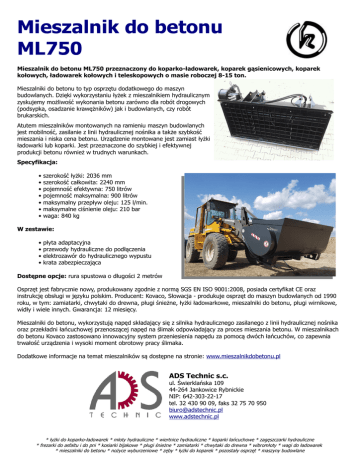 Mieszalnik do betonu ML750 Mieszalnik do betonu ML750 przeznaczony do koparko-ładowarek, koparek gąsienicowych, koparek kołowych, ładowarek kołowych i teleskopowych o masie roboczej 8-15 ton. Mieszalniki do betonu to typ osprzętu dodatkowego do maszyn budowlanych. Dzięki wykorzystaniu łyżek z mieszalnikiem hydraulicznym zyskujemy możliwość wykonania betonu zarówno dla robót drogowych (podsypka, osadzanie krawężników) jak i budowlanych, czy robót brukarskich. Atutem mieszalników montowanych na ramieniu maszyn budowlanych jest mobilność, zasilanie z linii hydraulicznej nośnika a także szybkość mieszania i niska cena betonu. Urządzenie montowane jest zamiast łyżki ładowarki lub koparki. Jest przeznaczone do szybkiej i efektywnej produkcji betonu również w trudnych warunkach. Specyfikacja: • • • • • • • szerokość łyżki: 2036 mm szerokość całkowita: 2240 mm pojemność efektywna: 750 litrów pojemność maksymalna: 900 litrów maksymalny przepływ oleju: 125 l/min. maksymalne ciśnienie oleju: 210 bar waga: 840 kg W zestawie: • • • • płyta adaptacyjna przewody hydrauliczne do podłączenia elektrozawór do hydraulicznego wypustu krata zabezpieczająca Dostępne opcje: rura spustowa o długości 2 metrów Osprzęt jest fabrycznie nowy, produkowany zgodnie z normą SGS EN ISO 9001:2008, posiada certyfikat CE oraz instrukcję obsługi w języku polskim. Producent: Kovaco, Słowacja - produkuje osprzęt do maszyn budowlanych od 1990 roku, w tym: zamiatarki, chwytaki do drewna, pługi śnieżne, łyżki ładowarkowe, mieszalniki do betonu, pługi wirnikowe, widły i wiele innych. Gwarancja: 12 miesięcy. Mieszalniki do betonu, wykorzystują napęd składający się z silnika hydraulicznego zasilanego z linii hydraulicznej nośnika oraz przekładni łańcuchowej przenoszącej napęd na ślimak odpowiadający za proces mieszania betonu. W mieszalnikach do betonu Kovaco zastosowano innowacyjny system przeniesienia napędu za pomocą dwóch łańcuchów, co zapewnia trwałość urządzenia i wysoki moment obrotowy pracy ślimaka. Dodatkowe informacje na temat mieszalników są dostępne na stronie: www.mieszalnikdobetonu.pl ADS Technic s.c. ul. Świerklańska 109 44-264 Jankowice Rybnickie NIP: 642-303-22-17 tel. 32 430 90 09, faks 32 75 70 950 [email protected] www.adstechnic.pl * łyżki do koparko-ładowarek * młoty hydrauliczne * wiertnice hydrauliczne * koparki łańcuchowe * zagęszczarki hydrauliczne * frezarki do asfaltu i do pni * kosiarki bijakowe * pługi śnieżne * zamiatarki * chwytaki do drewna * wibromłoty * wagi do ładowarek * mieszalniki do betonu * nożyce wyburzeniowe * zęby * łyżki do koparek * pozostały osprzęt * maszyny budowlane