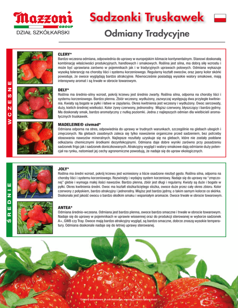 Sadzonki Truskawek Odmiany Tradycyjne DZIAŁ SZKÓŁKARSKI W C Z E S N E CLERY* Bardzo wczesna odmiana, odpowiednia do uprawy w europejskim klimacie kontynentalnym. Stanowi doskonałą kombinację właściwości produkcyjnych, handlowych i smakowych. Roślina jest silna, ma dobrą siłę wzrostu i może być uprawiana zarówno w pojemnikach jak i w tradycyjnych uprawach polowych. Odmiana wykazuje wysoką tolerancję na choroby liści i systemu korzeniowego. Regularny kształt owoców, oraz jasny kolor skórki powoduje, że owoce wyglądają bardzo atrakcyjnie. Równocześnie posiadają wysokie walory smakowe, mają intensywny aromat i są trwałe w obrocie towarowym. DELY* Roślina ma średnio-silny wzrost, pokrój krzewu jest średnio zwarty. Roślina silna, odporna na choroby liści i systemu korzeniowego. Bardzo plenna. Zbiór wczesny, wydłużony, zazwyczaj występują dwa przyległe kwitnienia. Kwiaty są bogate w pyłki i łatwe w zapylaniu. Okres kwitnienia jest wczesny i wydłużony. Owoc sercowaty, duży, kielich średniej wielkości. Kolor żywy czerwony, jednorodny. Miąższ czerwony, błyszczący i bardzo jędrny. Ma doskonały smak, bardzo aromatyczny z nutką poziomki. Jedna z najlepszych odmian dla wielbicieli aromatycznych truskawek. MADELEINE® civmad* Odmiana odporna na stres, odpowiednia do uprawy w trudnych warunkach, szczególnie na glebach ubogich i zmęczonych. Na glebach zasobnych zaleca się tylko nawożenie organiczne przed sadzeniem, bez potrzeby stosowania nawozów mineralnych. Najlepsze rezultaty uzyskuje się na glebach, które nie zostały poddane odkażaniu chemicznymi środkami dezynfekcyjnymi. Odmiana daje dobre wyniki zarówno przy posadzeniu sadzonek frigo jak i sadzonek doniczkowanych. Atrakcyjny wygląd i walory smakowe dają odmianie duży potencjał na rynku, natomiast jej cechy agronomiczne powodują, że nadaje się do upraw ekologicznych. Ś R E D N I E JOLY* Roślina ma średni wzrost, pokrój krzewu jest wzniesiony a liście osadzone niezbyt gęsto. Roślina silna, odporna na choroby liści i systemu korzeniowego. Rozwinięty i wydajny system korzeniowy. Nadaje się do uprawy na “zmęczonej” glebie i wymaga małej ilości nawozów. Bardzo plenna, zbiór jest długi i regularny. Kwiaty są duże i bogate w pyłki. Okres kwitnienia średni. Owoc ma kształt stożka/ściętego stożka, owoce duże przez cały okres zbioru. Kolor czerwony z połyskiem, bardzo atrakcyjny i jednorodny. Miąższ jest bardzo jędrny, o takim samym kolorze co skórka. Doskonała jest jakość owocu o bardzo słodkim smaku i wspaniałym aromacie. Owoce trwałe w obrocie towarowym. ANTEA* Odmiana średnio-wczesna. Odmiana jest bardzo plenna, owoce bardzo smaczne i trwałe w obrocie towarowym. Nadaje się do uprawy w pojemnikach w uprawie wiosennej oraz do produkcji sterowanej w wyborze sadzonek A+, GWB czy Tray. Owoce mają bardzo atrakcyjny wygląd, są bardzo smaczne, dobrze znoszą wysokie temperatury. Odmiana doskonale nadaje się do letniej uprawy sterowanej. *Odmiany opatentowane, ® znak zastrzeżony, własność Consorzio Italiano Vivaisti AROSA* Odmiana odpowiednia do uprawy w europejskim klimacie kontynentalnym. Rośliny mają średnio-silny wzrost, pokrój średnio zwarty, wzniesiony. Odmiana jest bardzo plenna. Kwiaty są bogate w pyłki. Nie jest to odmiana powtarzająca, mimo to możliwe jest wystąpienie intensywnego drugiego kwitnienia w okresie wiosennym. Średni okres dojrzewania. Owoce mają stożkowy, regularny kształt. Mają jasnoczerwony kolor, który nie zmienia się nawet u owoców silnie dojrzałych. Owoce są średnio-duże z jędrnym miąższem. Mają bardzo atrakcyjny wygląd i wysokie walory smakowe. P Ó Ź N E MARMOLADA® onebor* Wzrost umiarkowanie silny. Kwitnienie jest długie i obfite. Bardzo wysoka plenność. Kwiaty są bogate w pyłki. Termin kwitnienia średni. Okres dojrzewania średni. Owoce są duże o regularnym, stożkowym kształcie. Kolor skórki jest intensywnie czerwony z silnym połyskiem. Miąższ jest jędrny, intensywnie czerwony, z optymalną równowagą między poziomem cukru a kwasowością. Owoce są trwałe w obrocie towarowym - dobrze znoszą przenoszenie i transport. Sadzonki w kategorii A+ i Waiting Bed nadają się do produkcji jesiennej i upraw bezglebowych. RAURICA® civka* Odmiana odpowiednia do uprawy w klimacie chłodnym, na wzgórzach i w górach północnych Włoch i w Europie północno-centralnej. Roślina ma średni wzrost. Jest bardzo plenna. Kwiaty są bogate w pyłki. Średnio-późne wydłużone kwitnienie. Późny termin zbioru. Owoc jest bardzo duży, ma regularny, stożkowy kształt. Kolor czerwony, błyszczący. Miąższ jest jędrny, bardzo dobry w smaku. GALIACIV* Odmiana późna, odpowiednia do uprawy w rejonach górskich oraz w klimacie kontynentalnym. Posiada wysokie zdolności produkcyjne, jej owoce są duże, mają atrakcyjny czerwono-pomarańczowy kolor z połyskiem oraz wysokie walory smakowe. Odmiany odpowiednie do przetwórstwa DEEP RUBY* Roślina ma silny wzrost, jest odporna na choroby liści, owoców oraz systemu korzeniowego. Odmiana jest bardzo plenna. Dzięki tym cechom szczególnie nadaje się do upraw ekologicznych i proekologicznych. Okres zbioru średni. Owoce są średniej wielkości, sercowate, łatwe w zbiorze nawet w pełni dojrzałe. Kolor owoców w pełni dojrzałych jest ciemnoczerwony. Miąższ jest jednolicie zabarwiony, o takim samym kolorze, co skórka. Bardzo jędrny nawet przy owocach przejrzałych. Wysoka zawartość Brix, często przekraczająca 10°. Doskonale nadaje się do mrożenia. Po rozmrożeniu zachowuje swoją jędrność z niskim poziomem odcieku z owoców, nieprzekraczającym 5%. RUBINO* Roślina ma silny wzrost. Roślina silna, odporna na choroby liści, owoców i systemu korzeniowego. Odmiana jest bardzo plenna. Dzięki tym cechom szczególnie nadaje się do upraw ekologicznych i proekologicznych. Okres zbioru średni. Owoce są średniej w