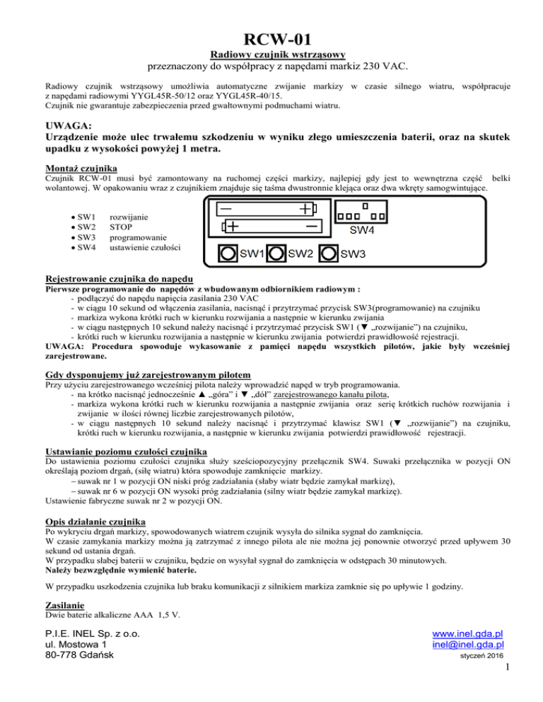 RCW-01 Radiowy czujnik wstrząsowy przeznaczony do współpracy z napędami markiz 230 VAC. Radiowy czujnik wstrząsowy umożliwia automatyczne zwijanie markizy w czasie silnego wiatru, współpracuje z napędami radiowymi YYGL45R-50/12 oraz YYGL45R-40/15. Czujnik nie gwarantuje zabezpieczenia przed gwałtownymi podmuchami wiatru. UWAGA: Urządzenie może ulec trwałemu szkodzeniu w wyniku złego umieszczenia baterii, oraz na skutek upadku z wysokości powyżej 1 metra. Montaż czujnika Czujnik RCW-01 musi być zamontowany na ruchomej części markizy, najlepiej gdy jest to wewnętrzna część belki wolantowej. W opakowaniu wraz z czujnikiem znajduje się taśma dwustronnie klejąca oraz dwa wkręty samogwintujące. SW1 SW2 SW3 SW4 rozwijanie STOP programowanie ustawienie czułości Rejestrowanie czujnika do napędu Pierwsze programowanie do napędów z wbudowanym odbiornikiem radiowym : - podłączyć do napędu napięcia zasilania 230 VAC - w ciągu 10 sekund od włączenia zasilania, nacisnąć i przytrzymać przycisk SW3(programowanie) na czujniku - markiza wykona krótki ruch w kierunku rozwijania a następnie w kierunku zwijania - w ciągu następnych 10 sekund należy nacisnąć i przytrzymać przycisk SW1 (▼ „rozwijanie”) na czujniku, - krótki ruch w kierunku rozwijania a następnie w kierunku zwijania potwierdzi prawidłowość rejestracji. UWAGA: Procedura spowoduje wykasowanie z pamięci napędu wszystkich pilotów, jakie były wcześniej zarejestrowane. Gdy dysponujemy już zarejestrowanym pilotem Przy użyciu zarejestrowanego wcześniej pilota należy wprowadzić napęd w tryb programowania. - na krótko nacisnąć jednocześnie ▲ „góra” i ▼ „dół” zarejestrowanego kanału pilota, - markiza wykona krótki ruch w kierunku rozwijania a następnie zwijania oraz serię krótkich ruchów rozwijania i zwijanie w ilości równej liczbie zarejestrowanych pilotów, - w ciągu następnych 10 sekund należy nacisnąć i przytrzymać klawisz SW1 (▼ „rozwijanie”) na czujniku, krótki ruch w kierunku rozwijania, a następnie w kierunku zwijania potwierdzi prawidłowość rejestracji. Ustawianie poziomu czułości czujnika Do ustawienia poziomu czułości czujnika służy sześciopozycyjny przełącznik SW4. Suwaki przełącznika w pozycji ON określają poziom drgań, (siłę wiatru) która spowoduje zamknięcie markizy. suwak nr 1 w pozycji ON niski próg zadziałania (słaby wiatr będzie zamykał markizę), suwak nr 6 w pozycji ON wysoki próg zadziałania (silny wiatr będzie zamykał markizę). Ustawienie fabryczne suwak nr 2 w pozycji ON. Opis działanie czujnika Po wykryciu drgań markizy, spowodowanych wiatrem czujnik wysyła do silnika sygnał do zamknięcia. W czasie zamykania markizy można ją zatrzymać z innego pilota ale nie można jej ponownie otworzyć przed upływem 30 sekund od ustania drgań. W przypadku słabej baterii w czujniku, będzie on wysyłał sygnał do zamknięcia w odstępach 30 minutowych. Należy bezwzględnie wymienić baterie. W przypadku uszkodzenia czujnika lub braku komunikacji z silnikiem markiza zamknie się po upływie 1 godziny. Zasilanie Dwie baterie alkaliczne AAA 1,5 V. P.I.E. INEL Sp. z o.o. ul. Mostowa 1 80-778 Gdańsk www.inel.gda.pl [email protected] styczeń 2016 1