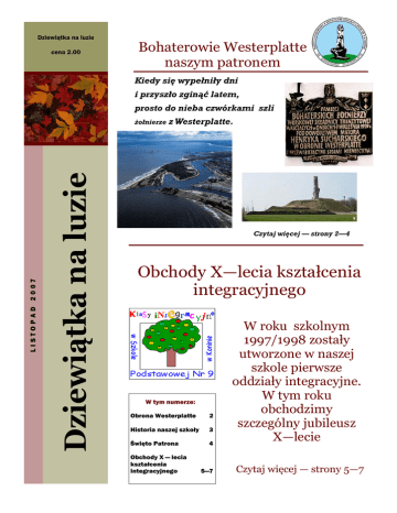 Dziewiątka na luzie cena 2.00 Bohaterowie Westerplatte naszym patronem Kiedy się wypełniły dni i przyszło zginąć latem, prosto do nieba czwórkami szli Dziewiątka na luzie LISTOPAD 2007 żołnierze z Westerplatte. Czytaj więcej — strony 2—4 Obchody X—lecia kształcenia integracyjnego W tym numerze: Obrona Westerplatte 2 Historia naszej szkoły 3 Święto Patrona 4 Obchody X — lecia kształcenia integracyjnego 5—7 W roku szkolnym 1997/1998 zostały utworzone w naszej szkole pierwsze oddziały integracyjne. W tym roku obchodzimy szczególny jubileusz X—lecie Czytaj więcej — strony 5—7 Obrona Westerplatte we wrześniu 1939 roku Westerplatte to półwysep w Gdańsku, przy ujściu Martwej Wisły. W latach 1926-39 była to Wojskowa Składnica Tranzytowa, której obrona we wrześniu 1939 stała się jednym z najbardziej znanych symboli polskiego oporu. Dowódcą bohaterskich żołnierzy był major Henryk Sucharski Westerplatte broniła przez siedem dni wzmocniona kompania (miała walczyć kilkanaście godzin). Polskich bohaterów atakowało około 3500 niemieckich żołnierzy wspartych ciężką artylerią (m.in. haubicomoździerze kalibru 220 mm), bombowcami nurkującymi Stukas oraz pancernikiem Schleswig-Holstein. Z Zatoki Gdańskiej niemieckie okręty ostrzelały teren Westerplatte, jednak Niemcy zrezygnowali z tego ognia, ponieważ pociski przelatywały teren walk. Upowszechniany jest pogląd, jakoby obrona Westerplatte miała dla Polaków wielką wartość symboliczną, bez istotnego znaczenia militarnego. W rzeczywistości, załoga polska w liczbie ok. 180 żołnierzy wiązała walką nieprzerwanie przez siedem dni poważne siły hitlerowskie (piechota morska, SS-Heimwehr Danzig, oddziały wojsk lądowych) zadając im duże straty (ok. kilkuset poległych, przy stratach własnych 15 zabitych). Walką związano też kilka baterii artylerii polowej i haubic, eskadry lotnictwa nurkującego (ok. 40 samolotów), a przede wszystkim - ostrzeliwujący polską placówkę pancernik Schleswig-Holstein. Ten ostatni nie mógł być dzięki temu wykorzystany do likwidacji innych punktów obrony Wybrzeża we wrześniu 1939. Półwysep Westerplatte dziś podzielony jest na trzy części. W parku głównym miejscem jest Pomnik Obrońców Wybrzeża. Ma on 25 metrów wysokości (nie licząc podstawy, którą jest 20-metrowy kopiec). Pomnik ten ma przypominać wyszczerbiony bagnet wbity w ziemię. Piotr Barański — koniński westerplatczyk Piotr Barański urodził się 1 sierpnia 1915 r. we wsi Wola Kotkowska w woj. łódzkim. Ojciec pracował na kolei, a matka wychowywała czworo dzieci i zajmowała się gospodarstwem domowym. Od najmłodszych lat pracował w ogrodnictwie u dziedzica Jankowskiego. Wtedy też ukończył szkołę powszechną . W 1936 r. w Piotrkowie Trybunalskim ukończył gimnazjum o profilu ogrodniczym. Służbę na Westerplatte pełnił od 13 sierpnia 1939 r. w stopniu kapraD Z I EW I Ą TK A N A L U Z I E la. W czasie obrony był celowniczym karabinu maszynowego w obsadzie wartowni nr 2. Został ranny. Po kapitulacji dostał się do obozu jenieckiego w Stalagu 1 A. Pracował u bauera w ogrodnictwie. W marcu 1945 powrócił do domu. Nysę i Bałtyk (1947), Odznaka Grunwaldzka (1960). Zmarł 16 listopada 1971 r. Pochowany został na cmentarzu parafialnym w Koninie. Odznaczenia: Srebrny Krzyż Orderu VM (1945), Medal za Odrę, Str. 2 Historia naszej szkoły Historia szkoły sięga lat 50-tych. Jednak jednym z ważniejszych wydarzeń było wmurowanie kamienia węgielnego pod budowę szkoły podstawowej w Chorzniu w dniu 6 października 1993 ślubowanie klas I roku. Wcześniej szkoła mieściła się w małych parterowych domach przy trasie WarszawaPoznań. 20 września 1963 roku oddano do użytku nowy budynek szkoły. Kierownikiem tej placówki został p. Józef Nowaczyk. W roku szkolnym 1969/1970 (grudzień) Kuratorium Okręgu Szkolnego w Poznaniu nadało szkole imię Bohaterów Westerplatte. Nawiązano listowną współpracę z siostrą majora Henryka Sucharskiego p. Anną Bugajską oraz z p. Piotrem Barańskim, westerplatczykiem z Konina.19 listopada 1970 roku nadano sztandar naszej szkole. Co roku w tym dniu obchodzone jest święto Patrona Szkoły. 1990 rok to czas rozpoczęcia budowy nowej szkoły na osiedlu Chorzeń. W nowym budynku zainaugurowano rok szkolny 1993/1994. Naukę rozpoczęło 720 uczniów w 30 oddziałów z 44 nauczycielami i 18 pracownikami administracji. Funkcję dyrektora szkoły pełniła Dzień Zdrowia, p. Izabela Wilk. Od 18 kwietnia 1996 roku szkoła należy do Klubu Szkół Westerplatte. Klub zrzesza szkoły, które noszą imię Bohaterów Westerplatte. W dniach 26-28 kwietnia 2001 r. nasza szkoła była organizatorem Dzień Wiosny 18 Ogólnopolskiego Sympozjum Szkół Westerplatte. W roku szkolnym 1997/ 1998 miała miejsce w naszej szkole Wojewódzka Inauguracja Roku Szkolnego. W tym samym roku otwarto pierwsze w woj. konińskim klasy integracyjne. W naszej szkole cyklicznie odbywają się różne imprezy: D Z I EW I Ą TK A N A L U Z I E Międzynarodowy Dzień Osób Niepełnosprawnych, Impreza na rzecz Wielkiej Orkiestry Świątecznej Pomocy, Regionalny Festiwal Artystyczny Klas Integracyjnych. Str. 3 Święto Patrona — akademia Organizacja 19 listopada to ważny dzień w życiu naszej szkoły. 37 lat temu nadano naszej szkole imię Bohaterów Westerplatte. Od tego dnia, co roku, obchodzimy Święto Patrona. Tradycyjnie rozpoczęła je uroczysta akademia, poświecona pamięci którzy w obliPodstawowy tych, adres słuŜbowy wierszpierwsi adresu czu zagrożenia2.jako stawili opór 3. wiersz adresu niemieckiemu okupantowi. LI S T O P A D 2 0 0 7 4. wiersz adresu Tel.: 555 55 55 Faks: 555 55 55 E-mail: [email protected] Dewiza firmy Szczególnego znaczenia nabiera w tym dniu odśpiewanie naszego hymnu szkolnego, którym jest Pieśń o żołnierzach z Westerplatte napisana przez K. I. Gałczyńskiego. Ważnym akcentem uroczystości było