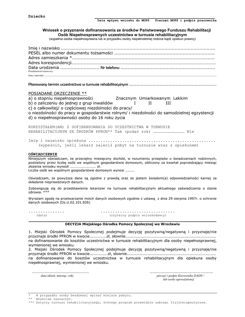 Dziecko __________________________________________________ Data wpływu wniosku do MOPS Pieczęć MOPS i podpis pracownika Wniosek o przyznanie dofinansowania ze środków Państwowego Funduszu Rehabilitacji Osób Niepełnosprawnych uczestnictwa w turnusie rehabilitacyjnym (wypełnia osoba niepełnosprawna lub w przypadku osoby niepełnoletniej rodzice bądź opiekun prawny) Imię i nazwisko .......................................................................................................... PESEL albo numer dokumentu tożsamości ..................................................................... Adres zamieszkania *.................................................................................................. Adres korespondencji…………………………………………………………………………………………………………………… Data urodzenia ........................... Nr telefonu ................................................................. Przedstawiciel ustawowy: Imię i nazwisko ………………………………………………………………………………………………………………… Planowany termin uczestnictwa w turnusie rehabilitacyjnym ............................................................ POSIADANE ORZECZENIE ** a) o stopniu niepełnosprawności Znacznym Umiarkowanym Lekkim b) o zaliczeniu do jednej z grup inwalidów I II III c) o całkowitej/ o częściowej niezdolności do pracy/ o niezdolności do pracy w gospodarstwie rolnym/ i niezdolności do samodzielnej egzystencji d) o niepełnosprawności osoby do 16 roku życia KORZYSTAŁEM(AM) Z DOFINANSOWANIA DO UCZESTNICTWA W TURNUSIE REHABILITACYJNYM ZE ŚRODKÓW PFRON** Tak (podać rok) ………………………………… Nie Imię i nazwisko opiekuna ..................................................... (wypełnić, jeśli lekarz zalecił pobyt na turnusie wraz z opiekunem) OŚWIADCZENIE Niniejszym oświadczam, że przeciętny miesięczny dochód, w rozumieniu przepisów o świadczeniach rodzinnych, podzielony przez liczbę osób we wspólnym gospodarstwie domowym, obliczony za kwartał poprzedzający miesiąc złożenia wniosku wynosił ………………………… zł. Liczba osób we wspólnym gospodarstwie domowym wynosi ........ Oświadczam, że powyższe dane są zgodne z prawdą oraz że jestem świadom(a) odpowiedzialności karnej za składanie nieprawdziwych danych. Zobowiązuję się do przedstawienia lekarzowi na turnusie rehabilitacyjnym aktualnego zaświadczenia o stanie zdrowia. *** Wyrażam zgodę na przetwarzanie moich danych osobowych zgodnie z ustawą z dnia 29 sierpnia 1997r. o ochronie danych osobowych (Dz.U.02.101.926) ............... ............................... (data) (czytelny podpis wnioskodawcy) __________________________________________________________________ DECYZJA Miejskiego Ośrodka Pomocy Społecznej we Wrocławiu 1. Miejski Ośrodek Pomocy Społecznej podejmuje decyzję pozytywną/negatywną i przyznaje/nie przyznaje środki PFRON w kwocie.............zł, słownie..................................................................... na dofinansowanie do kosztów uczestnictwa w turnusie rehabilitacyjnym dla osoby niepełnosprawnej, wymienionej we wniosku. 2. Miejski Ośrodek Pomocy Społecznej podejmuje decyzję pozytywną/negatywną i przyznaje/nie przyznaje środki PFRON w kwocie..............zł, słownie.................................................................... na dofinansowanie do kosztów uczestnictwa w turnusie rehabilitacyjnym dla opiekuna osoby niepełnosprawnej, wymienionej we wniosku. ......................................................... data (dzień, miesiąc, rok) ................................................... ............ pieczęć i podpis Kierownika DAON / lub osoby upoważnionej * W przypadku osoby bezdomnej wpisać miejsce pobytu. ** Właściwe zaznaczyć. *** Dotyczy turnusu rehabilitacyjnego, którego program przewiduje zabiegi fizjoterapeutyczne. pieczątka Zakładu Opieki Zdrowotnej lub gabinetu lekarskiego Wniosek lekarza o skierowanie na turnus rehabilitacyjny Imię i nazwisko…………………………………………………………………………… PESEL albo numer dokumentu tożsamości ………………………………………………… Adres zamieszkania*……………………………………………………………………… …………………………………………………………………………………………... Rodzaj schorzenia** lub dysfunkcji □ dysfunkcja narządu ruchu □ dysfunkcja narząd słuchu □ osoba poruszająca się na wózku inwalidzkim □ dysfunkcja narządu wzroku □ upośledzenie umysłowe □ choroba psychiczna □ padaczka □ schorzenie układu krążenia □ inne (jakie?)……………………… ……………………………………… Konieczność pobytu opiekuna na turnusie □ NIE □ – uzasadnienie ………………………………………………………………………………………………….. ………………………………………………………………………………………………….. ………………………………………………………………………………………………….. ………………………………………………………………………………………………….. ………………………………………………………………………………………………….. Uwagi …………………………………………………………………………………………………... …………………………………………………………………………………………………... …………………………………………………………………………………………………... …………………………………………………………………