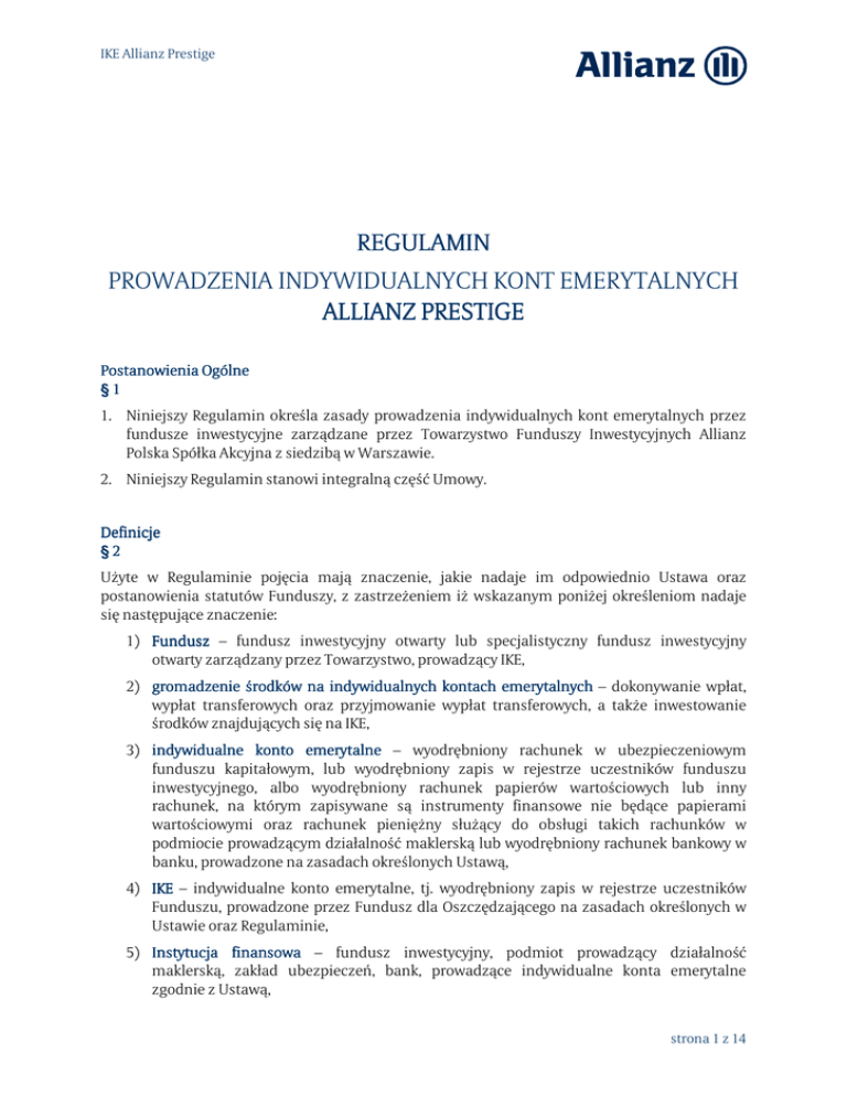 IKE Allianz Prestige REGULAMIN PROWADZENIA INDYWIDUALNYCH KONT EMERYTALNYCH ALLIANZ PRESTIGE Postanowienia Ogólne §1 1. Niniejszy Regulamin określa zasady prowadzenia indywidualnych kont emerytalnych przez fundusze inwestycyjne zarządzane przez Towarzystwo Funduszy Inwestycyjnych Allianz Polska Spółka Akcyjna z siedzibą w Warszawie. 2. Niniejszy Regulamin stanowi integralną część Umowy. Definicje §2 Użyte w Regulaminie pojęcia mają znaczenie, jakie nadaje im odpowiednio Ustawa oraz postanowienia statutów Funduszy, z zastrzeżeniem iż wskazanym poniżej określeniom nadaje się następujące znaczenie: 1) Fundusz – fundusz inwestycyjny otwarty lub specjalistyczny fundusz inwestycyjny otwarty zarządzany przez Towarzystwo, prowadzący IKE, 2) gromadzenie środków na indywidualnych kontach emerytalnych – dokonywanie wpłat, wypłat transferowych oraz przyjmowanie wypłat transferowych, a także inwestowanie środków znajdujących się na IKE, 3) indywidualne konto emerytalne – wyodrębniony rachunek w ubezpieczeniowym funduszu kapitałowym, lub wyodrębniony zapis w rejestrze uczestników funduszu inwestycyjnego, albo wyodrębniony rachunek papierów wartościowych lub inny rachunek, na którym zapisywane są instrumenty finansowe nie będące papierami wartościowymi oraz rachunek pieniężny służący do obsługi takich rachunków w podmiocie prowadzącym działalność maklerską lub wyodrębniony rachunek bankowy w banku, prowadzone na zasadach określonych Ustawą, 4) IKE – indywidualne konto emerytalne, tj. wyodrębniony zapis w rejestrze uczestników Funduszu, prowadzone przez Fundusz dla Oszczędzającego na zasadach określonych w Ustawie oraz Regulaminie, 5) Instytucja finansowa – fundusz inwestycyjny, podmiot prowadzący działalność maklerską, zakład ubezpieczeń, bank, prowadzące indywidualne konta emerytalne zgodnie z Ustawą, strona 1 z 14 IKE Allianz Prestige 6) konwersja – jednoczesne odkupienie jednostek uczestnictwa w Subfunduszu wydzielonym w ramach jednego Funduszu i nabycie jednostek uczestnictwa w innym Subfunduszu wydzielonym w ramach innego Funduszu zarządzanego przez Towarzystwo za środki pieniężne uzyskane z odkupienia jednostek uczestnictwa, pod warunkiem że jednostki odkupywane jak i nabywane są rejestrowane na IKE Oszczędzającego, 7) osoby uprawnione – osoby wskazane przez Oszczędzającego, które otrzymają środki z IKE w razie jego śmierci, a w wypadku braku wskazania – spadkobiercy Oszczędzającego, 8) Oszczędzający – osoba fizyczna, która gromadzi środki na IKE, 9) pracowniczy program emerytalny – pracowniczy program emerytalny w rozumieniu ustawy z dnia 20 kwietnia 2004 roku o pracowniczych programach emerytalnych (DzU nr 116 poz. 1207 ze zm.), 10) Regulamin – niniejszy regulamin prowadzenia IKE, 11) Subfundusz – nieposiadająca osobowości prawnej, wydzielona organizacyjnie część Funduszu, 12) Towarzystwo – Towarzystwo Funduszy Inwestycyjnych Allianz Polska Spółka Akcyjna z siedzibą w Warszawie, 13) Umowa – umowa o prowadzenie IKE zawierana pomiędzy osobą zamierzającą gromadzić oszczędności na IKE (Oszczędzającym) a Funduszem, 14) Ustawa – ustawa z dnia 20 kwietnia 2004 roku o indywidualnych kontach emerytalnych (DzU nr 116 poz. 1205 ze zm.), 15) wpłata – wpłata środków pieniężnych dokonywana przez Oszczędzającego na IKE, 16) wypłata – wypłata jednorazowa albo wypłata w ratach środków zgromadzonych na IKE dokonywana na rzecz Oszczędzającego, po spełnieniu warunków określonych w Regulaminie i przepisach Ustawy albo na rzecz osób uprawnionych, w razie śmierci Oszczędzającego, 17) wypłata transferowa na IKE – przeniesienie środków z IKE prowadzonego dla Oszczędzającego przez inny Fundusz, z innego indywidualnego konta emerytalnego lub z pracowniczego programu emerytalnego na IKE, z indywidualnego konta emerytalnego osoby zmarłej na IKE osoby uprawnionej, na zasadach określonych w § 6 Regulaminu, 18) wypłata transferowa z IKE – przeniesienie środków z IKE na inne indywidualne konto emerytalne lub do pracowniczego programu emerytalnego na zasadach określonych w § 14 Regulaminu, 19) zamiana – jednoczesne odkupienie jednostek uczestnictwa w jednym Subfunduszu i nabycie jednostek uczestnictwa w innym Subfunduszu wydzielonym w ramach tego samego Funduszu za środki pieniężne uzyskane z odkupienia jednostek uczestnictwa, pod warunkiem że jednostki odkupywane jak i nabywane są rejestrowane na IKE Oszczędzającego, 20) zwrot – wycofanie całości środków zgromadzonych na IKE, jeżeli nie zachodzą przesłanki do wypłaty bądź wypłaty transferowej, strona 2 z 14 IKE Allianz Prestige 21) zwrot częściowy – wycofanie części środków zgromadzonych na IKE jeżeli nie zachodzą przesłanki do wypłaty bądź wypłaty transferowej. Umowa o prowadzenie IKE; tryb zawarcia Umowy §3 1. IKE prowadzone jest na podstawie Umowy zawartej przez Oszczędzającego z Funduszem. 2. Umowę może zawrzeć wyłącznie osoba, która ukończyła 16 lat. 3. Na IKE może gromadzić oszczędności wyłącznie jedna osoba. IKE nie może być prowadzone w ramach wspólnych rejestrów małżeńskich. 4. Osoba fizyczna, która dokonała w danym roku kalendarzowym wypłaty transferowej z indywidualnego konta emerytalnego do pracowniczego programu emerytalnego nie może w tym roku zawrzeć Umowy. 5. Osoba, która dokonała wypłaty jednorazowej lub wypłaty pierwszej raty ze swojego indywidualnego konta emerytalnego nie może ponownie założyć indywidualnego konta emerytalnego. 6. Osoba zamierzająca zawrzeć Umowę wypełnia i podpisuje przygotowany przez Towarzystwo formularz Umowy, zawierający w szczególności oświadczenia wymagane przepisami Ustawy. 7. Regulamin staje się integralną częścią Umowy z chwilą jej zawarcia. 8. Umowy mogą być zawierane z różnymi Funduszami. 9. Umowy mogą być zawierane przez Fundusz za pośrednictwem osób 