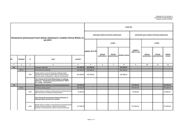 Załącznik Nr 3 do Uchwały nr XXIII/128/2015 Rady Miejskiej w Wołowie z dnia 30.12.2015 r. z tego dla: Jednostek sektora finansów publicznych Jednostek spoza sektora finansów publicznych Zestawienie planowanych kwot dotacji udzielanych z budżetu Gminy Wołów na rok 2015 w tym : w tym : ogółem (10+11+12) ogółem (6+7+8) dotacje podmiotowe Dz. 1 Rozdział § 2 3 600 60014 6300 treść 4 dotacje dotacje celowe przedmiotowe dotacje podmiotowe dotacje przedmiotowe dotacje celowe 10 11 12 wartość 5 5 6 7 8 9 Transport i łączność 832 696,00 832 696,00 832 696,00 - Drogi publiczne powiatowe 832 696,00 832 696,00 832 696,00 - Dotacja celowa na pomoc finansową udzielaną między jednostkami samorządu terytorialnego na dofinansowanie własnych zadań inwestycyjnych i zakupów inwestycyjnych 832 696,00 832 696,00 832 696,00 - - - Tytuł: Dotacja dla Powiatu Wołowskiego na realizację zadania pn. „Przebudowa drogi powiatowej Nr 1286 D, odc. Lubiąż – Domaszków.” 754 75412 2820 Bezpieczeństwo publiczne i ochrona przeciwpożarowa 355 000,00 - 355 000,00 355 000,00 Ochotnicze straże pożarne 355 000,00 - 355 000,00 355 000,00 40 000,00 - 40 000,00 40 000,00 315 000,00 315 000,00 Dotacja celowa z budżetu na finansowanie lub dofinansowanie zadań zleconych do realizacji stowarzyszeniom Tytuł: Dotacja dla Ochotniczych Straży Pożarnych na realizację zadań zleconych do realizacji 6230 Dotacja celowa z budżetu na finansowanie lub dofinansowanie kosztów realizacji inwestycji i zakupów inwestycyjnych jednostek nie zaliczanych do sektora finansów publicznych 315 000,00 Strona 1 z 4 Tytuł: Dotacja dla Ochotniczej Straży Pożarnych w Lubiążu na zakup samochodu pożarniczego 801 80101 2540 1 848 982,00 1 848 982,00 - 1 848 982,00 Szkoły podstawowe 886 511,09 - 886 511,09 886 511,09 Dotacja podmiotowa z budżetu dla niepublicznej jednostki systemu oświaty 824 348,00 - 824 348,00 824 348,00 53 639,00 - 53 639,00 53 639,00 8 524,09 8 524,09 Oświata i wychowanie - - - - - - - - Tytuł: Dotacja dla niepublicznej jednostki systemu oświaty Zespół Szkół Społecznych w Wołowie 2590 Dotacja podmiotowa z budżetu dla publicznej jednostki systemu oświaty prowadzonej przez osobę prawną inną niż jednostka samorządu terytorialnego lub przez osobę fizyczną 2820 Dotacja celowa z budżetu na finansowanie lub dofinansowanie zadań zleconych do realizacji stowarzyszeniom 8 524,09 Oddziały przedszkolne w szkołach podstawowych 3 621,00 - 3 621,00 3 621,00 Dotacja podmiotowa z budżetu dla publicznej jednostki systemu oświaty prowadzonej przez osobę prawną inną niż jednostka samorządu terytorialnego lub przez osobę fizyczną 3 621,00 - 3 621,00 3 621,00 580 010,00 - 580 010,00 580 010,00 0,00 - 580 010,00 - 580 010,00 580 010,00 Gimnazja 267 438,38 - 267 438,38 267 438,38 Dotacja podmiotowa z budżetu dla niepublicznej jednostki systemu oświaty 262 290,00 - 262 290,00 262 290,00 5 148,38 5 148,38 80103 2590 80104 Przedszkola 2310 Dotacje celowe przekazane gminie na zadania bieżące realizowane na podstawie porozumień (umów) między jednostkami samorządu terytorialnego - - Tytuł: Dotacje przekazane do innych JST na realizację zadań oświatowych 2540 Dotacja podmiotowa z budżetu dla niepublicznej jednostki systemu oświaty Tytuł: Dotacja dla niepublicznych przedszkoli " Przedszkole u Babci" w Wołowie, " Malucholandia" w Wołowie, " Niepubliczne Przedszkole Adaś" w Wołowie, " Punkt przedszkolny Kubusia Puchataka" w Krzydlinie Małej 80110 2540 Tytuł: Dotacja dla niepublicznej jednostki systemu oświaty Zespół Szkół Społecznych w Wołowie 2820 Dotacja celowa z budżetu na finansowanie lub dofinansowanie zadań zleconych do realizacji stowarzyszeniom 5 148,38 Strona 2 z 4 - - 80149 2540 Realizacja zadań wymagających stosowania specjalnej organizacji nauki i metod pracy dla dzieci w przedszkolach, oddziałach przedszkolnych w szkołach podstawowych i innych formach wychowania przedszkolnego 13 828,00 - 13 828,00 13 828,00 Dotacja podmiotowa z budżetu dla niepublicznej jednostki systemu oświaty 13 828,00 - 13 828,00 13 828,00 Realizacja zadań wymagających stosowania specjalnej organizacji nauki i metod pracy dla dzieci i młodzieży w szkołach podstawowych, gimnazjach, liceach ogólnokształcących, liceach profilowanych i szkołach zawodowych oraz szkołach artystycznych 97 573,53 - 97 573,53 97 573,53 Dotacja podmiotowa z budżetu dla niepublicznej jednostki systemu oświaty 97 573,53 - 97 573,53 97 573,53 - - - - Tytuł: Dotacja dla niepublicznej jednostki systemu oświaty Zespół Szkół Społecznych w Wołowie 80150 2540 Tytuł: Dotacja dla niepublicznej jednostki systemu oświaty Zespół Szkół Społecznych w Wołowie 854 85406 2710 Edukacyjna opieka wychowawcza 11 084,00 11 084,00 - - 11 084,00 - Poradnie psychologiczno-pedagogiczne, w tym poradnie specjalistyczne 11 084,00 11 084,00 - - 11 084,00 - Dotacja celowa na pomoc finansową udzielaną między jednostkami samorządu terytorialnego na dofinansowanie własnych zadań bieżących 11 084,00 11 084,00 11 084,00 - Kultura i ochrona dziedzictwa narodowego 2 112 000,00 2 012 000,00 2 012 000,00 - - Domy i ośrodki kultury, świetlice i kluby 1 240 000,00 1 240 000,00 1 240 000,00 - - Dotacja podmiotowa z budżetu dla samorządowej instytucji kultury 1 240 000,00 1 240 000,00 1 240 000,00 Biblioteki 772 000,00 772 000,00 772 000,00 Dotacja podmiotowa z budżetu dla samorządowej instytucji kultury 772 000,00 772 000,00 772 000,00 Tutuł: Dotacja celowa dla Powiatu Wołowskiego na Współfinansowanie doradcy metodycznego z zakresu nauczania wychowania fizycznego w Powiatowym Centrum Edukacji i Pomocy Psychologiczno Pedagogicznej w Wołowie 921 92109 2480 100 000,00 - - - 100 000,00 - - - - - - - - - Tytuł: Dotacja podmiotowa dla Wołowskiego Ośrodka Kultury 92116 2480 - - - Tytuł: Dotacja podmiotowa dla Miejskiej i Gminnej Biblioteki Publicznej w Wołowie 92120 2720 Ochrona zabytków i opi