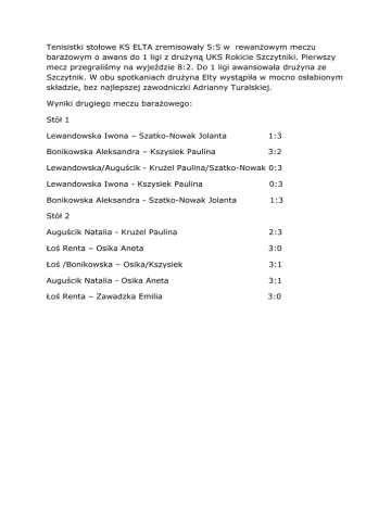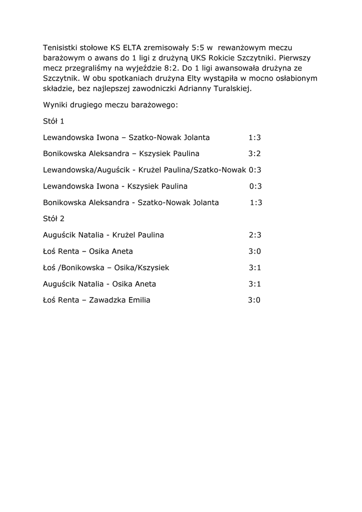 Tenisistki stołowe KS ELTA zremisowały 5:5 w rewanżowym meczu barażowym o awans do 1 ligi z drużyną UKS Rokicie Szczytniki. Pierwszy mecz przegraliśmy na wyjeździe 8:2. Do 1 ligi awansowała drużyna ze Szczytnik. W obu spotkaniach drużyna Elty wystąpiła w mocno osłabionym składzie, bez najlepszej zawodniczki Adrianny Turalskiej. Wyniki drugiego meczu barażowego: Stół 1 Lewandowska Iwona – Szatko-Nowak Jolanta 1:3 Bonikowska Aleksandra – Kszysiek Paulina 3:2 Lewandowska/Auguścik - Krużel Paulina/Szatko-Nowak 0:3 Lewandowska Iwona - Kszysiek Paulina 0:3 Bonikowska Aleksandra - Szatko-Nowak Jolanta 1:3 Stół 2 Auguścik Natalia - Krużel Paulina 2:3 Łoś Renta – Osika Aneta 3:0 Łoś /Bonikowska – Osika/Kszysiek 3:1 Auguścik Natalia - Osika Aneta 3:1 Łoś Renta – Zawadzka Emilia 3:0