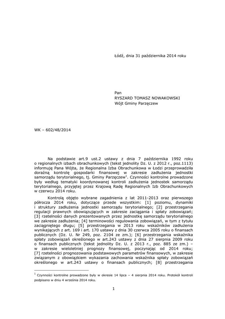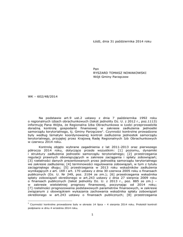 Łódź, dnia 31 października 2014 roku Pan RYSZARD TOMASZ NOWAKOWSKI Wójt Gminy Parzęczew WK – 602/48/2014 Na podstawie art.9 ust.2 ustawy z dnia 7 października 1992 roku o regionalnych izbach obrachunkowych (tekst jednolity Dz. U. z 2012 r., poz.1113) informuję Pana Wójta, że Regionalna Izba Obrachunkowa w Łodzi przeprowadziła doraźną kontrolę gospodarki finansowej w zakresie zadłużenia jednostki samorządu terytorialnego, tj. Gminy Parzęczew1. Czynności kontrolne prowadzone były według tematyki koordynowanej kontroli zadłużenia jednostek samorządu terytorialnego, przyjętej przez Krajową Radę Regionalnych Izb Obrachunkowych w czerwcu 2014 roku. Kontrolą objęto wybrane zagadnienia z lat 2011-2013 oraz pierwszego półrocza 2014 roku, dotyczące przede wszystkim: [1] poziomu, dynamiki i struktury zadłużenia jednostki samorządu terytorialnego; [2] przestrzegania regulacji prawnych obowiązujących w zakresie zaciągania i spłaty zobowiązań; [3] rzetelności danych prezentowanych przez jednostkę samorządu terytorialnego we zakresie zadłużenia; [4] terminowości regulowania zobowiązań, w tym z tytułu zaciągniętego długu; [5] przestrzegania w 2013 roku wskaźników zadłużenia wynikających z art. 169 i art. 170 ustawy z dnia 30 czerwca 2005 roku o finansach publicznych (Dz. U. Nr 249, poz. 2104 ze zm.); [6] przestrzegania wskaźnika spłaty zobowiązań określonego w art.243 ustawy z dnia 27 sierpnia 2009 roku o finansach publicznych (tekst jednolity Dz. U. z 2013 r., poz. 885 ze zm.) – w zakresie wieloletniej prognozy finansowej, poczynając od 2014 roku; [7] rzetelności prognozowania podstawowych parametrów finansowych, w zakresie związanym z obowiązkiem wykazania zachowania wskaźnika spłaty zobowiązań określonego w art.243 ustawy o finansach publicznych; [8] przestrzegania 1 Czynności kontrolne prowadzone były w okresie 14 lipca – 4 sierpnia 2014 roku. Protokół kontroli podpisano w dniu 4 września 2014 roku. 1 regulacji wynikającej z art.242 ustawy o finansach publicznych (równoważenie budżetu w części bieżącej oraz zakaz finansowania wydatków bieżących z dochodów majątkowych na etapie planowania i wykonania budżetu); [9] ustalania i zachowania standardów kontroli zarządczej w zakresie procesów zaciągania i spłaty zadłużenia. I. W wyniku kontroli nie stwierdzono naruszeń i nieprawidłowości mających wpływ na prowadzenie gospodarki finansowej, w szczególności [1] nie stwierdzono przypadków sfinansowania deficytu budżetu jednostki samorządu terytorialnego z niedozwolonych przepisami źródeł; [2] kontrolowana jednostka zachowała ustawowo określony wskaźnik długu; [3] wszystkie analizowane zobowiązania zostały zaciągnięte w wysokości i na cel zgodny z uprzednio podjętymi w tej sprawie uchwałami Rady Gminy; [4] zaciągnięcie zobowiązań z tytułu pożyczek lub kredytów następowało z uwzględnieniem ograniczeń wskazanych w art.92 ust.1 ustawy o finansach publicznych. Umowy o kredyt i pożyczkę nie zawierały zapisów o kapitalizacji odsetek. Organ wykonawczy zaciągał zobowiązania z tytułu kredytów i pożyczek z zachowaniem limitu zobowiązań wskazanego w uchwale budżetowej (art.212 ust.1 pkt 6 ustawy finansach publicznych), w ramach upoważnienia wynikającego z uchwały budżetowej lub w wykonaniu uchwały organu stanowiącego podjętej w sprawie zaciągnięcia zobowiązania (art. 212 ust.2 pkt 1 ustawy o finansach publicznych). Stosownie do wymogów wynikających z art.91 ust.2 ww. ustawy, Wójt Gminy - w związku z zamiarem zaciągnięcia zobowiązania z tytułu pożyczki lub kredytu - każdorazowo zwracał się do RIO w Łodzi o wydanie opinii dotyczącej możliwości spłaty pożyczki lub kredytu. Przed zawarciem każdej umowy o udzielenie kredytu lub pożyczki, kontrolowana jednostka uzyskała pozytywną opinię Składu Orzekającego RIO w Łodzi dotyczącą możliwości zaciągnięcia takich zobowiązań; [5] w sprawozdaniach finansowych i budżetowych rzetelnie prezentowano dane dotyczące długu i jego spłaty; [6] rzetelnie planowano i prognozowano dane finansowe w zakresie związanym z obowiązkiem wykazania zachowania wskaźnika spłaty zobowiązań określonego w art.243 ustawy o finansach publicznych. Stwierdzone natomiast w wyniku czynności kontrolnych nieprawidłowości i uchybienia wynikały z nieprzestrzegania obowiązujących przepisów oraz naruszenia procedur kontroli wewnętrznej i dotyczyły w szczególności: 1. Dopuszczenia do wystąpienia zobowiązań wymagalnych. W 2014 roku stwierdzono naruszenie przez kontrolowaną jednostkę postanowień wynikających z art.44 ust.3 pkt 3 ustawy o finansach publicznych, zgodnie z którym wydatki publiczne powinny być dokonywane w wysokości i terminach wynikających z wcześniej zaciągniętych zobowiązań. Stwierdzona nieprawidłowość dotyczyła przeterminowanej spłaty dwóch rat kredytu udzielonego przez ING Bank Śląski, na mocy umowy z dnia 18 lutego 2010 roku Nr 678/2010/000001428/00, których termin zapłaty upłynął w dniu 28 lutego 2014 roku – 1.220,00 zł i w dniu 31 marca 2014 roku 25.699,83 zł. Z uwagi na nieterminową płatność zobowiązania jednostka zobowiązana została do zapłaty odsetek w wysokości 89,83 zł. Odsetki dotyczyły raty kredytu w kwocie 25.610,00 zł, przypadającej do spłaty na dzień 31 marca 2014 roku. Opóźnienie spłaty raty kredytu – zdaniem Skarbnika Gminy – nastąpiło w wyniku dezinformacji zaistniałej po zmianie harmonogramu płatności, bowiem bank kredytujący przestał przekazywać informacje o wysokości rat kapitałowo-odsetkowych, które do lutego 2 przesyłał pocztą elektroniczną. Spłaty przeterminowanego zobowiązania w łącznej kwocie 26.830,00 zł oraz odsetek karnych w kwocie 89,83 zł, Urząd Gminy dokonał w dniu 8 kwietnia 2014 roku. Odsetki karne w kwocie 89,83 zł zostały zwrócone na rachunek bankowy jednostki przez pracownikó