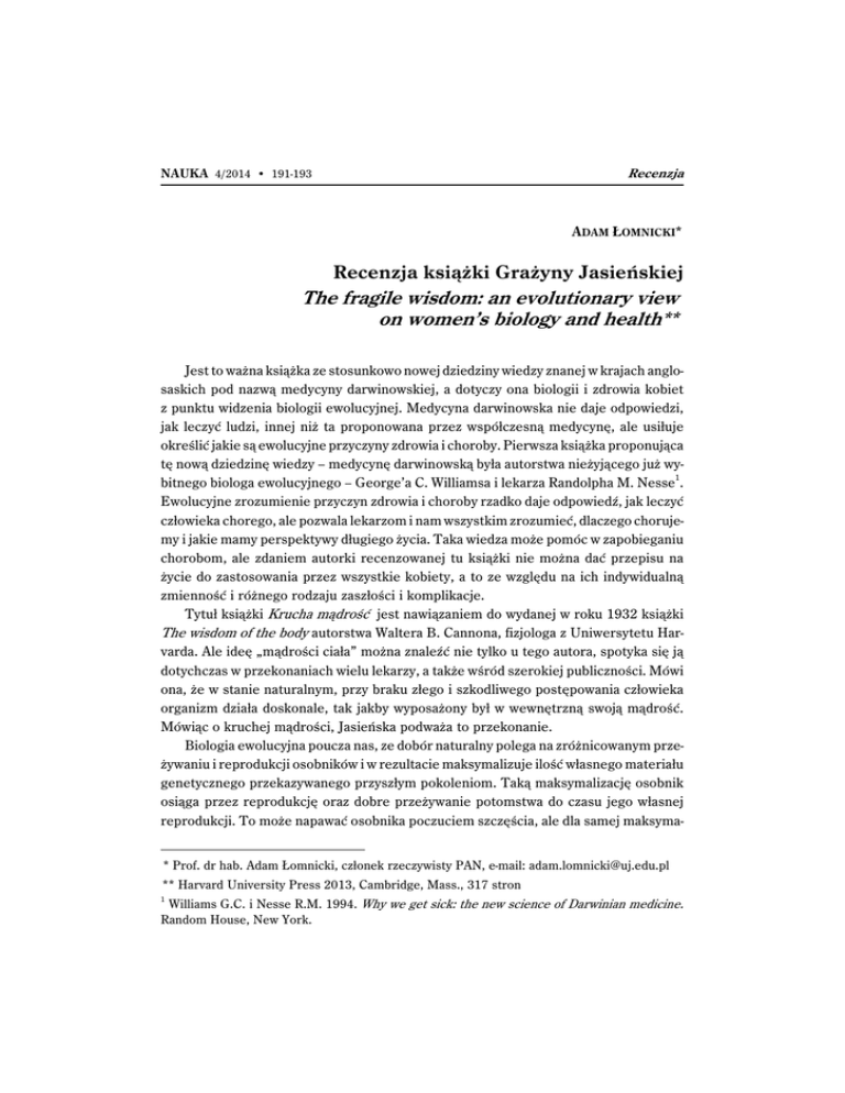 NAUKA 4/2014 • 191-193 Recenzja ADAM ŁOMNICKI* Recenzja książki Grażyny Jasieńskiej The fragile wisdom: an evolutionary view on women’s biology and health** Jest to ważna książka ze stosunkowo nowej dziedziny wiedzy znanej w krajach anglosaskich pod nazwą medycyny darwinowskiej, a dotyczy ona biologii i zdrowia kobiet z punktu widzenia biologii ewolucyjnej. Medycyna darwinowska nie daje odpowiedzi, jak leczyć ludzi, innej niż ta proponowana przez współczesną medycynę, ale usiłuje określić jakie są ewolucyjne przyczyny zdrowia i choroby. Pierwsza książka proponująca tę nową dziedzinę wiedzy – medycynę darwinowską była autorstwa nieżyjącego już wybitnego biologa ewolucyjnego – George’a C. Williamsa i lekarza Randolpha M. Nesse1. Ewolucyjne zrozumienie przyczyn zdrowia i choroby rzadko daje odpowiedź, jak leczyć człowieka chorego, ale pozwala lekarzom i nam wszystkim zrozumieć, dlaczego chorujemy i jakie mamy perspektywy długiego życia. Taka wiedza może pomóc w zapobieganiu chorobom, ale zdaniem autorki recenzowanej tu książki nie można dać przepisu na życie do zastosowania przez wszystkie kobiety, a to ze względu na ich indywidualną zmienność i różnego rodzaju zaszłości i komplikacje. Tytuł książki Krucha mądrość jest nawiązaniem do wydanej w roku 1932 książki The wisdom of the body autorstwa Waltera B. Cannona, fizjologa z Uniwersytetu Harvarda. Ale ideę „mądrości ciała” można znaleźć nie tylko u tego autora, spotyka się ją dotychczas w przekonaniach wielu lekarzy, a także wśród szerokiej publiczności. Mówi ona, że w stanie naturalnym, przy braku złego i szkodliwego postępowania człowieka organizm działa doskonale, tak jakby wyposażony był w wewnętrzną swoją mądrość. Mówiąc o kruchej mądrości, Jasieńska podważa to przekonanie. Biologia ewolucyjna poucza nas, ze dobór naturalny polega na zróżnicowanym przeżywaniu i reprodukcji osobników i w rezultacie maksymalizuje ilość własnego materiału genetycznego przekazywanego przyszłym pokoleniom. Taką maksymalizację osobnik osiąga przez reprodukcję oraz dobre przeżywanie potomstwa do czasu jego własnej reprodukcji. To może napawać osobnika poczuciem szczęścia, ale dla samej maksyma* Prof. dr hab. Adam Łomnicki, członek rzeczywisty PAN, e-mail: [email protected] ** Harvard University Press 2013, Cambridge, Mass., 317 stron 1 Williams G.C. i Nesse R.M. 1994. Why we get sick: the new science of Darwinian medicine. Random House, New York. 192 A. Łomnicki lizacji nie jest konieczne. Dlatego należy pogodzić się z tym, że dobór naturalny ukształtował nas nie po to, abyśmy byli zdrowi i szczęśliwi, ale abyśmy bardziej efektywnie przekazywali swój materiał genetyczny przyszłym pokoleniom. Jak poucza nas inna dziedzina współczesnej biologii ewolucyjnej – ewolucja strategii życiowych, dobór nie prowadzi do powstania i utrzymywania się organizmów idealnych, ale takich organizmów, które realizują wyznaczone przez dobór funkcje różnymi drogami i poprzez wiele różnych kompromisów. Zasoby dostępne dla organizmu są zwykle ograniczone. Jeśli zużyte zostaną na wzrost ciała, to może ich brakować na reprodukcje, a jeśli zbyt dużo zostanie użyte na wzrost i reprodukcję, to może zabraknąć na system odpornościowy i naprawczy, zapewniający długie życie. Do tego dochodzi zmienność między ludźmi wynikająca nie tylko z różnic genetycznych i środowiskowych, ale także z warunków w czasie życia płodowego. Trzeba też mieć na uwadze indywidualną zmienność, co powoduje, że wysokie stężenia hormonów płciowych u kobiet wiąże się z dobrym funkcjonowaniem jajników i tym samym umożliwia zapłodnienie i wydanie potomstwa, ale w późniejszym wieku prowadzić może do rozwoju nowotworu piersi. Z drugiej strony kobiety, których ciężar przy urodzeniu był niski, są bardziej narażone na choroby układu krążenia. Autorka przytacza przykład kobiet, które wydawało się, że prowadzą bardzo racjonalny tryb życia, nie palą, chodzą do pracy na piechotę, zdrowo się odżywiają, mają potomstwo, które karmią piersią, a mimo to chorują i oskarżają siebie, że prawdopodobnie popełniły jakiś błąd w swym życiu. W książce tej proponuje im, aby nie oskarżały się, bo przy indywidualnej zmienności nie istnieje jeden najlepszy tryb życia, a zależności między trybem życia a zdrowiem nie zawsze są prosto zdeterminowane. Proponuje ona, aby na fizjologię i zdrowie kobiety spojrzeć szerzej, nie tylko jako efekt doboru naturalnego, ale także warunków środowiskowych. Jej rozważania oparte są nie tylko na badaniu kobiet w krajach wysoko rozwiniętych, ale także w Nepalu, w Afryce, w społecznościach łowiecko-zbierackich. Sama autorka prowadziła tego typu badania terenowe wśród wiejskich kobiet z Beskidu Niskiego w południowej Polsce. W książce tej mamy także porównania epidemiologiczne, na przykład, przedstawiające różnice w częstości chorób układu krążenia i śmiertelności niemowląt między Anglia i Francją lub reprodukcyjne konsekwencje niewolnictwa u kobiet pochodzenia afroamerykańskiego. Autorka opisała też, w jaki sposób Tadeusz Boy-Żeleński jako pediatra walczył w Krakowie w latach 1905-1908 ze śmiertelnością niemowląt, korzystając ze wsparcia księżnej Lubomirskiej i hrabiego Potockiego. Te i inne epidemiologiczne porównania pokazują, co można zrobić, aby poprawić zdrowie kobiet i ich potomstwa, a co dobór ukształtował tak, że pewne oczywiste zabiegi nie skutkują. Wydaje się, że kobiety we współczesnych krajach wysoko rozwiniętych przy łatwym dostępie do pokarmu wysokiej jakości i licznych odżywek nie powinny cierpieć z powo- The fragile wisdom: an evolutionary view on women’s biology and health 193 du ewolucyjnego kompromisu między przeznaczeniem zasobów na utrzymanie w dobrym stanie organizmu mat