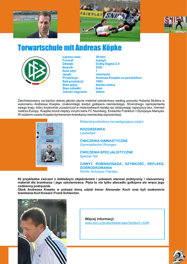 Torwartschule mit Andreas Köpke £¹czny czas: Format: DŸwiêk: Noœnik: Iloœæ p³yt: Jêzyk: Produkcja: Rok produkcji: Stan p³yty: Stan ok³adki: Jakoœæ nagrania: 30 min. mpeg2 Dolby Digital 2.0 DVD 1 niemiecki Andreas Koepke co-produktion 1993 bardzo dobry brak dobra Zarchiwizowany na bardzo dobrej jakoœci p³ycie materia³ szkoleniowy wed³ug pomys³u Huberta Mullera w wykonaniu Andreasa Koepke, znakomitego kiedyœ golkipera niemieckiego, 59-krotnego reprezentanta swego kraju, który trzykrotnie uczestniczy³ w mistrzostwach œwiata raz zdobywaj¹c najwy¿szy laur, równie¿ mistrza Europy. Koepke broni³ miêdzy innymi barw FC Nurnberg, Eintachtu Frankfurt i Olympique Marsylia. W ostatnim czasie Koepke by³ trenerem bramkarzy niemieckiej reprezentacji. Materia³ podzielony na nastêpuj¹ce czêœci: ROZGRZEWKA Laufarbeit ÆWICZENIA GIMNASTYCZNE Gymnastische Übungen ÆWICZENIA SPECJALISTYCZNE Spezial-Teil CHWYT, ROBINSONADA, SZYBKOŒÆ, REFLEKS, DOŒRODKOWANIA Würfe, Schüsse, Flanken 65 przyk³adów æwiczeñ z dok³adnym objaœnieniem i pokazem stanowi praktyczny i nieoceniony materia³ dla bramkarza i jego szkoleniowca. P³yta to nie tylko abecad³o golkipera ale wrêcz jego codzienny podrêcznik. Obok Andreasa Koepke w pokazie bior¹ udzia³ trener Alexander Koch oraz byli znakomicie bramkarze Kurt Kowarz i Frank Schleicher. Wiêcej informacji: www.eys.cc/productdetail.aspx?product=3246