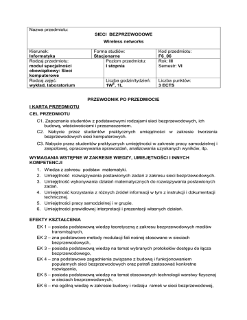 Nazwa przedmiotu: SIECI BEZPRZEWODOWE Wireless networks Kierunek: Informatyka Rodzaj przedmiotu: moduł specjalności obowiązkowy: Sieci komputerowe Rodzaj zajęć: wykład, laboratorium Forma studiów: Stacjonarne Poziom przedmiotu: I stopnia Liczba godzin/tydzień: 1WE, 1L Kod przedmiotu: F6_06 Rok: III Semestr: VI Liczba punktów: 3 ECTS PRZEWODNIK PO PRZEDMIOCIE I KARTA PRZEDMIOTU CEL PRZEDMIOTU C1. Zapoznanie studentów z podstawowymi rodzajami sieci bezprzewodowych, ich budową, właściwościami i przeznaczeniem. C2. Nabycie przez studentów praktycznych umiejętności w zakresie tworzenia bezprzewodowych sieci komputerowych. C3. Nabycie przez studentów praktycznych umiejętności w zakresie pracy samodzielnej i zespołowej, opracowywania sprawozdań, analizowania uzyskanych wyników, itp. WYMAGANIA WSTĘPNE W ZAKRESIE WIEDZY, UMIEJĘTNOŚCI I INNYCH KOMPETENCJI 1. Wiedza z zakresu podstaw matematyki. 2. Umiejętność rozwiązywania postawionych zadań z zakresu sieci bezprzewodowych. 3. Umiejętność wykonywania działań matematycznych do rozwiązywania postawionych zadań. 4. Umiejętność korzystania z różnych źródeł informacji w tym z instrukcji i dokumentacji technicznej. 5. Umiejętności pracy samodzielnej i w grupie. 6. Umiejętności prawidłowej interpretacji i prezentacji własnych działań. EFEKTY KSZTAŁCENIA EK 1 – posiada podstawową wiedzę teoretyczną z zakresu bezprzewodowych mediów transmisyjnych, EK 2 – zna podstawowe metody modulacji fali nośnej stosowane w sieciach bezprzewodowych, EK 3 – posiada podstawową wiedzę na temat wybranych protokołów dostępu do łącza bezprzewodowego, EK 4 – zna podstawowe zagadnienia związane z budową i funkcjonowaniem popularnych sieci bezprzewodowych oraz potrafi zastosować konkretne rozwiązania, EK 5 – posiada podstawową wiedzę na temat stosowanych technologii warstwy fizycznej w sieciach bezprzewodowych, EK 6 – ma ogólną wiedzę w zakresie budowy i rodzaju ramek w sieci bezprzewodowej, EK7 – potrafi zastosować odpowiednie metody zabezpieczeń w sieciach bezprzewodowych, EK8 – ma ogólna wiedzę w zakresie nowych rozwiązań stosowanych w sieciach bezprzewodowych, EK 9 – potrafi pracować samodzielnie oraz w zespole, a także przygotować sprawozdanie z przebiegu realizacji ćwiczeń. TREŚCI PROGRAMOWE Forma zajęć – WYKŁADY W 1 – Bezprzewodowe media transmisyjne, właściwości W 2 – Metody modulacji w sieciach bezprzewodowych W 3 – Wybrane protokoły dostępu do łącza bezprzewodowego W 4 – Standard sieci bezprzewodowych 802.11 W 5 – Topologie, elementy sieci bezprzewodowych 802.11 W 6 – Dostęp do medium transmisyjnego, funkcje DCF i PCF w 802.11 W 7 – Budowa ramek w sieci 802.11 W 8 – Technologie warstwy fizycznej - DSSS, HR/DSSS W 9 – Technologie warstwy fizycznej – OFDM W 10 – Technologie warstwy fizycznej – MIMO W 11 – Bezpieczeństwo sieci bezprzewodowych - WEP W 12 – Bezpieczeństwo sieci bezprzewodowych - WPA/WPA2 W 13 – Bezprzewodowe sieci kratowe W 14 – Sieć bezprzewodowa Bluetooth W 15 – Sieć bezprzewodowa WiMax Forma zajęć – LABORATORIUM L 1 – Symulacja wielowartościowej modulacji fali nośnej L 2 – Badanie modulacji OOK, 16QAM, FSK, GFSK L 3 – Badanie modulacji 4-GFSK, CP-FSK, MSK, DE-MSK L 4 – Badanie modulacji GMSK, BPSK, DE-BPSK, DPSK L 5 – Badanie modulacji QPSK i DQPSK, 8-PSK , 16PSK L 6 – Badanie modulacji w sieci Aloha i BlueTooth L 7 – Badanie modulacji w sieci 802.11 L 8 – Analiza działania protokołu Aloha L 9 – Badanie szybkości transmisji danych przy zastosowaniu protokołu Aloha L 10 – Analiza działania protokołu Csma L 11 – Badanie szybkości transmisji danych przy zastosowaniu protokołu Csma L 12 – Konfiguracja AP (802.11) – serwer DHCP L 13 – Konfiguracja AP (802.11) – bezpieczeństwo sieci L 14 – Badanie jakości sygnału sieci L 15 – Badanie zabezpieczeń sieci Liczba godzin 1 1 1 1 1 1 1 1 1 1 1 1 1 1 1 Liczba godzin 1 1 1 1 1 1 1 1 1 1 1 1 1 1 1 NARZĘDZIA DYDAKTYCZNE 1. – wykład z wykorzystaniem prezentacji multimedialnych 2. – ćwiczenia laboratoryjne, opracowanie sprawozdań z realizacji przebiegu ćwiczeń 3. – przykładowa sieci bezprzewodowe 4. – środowisko programistyczne do symulacji metod modulacji i protokołów warstwy łącza danych. 5. – instrukcje do wykonania ćwiczeń laboratoryjnych SPOSOBY OCENY ( F – FORMUJĄCA, P – PODSUMOWUJĄCA) F1. – ocena przygotowania do ćwiczeń laboratoryjnych F2. – ocena umiejętności stosowania zdobytej wiedzy podczas wykonywania ćwiczeń F3. – ocena sprawozdań z realizacji ćwiczeń objętych programem nauczania F4. – ocena aktywności podczas zajęć P1. – ocena umiejętności rozwiązywania postawionych problemów oraz sposobu prezentacji uzyskanych wyników – zaliczenie na ocenę* P2. – ocena opanowania materiału nauczania będącego przedmiotem wykładu – zaliczenie wykładu (lub egzamin) *) warunkiem uzyskania zaliczenia jest otrzymanie pozytywnych ocen ze wszystkich ćwiczeń laboratoryjnych, OBCIĄŻENIE PRACĄ STUDENTA Forma aktywności Godziny kontaktowe z prowadzącym Średnia liczba godzin na zrealizowanie aktywności 15W 15L 30 h Godziny konsultacji z prowadzącym 5h Godziny przeznaczone na egzamin 3h Zapoznanie się ze wskazaną literaturą 9.5 h Przygotowanie do ćwiczeń laboratoryjnych 7.5 h Wykonanie sprawozdań z realizacji ćwiczeń laboratoryjnych (czas poza zajęciami laboratoryjnymi) 5h Przygotowanie do egzaminu (kolokwium) 15 h Suma SUMARYCZNA LICZBA PUNKTÓW ECTS DLA PRZEDMIOTU Liczba punktów ECTS, którą student uzyskuje na zajęciach wymagających bezpośredniego udziału prowadzącego Liczba punktów ECTS, którą student uzyskuje w ramach zajęć o charakterze praktycznym, w tym zajęć laboratoryjnych i projektowych 75 h 3 ECTS 1.5 ECTS 1.1 ECTS LITERATURA PODSTAWOWA I UZUPEŁNIAJĄCA Engest A., Fleishman G., „Sieci bezprzewodowe, praktyczny przewo