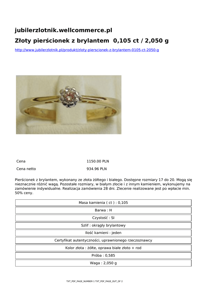 jubilerzlotnik.wellcommerce.pl Złoty pierścionek z brylantem 0,105 ct / 2,050 g http://www.jubilerzlotnik.pl/produkt/zloty-pierscionek-z-brylantem-0105-ct-2050-g Cena 1150.00 PLN Cena netto 934.96 PLN Pierścionek z brylantem, wykonany ze złota żółtego i białego. Dostępne rozmiary 17 do 20. Mogą się nieznacznie różnić wagą. Pozostałe rozmiary, w białym złocie i z innym kamieniem, wykonujemy na zamówienie indywidualne. Realizacja zamówienia 28 dni. Zlecenie realizowane jest po wpłacie min. 50% ceny. Masa kamienia ( ct ) : 0,105 Barwa : H Czystość : SI Szlif : okrągły brylantowy Ilość kamieni : jeden Certyfikat autentyczności, uprawnionego rzeczoznawcy Kolor złota : żółte, oprawa białe złoto + rod Próba : 0,585 Waga : 2,050 g TXT_PDF_PAGE_NUMBER 1 TXT_PDF_PAGE_OUT_OF 2 Rozmiar : 19,5 Zbadany i ocechowany przez Państwowy Urząd Probierczy Odbiór osobisty ( opcjonalnie ) : Katowice TXT_PDF_PAGE_NUMBER 2 TXT_PDF_PAGE_OUT_OF 2