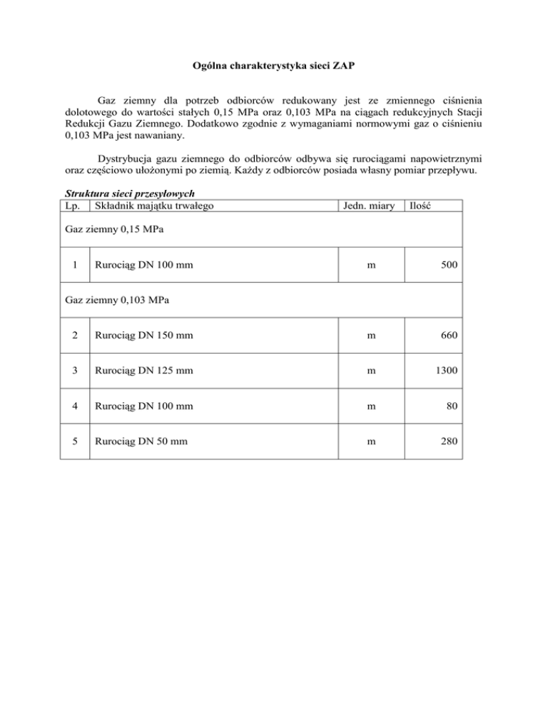 Ogólna charakterystyka sieci ZAP Gaz ziemny dla potrzeb odbiorców redukowany jest ze zmiennego ciśnienia dolotowego do wartości stałych 0,15 MPa oraz 0,103 MPa na ciągach redukcyjnych Stacji Redukcji Gazu Ziemnego. Dodatkowo zgodnie z wymaganiami normowymi gaz o ciśnieniu 0,103 MPa jest nawaniany. Dystrybucja gazu ziemnego do odbiorców odbywa się rurociągami napowietrznymi oraz częściowo ułożonymi po ziemią. Każdy z odbiorców posiada własny pomiar przepływu. Struktura sieci przesyłowych Lp. Składnik majątku trwałego Jedn. miary Ilość Gaz ziemny 0,15 MPa 1 Rurociąg DN 100 mm m 500 Gaz ziemny 0,103 MPa 2 Rurociąg DN 150 mm m 660 3 Rurociąg DN 125 mm m 1300 4 Rurociąg DN 100 mm m 80 5 Rurociąg DN 50 mm m 280