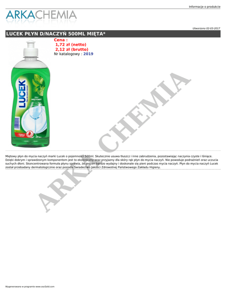 Informacje o produkcie Utworzono 02-03-2017 LUCEK PŁYN D/NACZYŃ 500ML MIĘTA* Cena : 1,72 zł (netto) 2,12 zł (brutto) C H EM IA Nr katalogowy : 2019 AR K A Miętowy płyn do mycia naczyń marki Lucek o pojemności 500ml. Skutecznie usuwa tłuszcz i inne zabrudzenia, pozostawiając naczynia czyste i lśniące. Dzięki dobrym i sprawdzonym komponentom jest to ekologiczny oraz przyjazny dla skóry rąk płyn do mycia naczyń. Nie powoduje podrażnień oraz uczucia suchych dłoni. Skoncentrowana formuła płynu sprawia, że jest on bardzo wydajny i doskonale się pieni podczas mycia naczyń. Płyn do mycia naczyń Lucek został przebadany dermatologicznie oraz posiada Świadectwo Jakości Zdrowotnej Państwowego Zakładu Higieny. Wygenerowano w programie www.oscGold.com