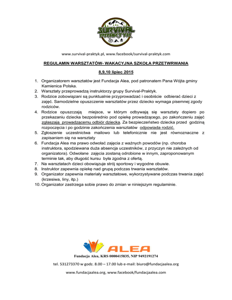 www.survival-praktyk.pl, www.facebook/survival-praktyk.com REGULAMIN WARSZTATÓW- WAKACYJNA SZKOŁA PRZETWRWANIA 8,9,10 lipiec 2015 1. Organizatorem warsztatów jest Fundacja Alea, pod patronatem Pana Wójta gminy Kamienica Polska. 2. Warsztaty przeprowadzą instruktorzy grupy Survival-Praktyk. 3. Rodzice zobowiązani są punktualnie przyprowadzać i osobiście odbierać dzieci z zajęć. Samodzielne opuszczenie warsztatów przez dziecko wymaga pisemnej zgody rodziców. 4. Rodzice opuszczają miejsce, w którym odbywają się warsztaty dopiero po przekazaniu dziecka bezpośrednio pod opiekę prowadzącego, po zakończeniu zajęć zgłaszają prowadzącemu odbiór dziecka. Za bezpieczeństwo dziecka przed godziną rozpoczęcia i po godzinie zakończenia warsztatów odpowiada rodzić. 5. Zgłoszenie uczestnictwa mailowo lub telefonicznie nie jest równoznaczne z zapisaniem się na warsztaty 6. Fundacja Alea ma prawo odwołać zajęcia z ważnych powodów (np. choroba instruktora, spodziewana duża absencja uczestników, z przyczyn nie zależnych od organizatora). Odwołane zajęcia zostaną odrobione w innym, zaproponowanym terminie tak, aby długość kursu była zgodna z ofertą. 7. Na warsztatach dzieci obowiązuje strój sportowy i wygodne obuwie. 8. Instruktor zapewnia opiekę nad grupą podczas trwania warsztatów. 9. Organizator zapewnia materiały warsztatowe, wykorzystywane podczas trwania zajęć (krzesiwa, liny, itp.) 10. Organizator zastrzega sobie prawo do zmian w niniejszym regulaminie. Fundacja Alea, KRS 0000415835, NIP 9492191274 tel. 531273370 w godz. 8.00 – 17.00 lub e-mail: [email protected] www.fundacjaalea.org, www.facebook/fundacjaalea.com