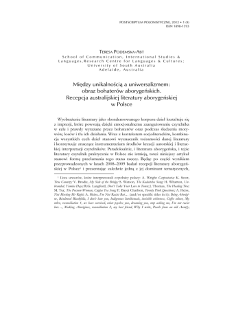 POSTSCRIPTUM POLONISTYCZNE, 2012 • 1 (9) ISSN 1898-1593 TERESA PODEMSKA-ABT School of Communication, International Studies & Languages,Research Centre for Languages & Cultures; University of South Australia Adelaide, Australia Między unikalnością a uniwersalizmem: obraz bohaterów aborygeńskich. Recepcja australijskiej literatury aborygeńskiej w Polsce Wyobrażenie literatury jako skondensowanego korpusu dzieł kształtuje się z impresji, które powstają dzięki emocjonalnemu zaangażowaniu czytelnika w cele i prawdy wyrażane przez bohaterów oraz podczas śledzenia motywów, losów i tła ich działania. Wraz z kontekstem socjoliterackim, kombinacja wszystkich cech dzieł stanowi wyznacznik tożsamości danej literatury i konstytuuje znaczące instrumentarium środków kreacji autorskiej i literackiej interpretacji czytelników. Paradoksalnie, i literatura aborygeńska, i tejże literatury czytelnik praktycznie w Polsce nie istnieją, toteż niniejszy artykuł stanowi formę przełamania tego stanu rzeczy. Będąc po części wynikiem przeprowadzonych w latach 2008–2009 badań recepcji literatury aborygeńskiej w Polsce1 i prezentując zaledwie jedną z jej dominant tematycznych, 1 Lista utworów, które interpretowali czytelnicy polscy: A. Wright Carpentaria; K. Scott, True Country; V. Brodie, My Side of the Bridge; S. Watson, The Kadaitcha Sung; H. Wharton, Unbranded, Yumba Days; R.G. Langford, Don’t Take Your Love to Town; J. Thomas, The Healing Tree; M. Tur, The Possum Woman, Cuppa Tea Song; F. Bayet Charlton, Twenty Pink Questions; A. Heiss, Not Meeting Mr Right; A. Heiss, I’m Not Racist But… (and/or specific titles in it): Being Aborigine, Bicultural Blackfella, I don’t hate you, Indigenous Intellectuals, invisible whiteness, Coffee colour, My other, reconciliation 1, we have survived, what psyches you, dreaming you, stop asking me, I’m not racist but…, Making Aborigines, reconciliation 2, my best friend, Why I write, Pearls from an old Aunty); 152 POSTSCRIPTUM POLONISTYCZNE, 2012 • 1 (9) artykuł przedstawia niewielką część interpretacji czytelników i ich omówienia. Badania w Polsce miały na celu określenie zakresu zrozumienia kulturowo-literackich wartości literatury aborygeńskiej przez czytelników spoza kultur tubylczych i kultury australijskiej, a zatem bez doświadczeń kolonialnych i postkolonialnych. Ze względu na wielowiekowe uwarunkowania historyczne Polski i jej literatury, a także specyfikę polskiej edukacji, czytelnik polski zdawał się być dobrze przygotowanym odbiorcą wielowarstwowej wymowy dzieła aborygeńskiego, szczególnie mocno nacechowanego polityką, dążeniem do wolności, tradycjonalizmem, historyzmem i narodowościowo podobną kulturową specyfiką motywów mitycznych, folklorystycznych, środowiskowo-naturalistycznych. Badania prowadzone były w języku angielskim. Uczestnicy czytali oryginał, na spotkaniach seminaryjnych wyjaśniali niezrozumiałe, na ogół kulturowo-językowe fragmenty utworu oraz dyskutowali o przeczytanych tekstach, po czym „odpowiadali” na każdy utwór w formie pisemnej interpretacji2. Materiałem uzupełniającym były filmy, tradycyjna muzyka, materiały edukacyjne. We własnym zakresie odbiorcy czytali przygotowaną dla nich literaturę krytyczną oraz swobodnie korzystali z baz internetowych. W swoich refleksjach czytelnicy podkreślają, iż obraz australijskich tubylców i ich kultur, jaki mieli przed uczestnictwem w badaniach, zasadzał się na stereotypie propagowanym przez media i filmy australijskie, które przedstawiają dziedzictwo kulturowe i literackie tubylców z punktu widzenia twórców kultury głównego nurtu. Spotkanie z literaturą aborygeńską i filmem zmieniło i rozszerzyło wyobrażenie czytelników o tubylcach, ich kulturze oraz sytuacji w Australii, a w konsekwencji wzbogaciło ich światopogląd i wiedzę o współczesnym świecie (zarówno realnym, jak i przedstawionym). Materiał badawczy zachowuje kryterium anonimowości uczestników. Omówione są tylko te kreacje bohaterów aborygeńskich, które wywołały największe zainteresowanie czytelników polskich, w większości studentów anglistyki Uniwersytetu Wrocławskiego. L. Fogarty, New and Selected Poems. Munaldjali, Mutuerjaraera (and/or specific titles in it): Am I, Are there abo schools?, Big ‘N’ Riddle, Blackfella drunk, Blackfella fights, Bungoo Bungoo, Come over Murii, Dulpai – Ila Ngari Kim Mo-Man, Free our dreams, Imarbara I am – Generation of Existence, Just woke up, Little Murri, be a Murri before an Australian, Mad Souls, Memo to us (story), Murra Murra Gulandanilli Waterhen, Ngunda… The God, Rae Shines in Rivers, Tired of writing, You who my read my words. 2 Wszystkie cytaty z interpretacji czytelników są tłumaczone z angielskiego. Numery danych interpretacji będę umieszczać w nawiasie po cytatach. TERESA PODEMSKA-ABT: Między unikalnością a uniwersalizmem… 153 Niezależnie od literackiej konwencji bohaterowie literatury to znaki sygnalizujące rzeczywistość pozatekstową. W literaturze aborygeńskiej jest to cecha charakterystyczna, bowiem powiązanie jej z realiami tubylców potwierdzają wszystkie programy literackie i wypowiedzi pisarzy aborygeńskich (por. Heiss 2007). Naturalnie, takie spojrzenie na konstrukcje literackie otwiera się na interpretacje o różnorodnym nachyleniu i wymowie krytycznej. Używając zróżnicowanych paradygmatów tematycznych i teoretycznych oraz strategii interpretacyjnych, czytelnicy polscy przyjmują dwie odmienne postawy. Pierwsza polega na tym, że zgodnie ze swym rozumieniem i wyobrażeniem kultury, estetyki i realiów aborygeńskich rozpatrują zjawiska dzieła literackiego per se: figuratywność języka, kompozycję, narrację, relacje narratorów z bohaterami i światem fikcyjnym, kulturowo specyficzne elementy i konceptualizacje świata przedstawionego. Druga – na rozwijaniu dyskursów i elementów utworów wiążącyc
