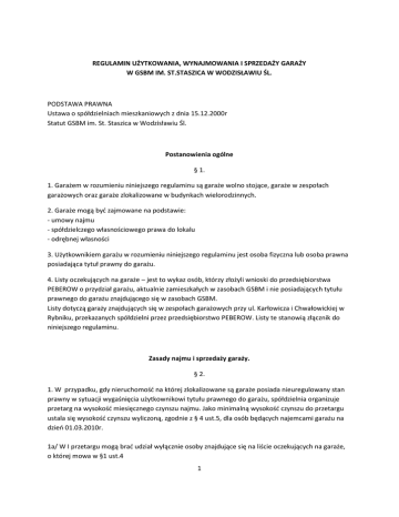 REGULAMIN UŻYTKOWANIA, WYNAJMOWANIA I SPRZEDAŻY GARAŻY W GSBM IM. ST.STASZICA W WODZISŁAWIU ŚL. PODSTAWA PRAWNA Ustawa o spółdzielniach mieszkaniowych z dnia 15.12.2000r Statut GSBM im. St. Staszica w Wodzisławiu Śl. Postanowienia ogólne § 1. 1. Garażem w rozumieniu niniejszego regulaminu są garaże wolno stojące, garaże w zespołach garażowych oraz garaże zlokalizowane w budynkach wielorodzinnych. 2. Garaże mogą być zajmowane na podstawie: - umowy najmu - spółdzielczego własnościowego prawa do lokalu - odrębnej własności 3. Użytkownikiem garażu w rozumieniu niniejszego regulaminu jest osoba fizyczna lub osoba prawna posiadająca tytuł prawny do garażu. 4. Listy oczekujących na garaże – jest to wykaz osób, którzy złożyli wnioski do przedsiębiorstwa PEBEROW o przydział garażu, aktualnie zamieszkałych w zasobach GSBM i nie posiadających tytułu prawnego do garażu znajdującego się w zasobach GSBM. Listy dotyczą garaży znajdujących się w zespołach garażowych przy ul. Karłowicza i Chwałowickiej w Rybniku, przekazanych spółdzielni przez przedsiębiorstwo PEBEROW. Listy te stanowią złącznik do niniejszego regulaminu. Zasady najmu i sprzedaży garaży. § 2. 1. W przypadku, gdy nieruchomość na której zlokalizowane są garaże posiada nieuregulowany stan prawny w sytuacji wygaśnięcia użytkownikowi tytułu prawnego do garażu, spółdzielnia organizuje przetarg na wysokość miesięcznego czynszu najmu. Jako minimalną wysokość czynszu do przetargu ustala się wysokość czynszu wyliczoną, zgodnie z § 4 ust.5, dla osób będących najemcami garażu na dzień 01.03.2010r. 1a/ W I przetargu mogą brać udział wyłącznie osoby znajdujące się na liście oczekujących na garaże, o której mowa w §1 ust.4 1 1b/ W przypadku nierozstrzygnięcia I przetargu przeprowadzony zostaje II przetarg w którym brać udział mogą osoby posiadające tytuł prawny do lokalu mieszkalnego znajdującego się w zasobach GSBM . Minimalna wysokość czynszu pozostaje jak w I przetargu. 2. W przypadku, gdy nieruchomość na której zlokalizowane są garaże posiada uregulowany stan prawny i spółdzielnia uzyskała decyzję o samodzielności garaży w sytuacji wygaśnięcia tytułu prawnego do garażu organizuje się przetarg na ustanowienie odrębnej własności garażu. Ceną wyjściową dla I przetargu jest wartość rynkowa garażu oszacowana przez rzeczoznawcę majątkowego. 2a/ W I przetargu mogą brać udział wyłącznie osoby znajdujące się na liście oczekujących na garaże, o której mowa w §1 ust.4 2b/ W przypadku nierozstrzygnięcia I przetargu przeprowadzony zostaje II przetarg w którym brać udział mogą osoby posiadające tytuł prawny do lokalu mieszkalnego znajdującego się w zasobach GSBM . 2c/. W przypadku braku chętnych na zakup garażu w I i II przetargu, przeprowadzony zostaje III przetarg, z taką samą ceną wyjściową, do którego przystąpić mogą także osoby fizyczne nie posiadające tytułu prawnego do lokalu mieszkalnego znajdującego się w zasobach GSBM i osoby prawne. 2d/. W przypadku braku chętnych na zakup garażu w III przetargu przeprowadzony zostaje IV przetarg z ceną wyjściową równą 85% wartości rynkowej garażu, oszacowanej przez rzeczoznawcę majątkowego. Do przetargu mogą przystąpić osoby fizyczne posiadające i nie posiadające tytułu prawnego do lokalu mieszkalnego znajdującego się w zasobach GSBM oraz osoby prawne. 2e/. W przypadku nie rozstrzygnięcia III lub IV przetargu na zakup garażu Zarząd Spółdzielni przed kolejnym etapem może podpisać umowę o ustanowienie odrębnej własności garażu, z osobą która zadeklaruje kwotę w wysokości ceny wyjściowej ostatniego przetargu. 2f/. W przypadku nie ustanowienia prawa odrębnej własności do garażu w wyżej wskazanym trybie, istnieje możliwość zorganizowania przetargu na wysokość miesięcznego czynszu najmu. Jako minimalną wysokość czynszu do przetargu ustala się wysokość czynszu wyliczoną zgodnie z § 4 ust. 5. Do przetargu przystąpić mogą osoby posiadające tytuł prawny do lokalu mieszkalnego znajdującego się w zasobach GSBM. 3.Spółdzielcze własnościowe prawo do garażu i odrębna własność garażu są prawami zbywalnymi, przechodzą na spadkobierców i podlegają egzekucji. 4. W przypadku, gdy spółdzielnia podjęła uchwałę o określeniu przedmiotu odrębnej własności garaży w danej nieruchomości posiadającej uregulowany stan prawny, osoby posiadające umowę najmu garażu i będące członkami GSBM mogą wystąpić do spółdzielni z wnioskiem o ustanowienie odrębnej własności lokalu . 2 Warunkiem przeniesienia własności garażu jest w tym wypadku: - wpłata wartości rynkowej garażu i gruntu ustalona w oparciu o wycenę rzeczoznawcy majątkowego - wpłata kosztu wykonania wyceny gruntu i nieruchomości - wpłata kosztu podziału nieruchomości - spłata zadłużenia z tytułu opłat za garaż Zasady użytkowania garaży § 3. 1. Garaż winien służyć użytkownikowi garażu do przechowywania pojazdów mechanicznych (samochód, motocykl, motorower, wózek inwalidzki), których jest właścicielem. 2. Użytkownik garażu posiadający jako tytuł prawny do garażu umowę najmu nie może oddać go w użytkowanie innej osobie. Podstawą do wypowiedzenia przez spółdzielnię umowy najmu może być sytuacja gdy najemca podnajmuje garaż innej osobie, nie wykorzystuje garażu zgodnie z jego przeznaczeniem, uchyla się od obowiązków określonych w § 3 ust. 3 lub zalega z wnoszeniem opłat, o których mowa w §4 niniejszego regulaminu. 3. Użytkownik garażu zobowiązany jest do: a/ napraw i konserwacji wnętrza garażu w tym do - uzupełniania tynków wewnętrznych, ich malowania - naprawy posadzki - naprawy i konserwacji instalacji elektrycznej o ile taka instalacja jest zamontowana b/ konserwacji, malowania i wymiany stolarki drzwiowej c/ utrzymywania czystości i porządku wewną