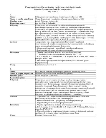 Propozycje tematów projektów dyplomowych inżynierskich Katedra Systemów Geoinformatycznych luty 2015 r. 1. Temat Temat w języku angielskim Opiekun pracy Konsultant pracy Cel pracy Zadania Literatura Uwagi Trójwymiarowa wizualizacja obiektów podwodnych w GIS Three-dimensional visualisation of underwater objects in GIS dr inż. Zbigniew Łubniewski mgr inż. Marek Kulawiak Celem pracy jest stworzenie i przetestowanie oprogramowania umożliwiającego odpowiednią konwersję, a następnie trójwymiarową wizualizację, z użyciem przeglądarek internetowych, danych opisujących obiekty podwodne, np. wraki, rzeźba dna morskiego. Źródłowe dane mogą być reprezentowane w różnych modelach, np. rastrowy cyfrowy model wysokości (Digital Elevation Model – DEM), nieregularny zbiór (chmura) punktów (x, y, z), nieregularna sieć trójkątów, inne. Technologia – dowolna (przykładowo: Google Earth API, WebGL/Cesium). 1. Zapoznanie się z zagadnieniem modelowania i wizualizacji trójwymiarowych obiektów przestrzennych, w szczególności podwodnych oraz z technologiami służącymi do tego celu 2. Opracowanie założeń i specyfikacji zadania projektowego 3. Implementacja i testowanie oprogramowania 1. Wykład z przedmiotu Systemy informacji przestrzennej 2. T. Pavlidis, Grafika i przetwarzanie obrazów. WNT, 1987 3. P. A. Longley, M. F. Goodchild, D. J. Maguire, D. W. Rhind, GIS. Teoria i praktyka. PWN, 2008 4. Dokumentacja dotycząca rozwiązań webowych w zakresie grafiki trójwymiarowej Liczba wykonawców: 3-4 2. Temat Temat w języku angielskim Opiekun pracy Konsultant pracy Cel pracy Zadania Literatura Uwagi Baza danych na temat satelitarnych systemów obserwacji Ziemi Database on satellite Earth observation systems dr inż. Zbigniew Łubniewski Celem pracy jest stworzenie prostego, opartego na odpowiednio zaprojektowanej bazie danych systemu informatycznego (preferowane: internetowego) dostarczającego różnych informacji na temat satelitarnych systemów obserwacji Ziemi. Przykładowe dane: parametry orbity, rejestrowane zakresy promieniowania elektromagnetycznego, rozdzielczość przestrzenna, czas rewizyty, rozmiar sceny, precyzja reprezentacji mierzonych wartości, typowe zastosowania danego systemu – słowa kluczowe, przykładowe obrazy (przeglądowe – „quicklook”). 1. Zapoznanie się z zagadnieniem satelitarnej obserwacji Ziemi oraz przykładowymi systemami i ich charakterystyką 2. Opracowanie założeń i specyfikacji zadania projektowego 3. Implementacja i testowanie oprogramowania 1. Wykład z przedmiotu Systemy informacji przestrzennej 2. P. A. Longley, M. F. Goodchild, D. J. Maguire, D. W. Rhind, GIS. Teoria i praktyka. PWN, 2008 3. Materiały dostępne u opiekuna, internetowe zasoby informacji na temat satelitarnych systemów obserwacji i obrazowania Ziemi Liczba wykonawców: 1-2 3. Temat Temat w języku angielskim Opiekun pracy Konsultant pracy Cel pracy Zadania Literatura Skalowany edytor GIS w chmurze Scalable GIS web editor dr inż. Andrzej Chybicki mgr inż. Witold Ciżmowski Celem projektu jest opracowanie skalowanego webowego edytora graficznego GIS opartego o zestaw narzędzi Tatuk GIS DK (ang. Developer Kernel). Temat realizowany przy współpracy z firmą TatukGIS. W przypadku pomyślnej realizacji projektu, możliwa jest kontynuacja podjętej tematyki badawczej w formie np. dyplomu magisterskiego. Szczegóły dotyczące realizacji projektu dostępne u opiekuna. 1. Zapoznanie sie z technologią Tatuk GIS 2. Implementacja wybranych funckji edytora GIS 3. Testowanie opracowanego rozwiązania 1. Dokumentacja Tatuk GIS DK 2. Materiały dostępne u prowadzącego 4. Temat <temat> Temat w języku angielskim Opiekun pracy Konsultant pracy Cel pracy Zadania Literatura Narzędzie do wyliczania charakterystyki przestrzeni Ts/VI dla wielospektralnych zobrazowań satelitarnych - QGIS patch Tool for multispectral image processing - QGIS patch dr inż. Andrzej Chybicki mgr inż. Łukasz Markiewicz W ramach pracy, w wybranej wspólnie z opiekunem technologii, należy opracować narzędzie do przetwarzania satelitarnych zobrazowań wielospektralnych umożliwiające wyliczenie statystyk danego zobrazowania. Narzędzie ma umożliwiać wizualizację zobrazowania, zaznaczanie badanego obszaru oraz wizualizację w formie wykresów wyników. Preferowane jest wykorzystanie technologii QGIS (program w formie pluginu), ale możliwe jest wykorzystanie innych narzędzi. 1. Zapoznanie sie z technologią plugin QGIS 2.Zapoznanie się podstawowymi zagadnieniami przetwarzania zobrazowań satelitarnych edytora GIS 3. Testowanie opracowanego rozwiązania 1. Dokumentacja QGIS 2. Materiały dostępne u prowadzącego 5. Temat <temat> Temat w języku angielskim Opiekun pracy Konsultant pracy Cel pracy Zadania Literatura Aplikacja do śledzenia i analizy obiektów w seriach rastrowych plików graficznych pochodzących z radaru pogodowego Storm radar data processing application dr inż. Andrzej Chybicki mgr inż. Łukasz Markiewicz Celem pracy jest zaprojektowanie i implementacja aplikacji, która w seriach plików graficznych (wolumen rzędu setek plików): • zidentyfikuje poszczególne obiekty, będące wyraźnymi kształtami na tle jednolitego koloru, • wykryje zanikanie uprzednio rozpoznanych obiektów i pojawienie się nowych • wyznaczy parametry tych obiektów (m.in. kształt, rozmiar, dominujący kolor) • zidentyfikuje te same obiekty i zmiany ich parametrów na kolejnych obrazach • zapisze parametry obiektów oraz ich zmiany w oddzielnych plikach tekstowych 1. Implementacji aplikacji do przetwarzania danych z radarów burzowych 2. Algorytmy wykrywania i śledzenia kształtów w serii obrazów - przegląd zagadnień 3. Implementacja wybranych algorytmów, testowanie i wnioski końcowe oraz zalecenia 1. Wykrywanie obiektów na obrazach” Mariusz Borawski 2. „Praktyka przetwarzania obrazów w programie Matlab” Robert Koprowiski, Zygmunt Wróbel 3. „Wykrywanie ob