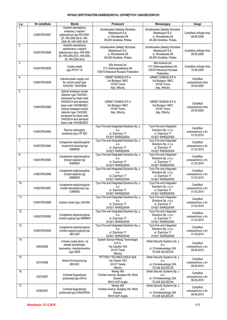 WYKAZ CERTYFIKATÓW ZAWIESZONYCH, COFNIĘTYCH I ZAKOŃCZONYCH L.p. 1. Nr certyfikatu 1438/CPD/0067 2. 1438/CPD/0068 3. Wyrób Hydrant wewnętrzny wnękowy z wężem półsztywnym typ HW-25W20, HW-25W-20-K, HW25W-30, HW-25W-30-K Hydrant wewnętrzny zawieszany z wężem półsztywnym typu: HW-25N20, HW-25N-20-K, HW-25N30, HW-25N-30-K Producent Wnioskujący Uwagi Grodkowskie Zakłady Wyrobów Metalowych S.A. ul. Wrocławska 59 49-200 Grodków, Polska Grodkowskie Zakłady Wyrobów Metalowych S.A. ul. Wrocławska 59 49-200 Grodków, Polska Certyfikat cofnięto dnia 08.06.2009 Grodkowskie Zakłady Wyrobów Metalowych S.A. ul. Wrocławska 59 49-200 Grodków, Polska Grodkowskie Zakłady Wyrobów Metalowych S.A. ul. Wrocławska 59 49-200 Grodków, Polska Certyfikat cofnięto dnia 08.06.2009 1438/CPD/0029 Czujka ciepła typu IP101-1A Alfa Arsenal Ltd. 17/1 Zelemogradskaya Str. 125475 Moscow3 Russian Federation 1438/CPD/0059 Internal power supply unit for control panel type 1043/250, 1043/260A URMET DOMUS S.P.A Via Bologna 188/C 10154 Torino Italy, Włochy Alfa Arsenal Ltd. 17/1 Zelemogradskaya Str. 125475 Moscow3 Russian Federation URMET DOMUS S.P.A Via Bologna 188/C 10154 Torino Italy, Włochy 1438/CPD/0066 Optical analogue smoke detector type 1043/261, composed by head code 1043/261H and standard base code 1043/BASEC Optical analogue smoke detector type 1043/262, composed by head code 1043/261H and standard base code 1043/BASED URMET DOMUS S.P.A Via Bologna 188/C 10154 Torino Italy, Włochy URMET DOMUS S.P.A Via Bologna 188/C 10154 Torino Italy, Włochy 1438/CPD/0083 Ręczny ostrzegacz pożarowy typu CP 820 1438/CPD/0084 Urządzenie wejścia/wyjścia (moduł linii bocznej) typ DIM8000 1438/CPD/0085 Urządzenie wejścia/wyjścia (moduł wyjścia) typ RIM8000 1438/CPD/0086 Urządzenie wejścia/wyjścia (moduł wejścia) typ MIM8000 1438/CPD/0087 Urządzenie wejścia/wyjścia (moduł dwuwejściowy) typ CIM8000 1438/CPD/0088 Izolator zwarć typu LIM 800 1438/CPD/0092 Urządzenie wejścia/wyjścia (moduł wyjścia) typ SNM800 1438/CPD/0093 Urządzenie wejścia/wyjścia (moduł wejścia-wyjścia) typ MIO 800 Tyco Fire and Integrated Solutions Sp. z o.o. ul. Żupnicza 17 03-821 WARSZAWA Tyco Fire and Integrated Solutions Sp. z o.o. ul. Żupnicza 17 03-821 WARSZAWA Tyco Fire and Integrated Solutions Sp. z o.o. ul. Żupnicza 17 03-821 WARSZAWA Tyco Fire and Integrated Solutions Sp. z o.o. ul. Żupnicza 17 03-821 WARSZAWA Tyco Fire and Integrated Solutions Sp. z o.o. ul. Żupnicza 17 03-821 WARSZAWA Tyco Fire and Integrated Solutions Sp. z o.o. ul. Żupnicza 17 03-821 WARSZAWA Tyco Fire and Integrated Solutions Sp. z o.o. ul. Żupnicza 17 03-821 WARSZAWA Tyco Fire and Integrated Solutions Sp. z o.o. ul. Żupnicza 17 03-821 WARSZAWA 2454/2006 Liniowa czujka dymu, na światło pochłonięte, kasowalna, niezdejmowalna typu 6500 2274/2006 Moduł linii bocznej typ M9140C 2337/2007 Centrala Sygnalizacji pożarowej typu DX1e 2338/2007 Centrala Sygnalizacji pożarowej typu DX2e/DX4e Tyco Fire and Integrated Solutions Sp. z o.o. ul. Żupnicza 17 03-821 WARSZAWA Tyco Fire and Integrated Solutions Sp. z o.o. ul. Żupnicza 17 03-821 WARSZAWA Tyco Fire and Integrated Solutions Sp. z o.o. ul. Żupnicza 17 03-821 WARSZAWA Tyco Fire and Integrated Solutions Sp. z o.o. ul. Żupnicza 17 03-821 WARSZAWA Tyco Fire and Integrated Solutions Sp. z o.o. ul. Żupnicza 17 03-821 WARSZAWA Tyco Fire and Integrated Solutions Sp. z o.o. ul. Żupnicza 17 03-821 WARSZAWA Tyco Fire and Integrated Solutions Sp. z o.o. ul. Żupnicza 17 03-821 WARSZAWA Tyco Fire and Integrated Solutions Sp. z o.o. ul. Żupnicza 17 03-821 WARSZAWA System Sensor Pittway Technologia S.P.A. Via Cabotto 19/3 34147 Triest Włochy PITTWAY TECHNOLOGICA SpA Via Caboto 19/3 34147 Trieste Włochy Morley IAS Charles Avenue, Burgess Hill, West Sussex, RH15 9UF Anglia Morley IAS Charles Avenue, Burgess Hill, West Sussex, RH15 9UF Anglia 4. 5. 6. 7. 8. 9. 10. 11. 12. 13. 14. 15. 16. 17. Aktualizacja: 23.12.2016 Ultrak Security Systems Sp. z o.o. ul. Chmielewskiego 22A 70-028 SZCZECIN Ultrak Security Systems Sp. z o.o. ul. Chmielewskiego 22A 70-028 SZCZECIN Ultrak Security Systems Sp. z o.o. ul. Chmielewskiego 22A 70-028 SZCZECIN Ultrak Security Systems Sp. z o.o. ul. Chmielewskiego 22A 70-028 SZCZECIN Certyfikat cofnięto dnia 15.06.2009 Certyfikat unieważniono dnia 25.09.2009 Certyfikat unieważniono dnia 25.09.2009 Certyfikat unieważniono z dn. 31.03.2010 Certyfikat unieważniono z dn. 31.03.2010 Certyfikat unieważniono z dn. 31.03.2010 Certyfikat unieważniono z dn. 31.03.2010 Certyfikat unieważniono z dn. 31.03.2010 Certyfikat unieważniono z dn. 31.03.2010 Certyfikat unieważniono z dn. 31.03.2010 Certyfikat unieważniono z dn. 31.03.2010 Certyfikat unieważniono z dn. 08.06.2010 Certyfikat unieważniono z dn. 08.06.2010 Certyfikat unieważniono z dn. 08.06.2010 Certyfikat unieważniono z dn. 08.06.2010 1/13 WYKAZ CERTYFIKATÓW ZAWIESZONYCH, COFNIĘTYCH I ZAKOŃCZONYCH L.p. 18. Nr certyfikatu 2203/2006 19. 2204/2006 20. 2387/2007 Wyrób Optyczna czujka dymu, nadmiarowa, punktowa, kasowalna, zdejmowalna, dwustanowa z pomocniczą funkcją termiczną, typ: OH 320 C z gniazdem typ:SO 320 Optyczna czujka dymu, nadmiarowa, punktowa, kasowalna, zdejmowalna, dwustanowa typu OP 320 C z gniazdem typu SO 320 Czujka temperatury, nadmiarowa, rózniczkowa, kasowalna, zdejmowalna, dwustanowa typ HI 320C z gniazdem typ SO3 21. 2392/2007 Moduł wejścia/wyjścia typ DC1136-AA (ABI322A) oraz DC1154-AA 2467/2007 Centrala sygnalizacji pożarowej typ FC10xx-A w odmianach 02-A, 04-A, 08-A i 12A 22. 23. 2115/2006 24. 2117/2006 25. 2118/2006 26. 2119/2006 27. 2127/2006 28. 2128/2006 29. 2202/2006 30. Jonizacyjna czujka dymu, nadmiarowa, punktowa, kasowalna, zdejmowalna, adresowalna, analogowa, typ DI 1552 (KL 700A) z gniazdami typu: KZ 700, KZ 705, KZ 705AS, KZ 705I, KZ 705IAS Jonizacyjna czujka dymu, punktowa, kasowalna, zdejmowalna, dwustanowa, typ KL 700 z gniazdem KZ 700 Optyczna cz