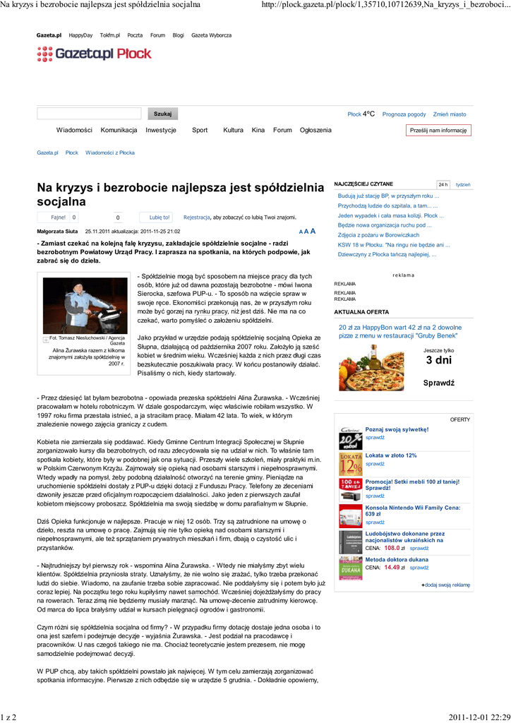 Na kryzys i bezrobocie najlepsza jest spółdzielnia socjalna 1z2 HappyDay Gazeta.pl Tokfm.pl Poczta Forum Blogi http://plock.gazeta.pl/plock/1,35710,10712639,Na_kryzys_i_bezroboci... Gazeta Wyborcza Płock 4ºC Szukaj Wiadomości Gazeta.pl Płock Komunikacja Inwestycje Sport Kultura Kina Forum Ogłoszenia 0 Małgorzata Siuta Zmień miasto Prześlij nam informację Wiadomości z Płocka Na kryzys i bezrobocie najlepsza jest spółdzielnia socjalna Fajne! Prognoza pogody 0 Lubię to! 25.11.2011 aktualizacja: 2011-11-25 21:02 AA A - Spółdzielnie mogą być sposobem na miejsce pracy dla tych osób, które już od dawna pozostają bezrobotne - mówi Iwona Sierocka, szefowa PUP-u. - To sposób na wzięcie spraw w swoje ręce. Ekonomiści przekonują nas, że w przyszłym roku może być gorzej na rynku pracy, niż jest dziś. Nie ma na co czekać, warto pomyśleć o założeniu spółdzielni. Alina Żurawska razem z kilkoma znajomymi założyła spółdzielnię w 2007 r. 24 h tydzień Budują już stację BP, w przyszłym roku ... Przychodzą ludzie do szpitala, a tam... ... Jeden wypadek i cała masa kolizji. Płock ... Rejestracja, aby zobaczyć co lubią Twoi znajomi. - Zamiast czekać na kolejną falę kryzysu, zakładajcie spółdzielnie socjalne - radzi bezrobotnym Powiatowy Urząd Pracy. I zaprasza na spotkania, na których podpowie, jak zabrać się do dzieła. Fot. Tomasz Niesluchowski / Agencja Gazeta NAJCZĘŚCIEJ CZYTANE Jako przykład w urzędzie podają spółdzielnię socjalną Opieka ze Słupna, działającą od października 2007 roku. Założyło ją sześć kobiet w średnim wieku. Wcześniej każda z nich przez długi czas bezskutecznie poszukiwała pracy. W końcu postanowiły działać. Pisaliśmy o nich, kiedy startowały. - Przez dziesięć lat byłam bezrobotna - opowiada prezeska spółdzielni Alina Żurawska. - Wcześniej pracowałam w hotelu robotniczym. W dziale gospodarczym, więc właściwie robiłam wszystko. W 1997 roku firma przestała istnieć, a ja straciłam pracę. Miałam 42 lata. To wiek, w którym znalezienie nowego zajęcia graniczy z cudem. Kobieta nie zamierzała się poddawać. Kiedy Gminne Centrum Integracji Społecznej w Słupnie zorganizowało kursy dla bezrobotnych, od razu zdecydowała się na udział w nich. To właśnie tam spotkała kobiety, które były w podobnej jak ona sytuacji. Przeszły wiele szkoleń, miały praktyki m.in. w Polskim Czerwonym Krzyżu. Zajmowały się opieką nad osobami starszymi i niepełnosprawnymi. Wtedy wpadły na pomysł, żeby podobną działalność otworzyć na terenie gminy. Pieniądze na uruchomienie spółdzielni dostały z PUP-u dzięki dotacji z Funduszu Pracy. Telefony ze zleceniami dzwoniły jeszcze przed oficjalnym rozpoczęciem działalności. Jako jeden z pierwszych zaufał kobietom miejscowy proboszcz. Spółdzielnia ma swoją siedzibę w domu parafialnym w Słupnie. Dziś Opieka funkcjonuje w najlepsze. Pracuje w niej 12 osób. Trzy są zatrudnione na umowę o dzieło, reszta na umowę o pracę. Zajmują się nie tylko opieką nad osobami starszymi i niepełnosprawnymi, ale też sprzątaniem prywatnych mieszkań i firm, dbają o czystość ulic i przystanków. Będzie nowa organizacja ruchu pod ... Zdjęcia z pożaru w Borowiczkach KSW 18 w Płocku. "Na ringu nie będzie ani ... Dziewczyny z Płocka tańczą najlepiej, ... r e k la m a REKLAMA REKLAMA REKLAMA AKTUALNA OFERTA 20 zł za HappyBon wart 42 zł na 2 dowolne pizze z menu w restauracji "Gruby Benek" Jeszcze tylko 3 dni OFERTY Poznaj swoją sylwetkę! sprawdź Lokata w złoto 12% sprawdź Promocja! Setki mebli 100 zł taniej! Sprawdź! sprawdź Konsola Nintendo Wii Family Cena: 639 zł sprawdź Ludobójstwo dokonane przez nacjonalistów ukraińskich na CENA: 108.0 zł sprawdź Metoda doktora dukana - Najtrudniejszy był pierwszy rok - wspomina Alina Żurawska. - Wtedy nie miałyśmy zbyt wielu klientów. Spółdzielnia przyniosła straty. Uznałyśmy, że nie wolno się zrażać, tylko trzeba przekonać ludzi do siebie. Wiadomo, na zaufanie trzeba sobie zapracować. Nie poddałyśmy się i potem było już coraz lepiej. Na początku tego roku kupiłyśmy nawet samochód. Wcześniej dojeżdżałyśmy do pracy na rowerach. Teraz zimą nie będziemy musiały marznąć. Na umowę-zlecenie zatrudnimy kierowcę. Od marca do lipca brałyśmy udział w kursach pielęgnacji ogrodów i gastronomii. CENA: 14.49 zł sprawdź +dodaj swoją reklamę Czym różni się spółdzielnia socjalna od firmy? - W przypadku firmy dotację dostaje jedna osoba i to ona jest szefem i podejmuje decyzje - wyjaśnia Żurawska. - Jest podział na pracodawcę i pracowników. U nas czegoś takiego nie ma. Chociaż teoretycznie jestem prezesem, nie mogę samodzielnie podejmować decyzji. W PUP chcą, aby takich spółdzielni powstało jak najwięcej. W tym celu zamierzają zorganizować spotkania informacyjne. Pierwsze z nich odbędzie się w urzędzie 5 grudnia. - Dokładnie opowiemy, 2011-12-01 22:29 Na kryzys i bezrobocie najlepsza jest spółdzielnia socjalna 2z2 http://plock.gazeta.pl/plock/1,35710,10712639,Na_kryzys_i_bezroboci... jakie trzeba spełniać warunki, pomożemy w przeprowadzeniu formalności, wspólnie będziemy zastanawiać się, jak sfinansować przedsięwzięcie - tłumaczy Iwona Sierocka. Żeby założyć spółdzielnię, musi zebrać się przynajmniej pięć osób. Ci, którzy w swoim otoczeniu nie mają tylu chętnych do prowadzenia działalności, również powinni wybrać się na spotkanie. Będzie okazja do nawiązania znajomości. Jak wyjaśniają w pośredniaku, spółdzielnię można założyć przy pomocy publicznych środków finansowych z Funduszu Pracy lub dzięki wsparciu ze środków unijnych. Więcej szczegółowych informacji można uzyskać w PUP w pokoju nr 22 lub telefonicznie pod numerem tel. 24 267 46 65 Zobacz więcej na temat: urząd pracy praca REKLAMA PAYPER.PL PODZIEL SIĘ Facebook Nasza klasa 4 komentarze Wykop Twitter Lin