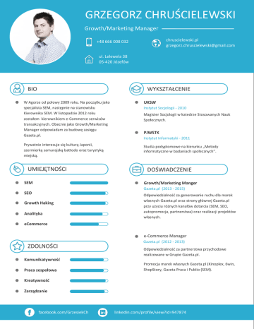 GRZEGORZ CHRUŚCIELEWSKI Growth/Marketing Manager tt chruscielewski.pl [email protected] +48 666 008 032 ul. Lelewela 38 05-420 Józefów BIO WYKSZTAŁCENIE W Agorze od połowy 2009 roku. Na początku jako specjalista SEM, następnie na stanowisku Kierownika SEM. W listopadzie 2012 roku zostałem kierownikiem e-Commerce serwisów transakcyjnych. Obecnie jako Growth/Marketing Manager odpowiadam za budowę zasięgu Gazeta.pl. Prywatnie interesuje się kulturą Japonii, szermierką samurajską battodo oraz turystyką miejską. UMIEJĘTNOŚCI SEM UKSW Instytut Socjologii - 2010 Magister Socjologii w katedrze Stosowanych Nauk Społecznych. PJWSTK Instytut Informatyki - 2011 Studia podyplomowe na kierunku „Metody informatyczne w badaniach społecznych”. DOŚWIADCZENIE Growth/Marketing Manger Gazeta.pl (2013 - 2015) SEO Growth Haking Analityka Odpowiedzialność za generowanie ruchu dla marek własnych Gazeta.pl oraz strony głównej Gazeta.pl przy użyciu różnych kanałów dotarcia (SEM, SEO, autopromocja, partnerstwa) oraz realizacji projektów własnych. eCommerce e-Commerce Manager ZDOLNOŚCI Gazeta.pl (2012 - 2013) Odpowiedzialność za partnerstwa przychodowe realizowane w Grupie Gazeta.pl. Komunikatywność Praca zespołowa Promocja marek własnych Gazeta.pl (Kinoplex, 6win, ShopStory, Gazeta Praca i Publio (SEM). Kreatywność Zarządzanie facebook.com/GrzesiekCh linkedin.com/profile/view?id=947874 66
