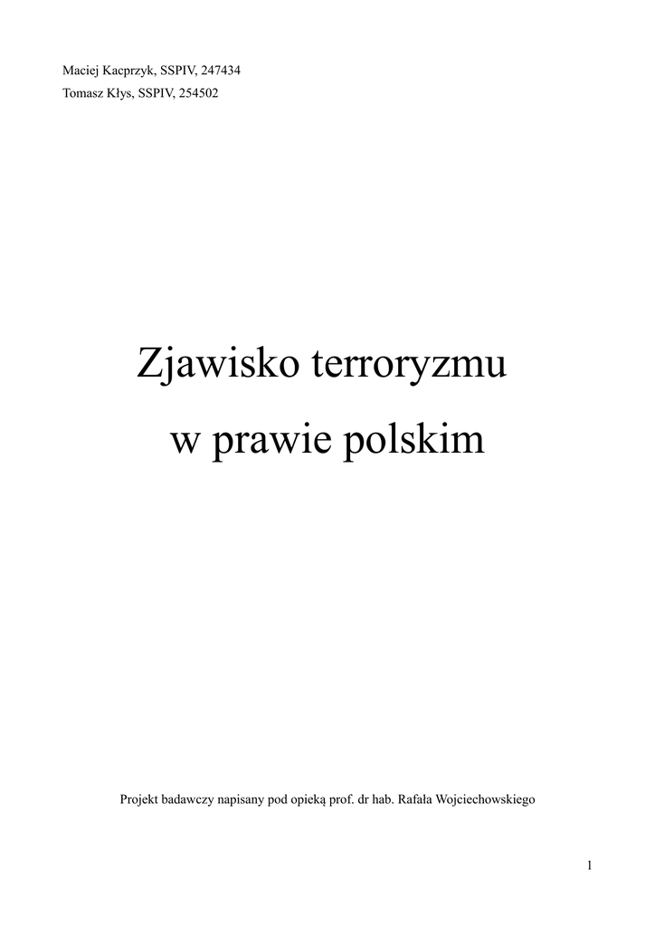Maciej Kacprzyk, SSPIV, 247434 Tomasz Kłys, SSPIV, 254502 Zjawisko terroryzmu w prawie polskim Projekt badawczy napisany pod opieką prof. dr hab. Rafała Wojciechowskiego 1 Wstęp Głównym celem niniejszego opracowania jest omówienie zjawiska terroryzmu, które od dawna towarzyszy państwom całego globu, a także próba zbadania koncepcji walki ze zjawiskiem przestępczości terrorystycznej na gruncie polskiego prawa oraz wypracowanie jednolitej siatki pojęciowej, niezbędnej do właściwego zrozumienia zjawiska. Przedmiotem rozważań będą zatem następujące grupy zagadnień, uporządkowane w trzech częściach prezentowanego artykułu: przeprowadzenie analizy pojęcia: „terroryzm”, analiza źródeł prawa regulujących kwestię zwalczania terroryzmu, a także ukazania wzajemnych relacji i ewentualnych niespójności między nimi, dokonanie analizy organów zajmujących się przeciwdziałaniem oraz zwalczaniem terroryzmu Duża część pracy poświęcona została zagadnieniom definicyjnym z racji braku przejrzystości znaczeniowej zjawiska terroryzmu. Z uwagi na obszerność zagadnienia, aspekt terroryzmu został ograniczony do zagadnień krajowych. Dla wielu Polaków terroryzm zawsze był zjawiskiem egzotycznym, historycznie niewystępującym na terytorium Polski. To wrażenie nie jest do końca słuszne, zwłaszcza w kontekście burzliwej historii naszego kraju. Przede wszystkim zamachy terrorystyczne nie były bronią nieznaną zniewolonym narodom europejskim, nie jest więc zaskoczeniem iż posługiwano się nią także w walce o niepodległość Polski, czego materialny dowód stanowiły choćby trudne do ukrycia rany międzywojennego premiera Walerego Sławka. Przykładami głośnych i znaczących ataków terrorystycznych są np. zamach na Józefa Piłsudskiego we Lwowie w 1921 r., wybuch w Cytadeli w 1923 r., czy zamach bombowy w Tarnowie 1939 r. Do 2001 r. wiedza Polaków o terroryzmie była znikoma i ograniczona wyłącznie do informacji przekazywanych w mediach lub przez polityków. Dopiero ataki na World Trade Center z 2001 r., na madrycką kolej w 2004 r. i londyńskie metro w 2005 r. sprawiły, że terroryzm jest obecny w świadomości nie tylko osób i instytucji odpowiedzialnych za bezpieczeństwo państwa, ale także ich obywateli. Po tamtych wydarzeniach, w szczególności zamachach z 11 września, rozpoczęto światową walkę z terroryzmem, której początkiem była wojna w Afganistanie. Towarzyszyły im liczne zmiany w prawie. Powodem do dumy jest fakt, iż w najnowszej historii Polski nie odnotowano przypadków 2 zamachów terrorystycznych na terytorium naszego kraju. Większość światowych zamachów terrorystycznych miało miejsce na bliskim wschodzie, zaś europejskich w: Wielkiej Brytanii, Hiszpanii i Francji1. Terminologia Zjawisko terroryzmu jest bardzo trudne do jednoznacznego zdefiniowania. Wynika to z wielopłaszczyznowości i niejednoznaczności pojęć, a także z odmienności punktu widzenia uczestników wydarzeń.2 Skutkiem tego jest fakt, iż można tworzyć różne definicje, które charakteryzować będą tylko konkretny przypadek, nie znajdując zastosowania w odniesieniu do innych sytuacji. Pojęcie „terroryzm” wywodzi się od słowa terror, które z kolei pochodzi z języka łacińskiego i oznacza „stosowanie przemocy, gwałtu, okrucieństwa w celu zastraszenia kogoś”. Zaś „oddziaływanie za pomocą strachu, gwałtu, represji, groźby, stosowania terroru wobec kogoś, prześladowania” nazywane jest terroryzowaniem. Tak terroryzm został opisany w oksfordzkim słowniku języka angielskiego już w 1795 roku i tak był definiowany aż do lat 30. XX wieku jako „rządy poprzez zastraszenie, sprawowane przez siły będące u władzy”. Przyczynkiem do stworzenia takiego hasła w słowniku były niezwykle brutalne wydarzenia porewolucyjnej Francji w latach 1792-1794 r. Jednakże w miarę rozwoju społecznego, ta forma oddziaływania rozszerzała swój zakres podmiotowy i przedmiotowy. Warto przy tym zwrócić uwagę na fakt, iż przez wiele dziesięcioleci termin „terroryzm” był używanym w kontekście historycznym, a nie współczesnym i odnosił się wyłącznie do opisu określonego rodzaju reżimu politycznego. Jedna z definicji mówi, iż terroryzm to zmienna w czasie i przestrzeni metoda działalności politycznej, uwzględniająca tradycję i sposoby walki politycznej charakterystyczne dla danej kultury politycznej (cywilizacji), nielegalna w świetle obowiązującego prawa stanowionego, oddziałująca na sferę psychiki ludzkiej i wprowadzająca stan poczucia zagrożenia i strachu u adresatów zamachów (zarówno bezpośrednich, jak i pośrednich) oraz wymuszająca na nich określone zachowania zgodne z celami stosujących ją uczestników polityki.3 Według kolejnej definicji terroryzm jest szczegółowym rodzajem działalności destrukcyjnej, skierowanej zarówno przeciwko pojedynczym osobom aparatu władzy (terroryzm indywidualny), jak również przeciwko przypadkowym członkom społeczeństwa przez zamachy na policjantów, urzędników czy cywili (terroryzm zbiorowy), powodując ofiary oraz wywołując atmosferę strachu. 1 Lista zamachów wraz uwypukleniem eskalacji zagrożenia jest dostępna na stronie internetowej pod adresem: http://pl.wikipedia.org/wiki/Lista_zamach%C3%B3w_terrorystycznych. 2 Waldemar Zubrzycki, Przeciwdziałanie zagrożeniom terrorystycznym w Polsce, Warszawa 2011, s. 15. 3 Ryszard Grosset, Zabić tysiące, przestraszyć miliony. Zagrożenia terrorystyczne i szanse na skuteczną obronę, Warszawa 2009, s. 17. 3 Ofiarami takiej działalności są politycy, wojskowi, policjanci, a także zwykli obywatele, bez względu na płeć, wiek, czy wykształcenie.4 „Słownik współczesnego języka polskiego” przedstawia słowo „terror” jako stosowanie przemocy, gwałtu, okrucieństwa w celu zastraszenia, zniszczenia przeciwnika. Z kolei termin „terroryzm”, według tego samego słowni