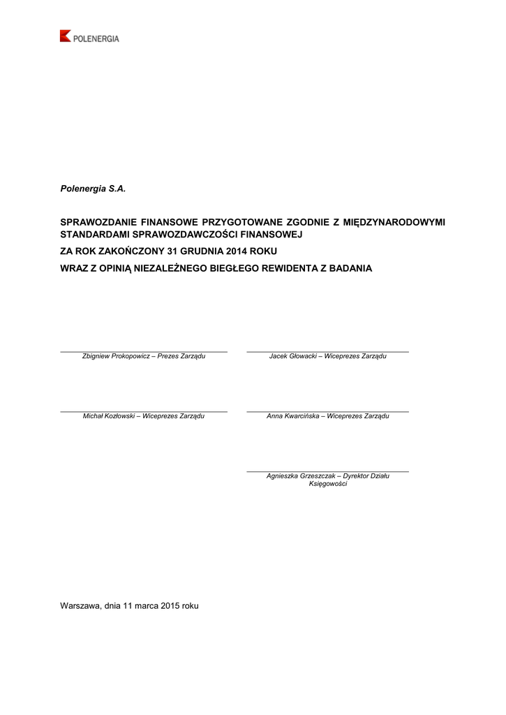 Polenergia S.A. SPRAWOZDANIE FINANSOWE PRZYGOTOWANE ZGODNIE Z MIĘDZYNARODOWYMI STANDARDAMI SPRAWOZDAWCZOŚCI FINANSOWEJ ZA ROK ZAKOŃCZONY 31 GRUDNIA 2014 ROKU WRAZ Z OPINIĄ NIEZALEŻNEGO BIEGŁEGO REWIDENTA Z BADANIA Zbigniew Prokopowicz – Prezes Zarządu Jacek Głowacki – Wiceprezes Zarządu Michał Kozłowski – Wiceprezes Zarządu Anna Kwarcińska – Wiceprezes Zarządu Agnieszka Grzeszczak – Dyrektor Działu Księgowości Warszawa, dnia 11 marca 2015 roku 1 Polenergia S.A. Sprawozdanie finansowe za rok kończący się 31 grudnia 2014 roku (w tysiącach złotych) Spis treści 1. Bilans .............................................................................................................................................. 6 2. Rachunek zysków i strat ................................................................................................................. 7 3. Sprawozdanie z innych dochodów ................................................................................................. 7 4. Zestawienie zmian w kapitale własnym .......................................................................................... 8 5. Sprawozdanie z przepływów pieniężnych .................................................................................... 10 6. Informacje ogólne ......................................................................................................................... 12 6.1. Czas trwania Spółki ................................................................................................................... 12 6.2. Wskazanie okresów, za które prezentowane jest sprawozdanie finansowe ............................. 12 6.3. Skład osobowy Zarządu oraz Rady Nadzorczej........................................................................ 12 7. Założenie kontynuacji działalności gospodarczej ......................................................................... 13 8. Identyfikacja skonsolidowanego sprawozdania finansowego ...................................................... 13 9. Zatwierdzenie sprawozdania finansowego ................................................................................... 13 10. Inwestycje Spółki ....................................................................................................................... 13 11. Przyjęte zasady (polityka) rachunkowości ................................................................................. 17 11.1. Nowe standardy i interpretacje, zatwierdzone przez UE, które nie weszły jeszcze w życie . 17 11.2. Nowe standardy i interpretacje, nie zatwierdzone przez UE ................................................. 19 11.3. Podstawa sporządzenia sprawozdania finansowego ............................................................ 24 11.4. Istotne wartości oparte na profesjonalnym osądzie .............................................................. 24 11.5. Istotne wartości oparte na szacunkach ................................................................................. 24 11.6. Waluta pomiaru i waluta sprawozdań finansowych ............................................................... 25 11.7. Wartości niematerialne .......................................................................................................... 25 11.8. Rzeczowe aktywa trwałe ....................................................................................................... 26 11.9. Rzeczowe aktywa trwałe w budowie ..................................................................................... 27 11.10. Koszty finansowania zewnętrznego ...................................................................................... 27 11.11. Utrata wartości niefinansowych aktywów trwałych ................................................................ 27 11.12. Nieruchomości inwestycyjne ................................................................................................. 28 11.13. Inwestycje w jednostkach zależnych, współzależnych i stowarzyszonych ........................... 28 11.14. Aktywa finansowe .................................................................................................................. 28 11.15. Utrata wartości aktywów finansowych ................................................................................... 30 11.16. Leasing .................................................................................................................................. 31 11.17. Zapasy ................................................................................................................................... 31 11.18. Należności krótko- i długoterminowe ..................................................................................... 32 11.19. Transakcje w walucie obcej ................................................................................................... 32 11.20. Środki pieniężne i ekwiwalenty środków pieniężnych ........................................................... 33 2 Dodatkowe noty objaśniające do sprawozdania finansowego załączone na stronach od 12 do 74 stanowią jego integralną część Polenergia S.A. Sprawozdanie finansowe za rok kończący się 31 grudnia 2014 roku (w tysiącach złotych) 11.21. Rozliczenia międzyokresowe ................................................................................................ 33 11.22. Kapitał zakładowy .................................................................................................................. 33 11.23. Rezerwy ................................................................................................................................. 33 11.24. Rezerwy na nagrody jubileuszowe i odprawy emerytalne .................................................... 33 11.25. Oprocentowane kredyty bankowe, pożyczki i papiery dłużne ............................................... 34 11.26. Zobowiązania z