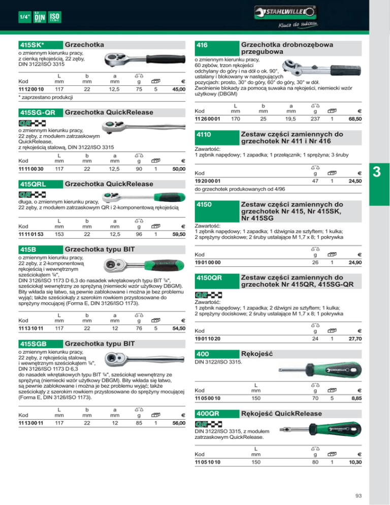 6.3 1/4'' ISO DIN 1174-1 3120 Grzechotka 415SK* ʻ Kod L mm b mm a mm R g S 117 22 12,5 75 5 ʻ 1112 00 10 Grzechotka drobnozębowa przegubowa 416 o zmiennym kierunku pracy, z cienką rękojeścią, 22 zęby, DIN 3122/ISO 3315 € 45,00 ʻ * zaprzestano produkcji ʻ o zmiennym kierunku pracy, 60 zębów, trzon rękojeści odchylany do góry i na dół o ok. 90°, ustalany i blokowany w następujących pozycjach: prosto, 30° do góry, 60° do góry, 30° w dół. Zwolnienie blokady za pomocą suwaka na rękojeści, niemiecki wzór użytkowy (DBGM) ʻ 415SG-QR Kod Grzechotka QuickRelease 11 26 00 01 Ü ü 4110 a mm R g S 170 25 19,5 237 1 L mm b mm a mm R g S 117 22 12,5 90 1 ʻ € 50,00 ʻ Zestaw części zamiennych do grzechotek Nr 411 i Nr 416 ʻ Kod R g S 47 1 ʻ 19 20 00 01 Grzechotka QuickRelease 415QRL do grzechotek produkowanych od 4/96 ʻ długa, o zmiennym kierunku pracy, 22 zęby, z modułem zatrzaskowym QR i 2-komponentową rękojeścią 4150 ʻ L mm b mm a mm R g S 153 22 12,5 96 1 ʻ 1111 01 53 € 24,50 ʻ Ü ü Kod € 68,50 Zawartość: 1 zębnik napędowy; 1 zapadka; 1 przełącznik; 1 sprężyna; 3 śruby ʻ 1111 00 30 b mm ʻ o zmiennym kierunku pracy, 22 zęby, z modułem zatrzaskowym QuickRelease, z rękojeścią stalową, DIN 3122/ISO 3315 Kod L mm ʻ € 59,50 ʻ Zestaw części zamiennych do grzechotek Nr 415, Nr 415SK, Nr 415SG Zawartość: 1 zębnik napędowy; 1 zapadka; 1 dźwignia ze sztyftem; 1 kulka; 2 sprężyny dociskowe; 2 śruby ustalające M 1,7 x 8; 1 pokrywka ʻ Grzechotka typu BIT 415B o zmiennym kierunku pracy, 22 zęby, z 2-komponentową rękojeścią i wewnętrznym sześciokątem 1/4'', DIN 3126/ISO 1173 D 6,3 do nasadek wkrętakowych typu BIT 1/4'', sześciokąt wewnętrzny ze sprężyną (niemiecki wzór użytkowy DBGM). Bity wkłada się łatwo, są pewnie zablokowane i można je bez problemu wyjąć; także sześciokąty z szerokim rowkiem przystosowane do sprężyny mocującej (Forma E, DIN 3126/ISO 1173). ʻ Kod L mm b mm a mm R g S 117 22 12 76 5 ʻ 1113 10 11 € 54,50 ʻ Kod R g S 26 1 ʻ 19 01 00 00 4150QR Zestaw części zamiennych do grzechotek Nr 415QR, 415SG-QR Ü ü Zawartość: 1 zębnik napędowy; 1 zapadka; 2 dźwigni ze sztyftem; 1 kulka; 2 sprężyny dociskowe; 2 śruby ustalające M 1,7 x 8; 1 pokrywka ʻ R g S 24 1 L mm R g S 150 70 5 Kod 19 0110 20 Grzechotka typu BIT 24,90 ʻ ʻ 415SGB € € 27,70 ʻ o zmiennym kierunku pracy, 22 zęby, z rękojeścią stalową i wewnętrznym sześciokątem 1/4'', DIN 3126/ISO 1173 D 6,3 do nasadek wkrętakowych typu BIT 1/4'', sześciokąt wewnętrzny ze sprężyną (niemiecki wzór użytkowy DBGM). Bity wkłada się łatwo, są pewnie zablokowane i można je bez problemu wyjąć; także sześciokąty z szerokim rowkiem przystosowane do sprężyny mocującej (Forma E, DIN 3126/ISO 1173). 400 Rękojeść DIN 3122/ISO 3315. ʻ Kod ʻ 11 05 00 10 € 8,85 ʻ ʻ Kod L mm b mm a mm R g S 117 22 12 85 1 ʻ 1113 00 11 ʻ 400QR € 56,00 Rękojeść QuickRelease Ü ü DIN 3122/ISO 3315, z modułem zatrzaskowym QuickRelease. ʻ Kod L mm R g S 150 80 1 ʻ 11 05 10 10 € 10,30 ʻ 93 3 Zestawy naprawcze do grzechotek wtykowych Nr 725QR, Nr 735 Zestaw części zamiennych 4150QR ʻ Kod Ü ü 59 25 10 10 R g S 735/10 96 1 do grzechotek produkowanych od 12/97 ʻ R g S 725QR/4 24 1 ʻ Zestaw części zamiennych 7350/20 do Nr € 28,80 ʻ ʻ 19 01 10 20 do Nr ʻ Zawartość: 1 zębnik napędowy; 1 zapadka; 2 dźwigni ze sztyftem; 1 kulka; 2 sprężyny dociskowe; 2 śruby ustalające M 1,7 x 8; 1 pokrywka Kod Zestaw części zamiennych 7350/10 Zawartość: 1 zębnik napędowy, 1 zapadka, 1 przełącznik, 1 sprężyna, 3 śruby € 27,70 Zawartość: 1 zębnik napędowy, 1 zapadka, 1 przełącznik, 1 sprężyna, 3 śruby ʻ ʻ Zestaw części zamiennych 4350QR Kod do Nr R g S 735/20 146 1 ʻ 59 25 10 20 Ü ü € 28,70 ʻ do grzechotek produkowanych od 4/96 Zawartość: 1 zębnik napędowy, 1 zapadka, 1 dźwignia przełącznika ze sztyftem, 1 kulka, 2 sprężyny dociskowe, 2 śruby ustalające ʻ Zestaw części zamiennych 7350/40 ʻ Kod do Nr R g S 725QR/5 51 1 ʻ 19 02 00 20 € 27,70 Zawartość: 1 zębnik napędowy, 1 zapadka, 1 przełącznik, 1 sprężyna, 3 śruby ʻ do Nr R g S 735/40 219 1 ʻ Kod ʻ 7250QR/10 Zestaw części zamiennych 59 25 10 40 € 35,40 ʻ Ü ü do grzechotek produkowanych od 5/97 ʻ Zawartość: 1 zębnik napędowy, 1 zapadka, 1 dźwignia ze sztyftem, 1 kulka, 2 sprężyny dociskowe, 2 śruby ustalające ʻ Kod 19 04 10 20 do kluczy dynamometrycznych i końcówek wtykowych do Nr R g S 725QR/10 64 1 ʻ Element przejściowy z czworokątem 70V 5 € 27,10 ʻ 5120QR ʻ Zestaw części zamiennych Kod Ü ü rozm. do Nr Zawartość: 1 zębnik napędowy, 1 zapadka, 1 dźwignia ze sztyftem, 1 kulka, 2 sprężyny dociskowe, 2 śruby ustalające 59 01 00 01 1 71...V/1 734/4 59 01 00 14 11 3 734/5 59 01 00 03 5 734/10 59 01 00 05 59 01 00 11 502 1/2 720/30; 734/20 7 721/30 59 01 00 07 8 734/40 59 01 00 08 59 01 00 15 12 720Nf/80; 721Nf/80+100 1 ʻ Kod do Nr R g S 725QR/20 127 1 ʻ 19 04 00 20 a '' b '' L mm R g S 1/4 3/8 3/8 3/8 1/4 1/4 3/8 1/2 1/2 1/2 3/4 3/4 1/2 1/2 3/4 3/4 17,5 22 25,8 30 33,5 44,3 52,2 65 5 12 17 28 39 52 138 179 ʻ € 28,60 ʻ 5 5 5 5 5 5 5 1 € 11,30 12,40 9,65 11,70 7,25 9,15 17,80 18,70 ʻ 7350/5 Zestaw części zamiennych Bez kulki i pinu. Optymalne wyniki pomiarów dzięki zredukowaniu efektu bocznych sił. ʻ Kod do Nr R g S 735/5 85 1 ʻ 59 25 10 05 Element z czworokątem do mocowania w przetworniku 70VK Zawartość: 1 zębnik napędowy, 1 zapadka, 1 przełącznik, 1 sprężyna, 3 śruby € 26,20 ʻ do grzechotek produkowanych od 12/97 ʻ ʻ rozm. do Nr a « b « L mm R g S 59 01 10 14 11 3 59 01 10 03 59 01 10 11 502 1/2 8 59 01 10 08 734/4 734/5 734/20 734/40 3/8 3/8 1/2 3/4 1/4 3/8 1/2 3/4 24,7 27,6 36,9 52,2 15 20 60 147 Kod ʻ 5 5 5 5 € 12,40 9,65 7,25 17,80 ʻ 183