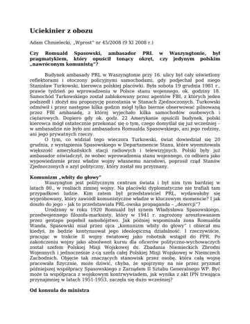 Uciekinier z obozu Adam Chmielecki, „Wprost” nr 45/2008 (9 XI 2008 r.) Czy Romuald Spasowski, ambasador PRL pragmatykiem, który opuścił tonący okręt, „nawróconym komunistą”? w Waszyngtonie, był czy jedynym polskim Budynek ambasady PRL w Waszyngtonie przy 16. ulicy był cały oświetlony reflektorami i otoczony policyjnymi samochodami, gdy podjechał pod niego Stanisław Turkowski, kierowca polskiej placówki. Była sobota 19 grudnia 1981 r., prawie tydzień po wprowadzeniu w Polsce stanu wojennego, ok. godziny 18. Samochód Turkowskiego został zablokowany przez agentów FBI, z których jeden podszedł i złożył mu propozycję pozostania w Stanach Zjednoczonych. Turkowski odmówił i przez następne kilka godzin mógł tylko biernie obserwować pilnowaną przez FBI ambasadę, z której wyjechało kilka samochodów osobowych i ciężarowych. Dopiero gdy ok. godz. 22 Amerykanie opuścili budynek, polski kierowca mógł ostatecznie przekonać się o tym, czego domyślał się już wcześniej – w ambasadzie nie było ani ambasadora Romualda Spasowskiego, ani jego rodziny, ani jego prywatnych rzeczy. O tym, co widział tego wieczora Turkowski, świat dowiedział się 20 grudnia, z wystąpienia Spasowskiego w Departamencie Stanu, które wyemitowała większość amerykańskich stacji radiowych i telewizyjnych. Polski były już ambasador oświadczył, że wobec wprowadzenia stanu wojennego, co odbiera jako wypowiedzenie przez władze wojny własnemu narodowi, poprosił rząd Stanów Zjednoczonych o azyl polityczny, który został mu przyznany. Komunizm „wbity do głowy” Waszyngton jest politycznym centrum świata i był nim tym bardziej w latach 80., w realiach zimnej wojny. Na placówki dyplomatyczne nie trafiali tam przypadkowi ludzie. Kim zatem był przedstawiciel PRL, wydawałoby się wypróbowany, który zawiódł komunistyczne władze w kluczowym momencie? I jak doszło do jego – jak to przedstawiała PRL-owska propaganda – „dezercji”? Urodzony w roku 1920 Romuald był synem Władysława Spasowskiego, przedwojennego filozofa-marksisty, który w 1941 r. zagrożony aresztowaniem przez gestapo popełnił samobójstwo. Jak później wspominała żona Romualda Wanda, Spasowski miał przez ojca „komunizm wbity do głowy” i obiecał mu kiedyś, że będzie kontynuował jego ideologiczną działalność. I rzeczywiście, pracując w trakcie II wojny światowej jako robotnik wstąpił do PPR. Po zakończeniu wojny jako absolwent kursu dla oficerów polityczno-wychowaczych został szefem Polskiej Misji Wojskowej ds. Zbadania Niemieckich Zbrodni Wojennych i jednocześnie z-cą szefa całej Polskiej Misji Wojskowej w Niemczech Zachodnich. Objęcie tak znaczących stanowisk przez osobę, która całą wojnę pracowała fizycznie, może dziwić, chyba, że spojrzymy na nie przez pryzmat późniejszej współpracy Spasowskiego z Zarządem II Sztabu Generalnego WP. Być może ta współpraca z wojskowym kontrwywiadem, jak wynika z akt IPN trwająca przynajmniej w latach 1951-1953, zaczęła się dużo wcześniej? Od konsula do ministra W 1947 r. Spasowski odszedł z wojska i rozpoczął karierę w MSZ, w trakcie której pełnił kolejno funkcje konsula w Dusseldorfie, naczelnika Wydziału Niemieckiego Departamentu V, I sekretarza ambasady w Londynie oraz Posła PRL w Buenos Aires. W l. 1955-1961 po raz pierwszy był ambasadorem PRL w Waszyngtonie. W latach 60. i 70. piastował wysokie funkcje – „na zmianę” w placówkach dyplomatycznych (przedstawiciel PRL przy Międzynarodowej Komisji Nadzoru i Kontroli w Wietnamie, ambasador w Indiach, Nepalu, Singapurze i na Cejlonie) oraz w centrali (dyrektor Departamentu II i V, od 1962 r. ambasador tytularny, od 1972 r. wiceminister spraw zagranicznych). Musiał cieszyć się zatem zaufaniem i poparciem nie tylko kolejnych szefów resortu, ale najwyższych władz państwowych – dyplomaci wracający z placówek nie cieszący się taką sympatią zostawali co najwyżej radcami w MSZ (całkowitą rezygnację z danej osoby uważano za małą pragmatyczną i stosowano niezwykle rzadko). W tym okresie w życiu Spasowskiego nastąpiło też przykre zdarzenie – w 1970 r. w New Delhi samobójstwo popełnił jego syn, Władysław. Być może był to przypadek, być może rodzinne fatum, być może zaś ukochany syn ambasadora nie potrafił zaakceptować jego kariery w komunistycznej dyplomacji. Drugie podejście – kurs proamerykański Wreszcie 1 grudnia 1977 r. Romuald Spasowski został po raz drugi ambasadorem PRL w Stanach Zjednoczonych, co ciekawe zastępując na tym stanowisku Witolda Trąmpczyńskiego, syna Wojciecha Trąmpczyńskiego, przedwojennego działacza endecji i marszałka Sejmu Ustawodawczego. W Waszyngtonie Spasowski pojawił się dopiero w marcu 1978 r. i od razu wprowadził nowy, proamerykański kurs. Nie podobał się on dotychczasowym pracownikom ambasady, którzy Spasowskich nie lubili, oraz centrali MSZ, która w listopadzie 1981 r. postanowiła odwołać ambasadora na początku 1982 r. Spasowski zafascynował się „Solidarnością” i Sierpniem ’80, miał coraz lepsze kontakty – wziąwszy pod uwagę ideologiczne i polityczne różnice obu obozów zimnej wojny – z amerykańską administracją i coraz gorsze z ambasadą Związku Sowieckiego w USA (m.in. unikał kontaktu z sowieckim ambasadorem Anatolijem Dobryninem). Szczególnie blisko współpracował z Richardem Daviesem, dyrektorem Biura Europy Wschodniej Departamentu Stanu, wcześniej ambasadorem USA w Polsce, oraz Johnem Scanlanem, z-cą asystenta sekretarza stanu ds. Europy. Wydaje się, że z racji tych proamerykańskich sympatii bardzo szybko zaczął rozważać możliwość „przejścia na drugą stronę barykady” i pozostania w USA. Stopniowo sprowadzał do Stanów rodzinę i przyjaciół – w 1978 r. reż. Jerzego Antczaka (został radcą ambasady ds. kultury), a w 1981 r. żonę Marię z mężem Andrzejem Grochulskim oraz przyjaci