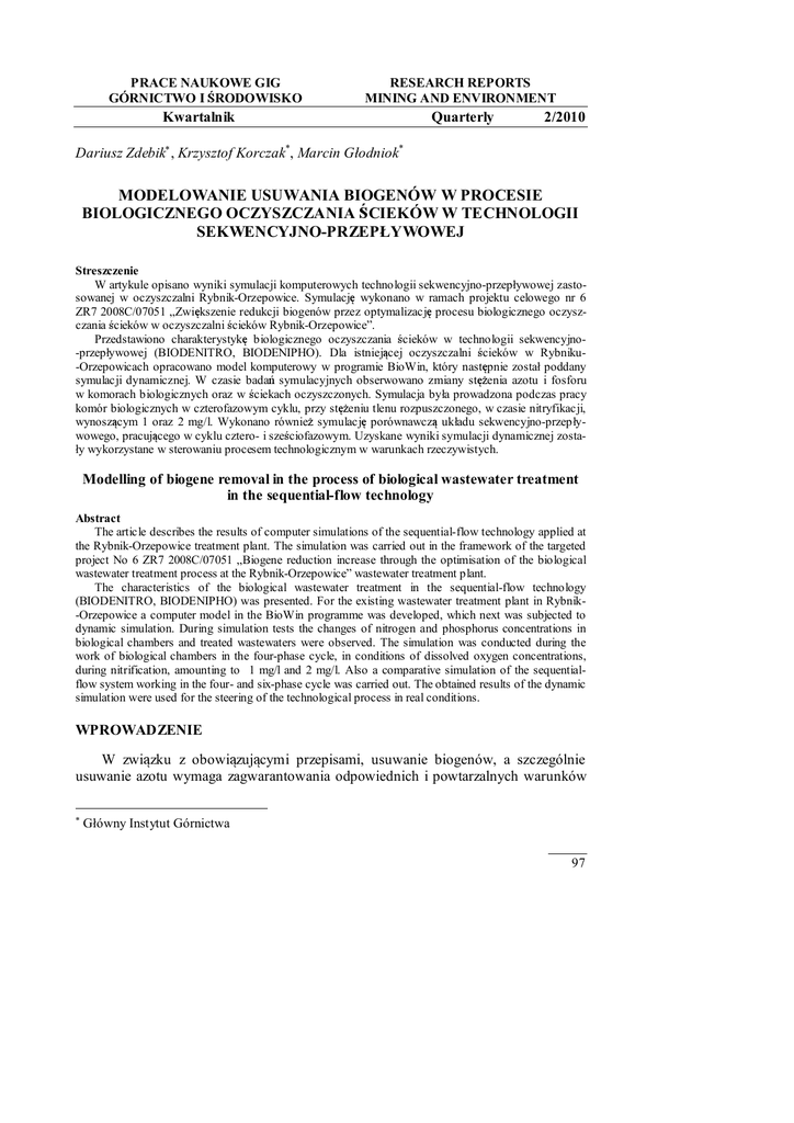 PRACE NAUKOWE GIG GÓRNICTWO I ŚRODOWISKO RESEARCH REPORTS MINING AND ENVIRONMENT Kwartalnik Quarterly 2/2010 Dariusz Zdebik∗ , Krzysztof Korczak*, Marcin Głodniok* MODELOWANIE USUWANIA BIOGENÓW W PROCESIE BIOLOGICZNEGO OCZYSZCZANIA ŚCIEKÓW W TECHNOLOGII SEKWENCYJNO-PRZEPŁYWOWEJ Streszczenie W artykule opisano wyniki symulacji komputerowych technologii sekwencyjno-przepływowej zastosowanej w oczyszczalni Rybnik-Orzepowice. Symulację wykonano w ramach projektu celowego nr 6 ZR7 2008C/07051 „Zwiększenie redukcji biogenów przez optymalizację procesu biologicznego oczyszczania ścieków w oczyszczalni ścieków Rybnik-Orzepowice”. Przedstawiono charakterystykę biologicznego oczyszczania ścieków w technologii sekwencyjno-przepływowej (BIODENITRO, BIODENIPHO). Dla istniejącej oczyszczalni ścieków w Rybniku-Orzepowicach opracowano model komputerowy w programie BioWin, który następnie został poddany symulacji dynamicznej. W czasie badań symulacyjnych obserwowano zmiany stężenia azotu i fosforu w komorach biologicznych oraz w ściekach oczyszczonych. Symulacja była prowadzona podczas pracy komór biologicznych w czterofazowym cyklu, przy stężeniu tlenu rozpuszczonego, w czasie nitryfikacji, wynoszącym 1 oraz 2 mg/l. Wykonano również symulację porównawczą układu sekwencyjno-przepływowego, pracującego w cyklu cztero- i sześciofazowym. Uzyskane wyniki symulacji dynamicznej zostały wykorzystane w sterowaniu procesem technologicznym w warunkach rzeczywistych. Modelling of biogene removal in the process of biological wastewater treatment in the sequential-flow technology Abstract The article describes the results of computer simulations of the sequential-flow technology applied at the Rybnik-Orzepowice treatment plant. The simulation was carried out in the framework of the targeted project No 6 ZR7 2008C/07051 „Biogene reduction increase through the optimisation of the biological wastewater treatment process at the Rybnik-Orzepowice” wastewater treatment plant. The characteristics of the biological wastewater treatment in the sequential-flow technology (BIODENITRO, BIODENIPHO) was presented. For the existing wastewater treatment plant in Rybnik-Orzepowice a computer model in the BioWin programme was developed, which next was subjected to dynamic simulation. During simulation tests the changes of nitrogen and phosphorus concentrations in biological chambers and treated wastewaters were observed. The simulation was conducted during the work of biological chambers in the four-phase cycle, in conditions of dissolved oxygen concentrations, during nitrification, amounting to 1 mg/l and 2 mg/l. Also a comparative simulation of the sequentialflow system working in the four- and six-phase cycle was carried out. The obtained results of the dynamic simulation were used for the steering of the technological process in real conditions. WPROWADZENIE W zwią zku z obowiązującymi przepisami, usuwanie biogenów, a szczególnie usuwanie azotu wymaga zagwarantowania odpowiednich i powtarzalnych warunków ∗ Główny Instytut Górnictwa 97 Mining and Environment prowadzenia procesu technologicznego, przy zmiennych warunkach dopływu ładunku zanieczyszczeń (Imhoff K., Imhoff K.R. 1996). W modelowaniu usuwania azotu w oczyszczalni pracującej w technologii sekwencyjno-przepływowej, muszą być uwzględniane parametry technologiczne układu oraz rozkład ładunku zanieczyszczeń, jaki jest kierowany do komór biologicznych. Przygotowanie modelu komputerowego do symulacji zmian w układzie, pozwala na określenie możliwości zintensyfikowania procesów biologicznego usuwania azotu podczas prowadzenia nitryfikacji i denitryfikacji. Intensyfikacja usuwania azotu pozwala na wyznaczanie parametrów krytycznych, które mają wpływ na prawidłowy przebieg procesów biologicznych w komorach osadu czynnego (Zdebik i in. 2009). Rozpoznanie warunków przemian azotu zachodzących w technologii sekwencyjno-przepływowej, ze względu na unikalne stosowanie takich rozwią zań w oczyszczalniach ścieków obsługujących duże aglomeracje miejskie oraz określenie ich zale żności w okresach zimowych, letnich oraz przejściowych, jest pomocne przy opracowywaniu modelu sterowania pracą oczyszczalni (Heidrich, Witkowski 2005). Na podstawie opracowanego modelu komputerowego wykonano symulację pracy oczyszczalni, wprowadzając jej zmienne warunki, spowodowane obciążeniem hydraulicznym lub ładunkiem zanieczyszczeń. Symulacje takie umożliwią ocenę efektywności oczyszczania ścieków w warunkach rzeczywistych, z uwzględnieniem wpływu zmiany temperatury lub dozowania reagentów. Przeprowadzenie symulacji przy zmiennych warunkach obciążenia oczyszczalni i wariantach prowadzenia technologii biologicznego usuwania biogenów, stanowi ważny etap poprzedzający zmodyfikowanie rzeczywistego układu technologicznego (Zdebik i in. 2008). Model komputerowy został opracowany w programie BioWin, zakupionym z dotacji Wojewódzkiego Funduszu Ochrony Środowiska i Gospodarki Wodnej w Katowicach (Zdebik i in. 2009). 1. TECHNOLOGIA SEKWENCYJNO-PRZEPŁYWOWA Technologia sekwencyjno-przepływowa BIODENITRO, BIOBENIPHO została opracowana w duńskiej firmie Krüger; polega ona na przemiennej pracy pary komór, w których zachodzi usuwanie azotu. W technologii BIODENITRO, w systemie czterofazowym, dopływ ścieków w fazie 1 następuje do komory A (denitryfikacja). W tym samym czasie w komorze B następuje nitryfikacja. Po upływie zadanego czasu w systemie sterowania rozpoczyna się faza 2, podczas której następuje przepływ ścieków z komory A (denitryfikacja) do komory B (nitryfikacja). Proces ten jest uzale żniony od czasu nastawy. Faza 3 jest odwrotnością fazy 1, tzn. dopływ ścieków następuje do komory B (denitryfikacja), a w komorze A zachodzi nitryfikacja. W fazie 4 następuje przepływ ścieków z komory B do komory A. W systemie sześciofazowym, w komorach A i B zachodzi dodatkow