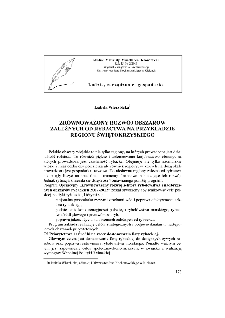 Studia i Materiały. Miscellanea Oeconomicae Rok 15, Nr 2/2011 Wydział Zarządzania i Administracji Uniwersytetu Jana Kochanowskiego w Kielcach Ludzie, zarządzanie, gospodarka Izabela Wierzbicka1 ZRÓWNOWAśONY ROZWÓJ OBSZARÓW ZALEśNYCH OD RYBACTWA NA PRZYKŁADZIE REGIONU ŚWIĘTOKRZYSKIEGO Polskie obszary wiejskie to nie tylko regiony, na których prowadzona jest działalność rolnicza. To równieŜ piękne i zróŜnicowane krajobrazowo obszary, na których prowadzona jest działalność rybacka. Obejmuje nie tylko nadmorskie wioski i miasteczka czy pojezierza ale równieŜ regiony, w których na duŜą skalę prowadzona jest gospodarka stawowa. Do niedawna regiony zaleŜne od rybactwa nie mogły liczyć na specjalne instrumenty finansowe pobudzające ich rozwój. Jednak sytuacja zmieniła się dzięki osi 4 omawianego poniŜej programu. Program Operacyjny „ZrównowaŜony rozwój sektora rybołówstwa i nadbrzeŜnych obszarów rybackich 2007-2013” został stworzony aby realizować cele polskiej polityki rybackiej, którymi są: − racjonalna gospodarka Ŝywymi zasobami wód i poprawa efektywności sektora rybackiego, − podniesienie konkurencyjności polskiego rybołówstwa morskiego, rybactwa śródlądowego i przetwórstwa ryb, − poprawa jakości Ŝycia na obszarach zaleŜnych od rybactwa. Program zakłada realizację celów strategicznych i podjęcie działań w następujących obszarach priorytetowych: Oś Priorytetowa 1: Środki na rzecz dostosowania floty rybackiej. Głównym celem jest dostosowanie floty rybackiej do dostępnych Ŝywych zasobów oraz poprawa rentowności rybołówstwa morskiego. Ponadto waŜnym celem jest zapewnienie osłon społeczno-ekonomicznych, w związku z realizacją wymogów Wspólnej Polityki Rybackiej. 1 Dr Izabela Wierzbicka, adiunkt, Uniwersytet Jana Kochanowskiego w Kielcach. 173 Oś priorytetowa 2. Akwakultura, rybołówstwo śródlądowe, przetwórstwo i obrót produktami rybołówstwa i akwakultury. W zakresie rybactwa śródlądowego, główne działania koncentrować się będą w zakresie modernizacji istniejących gospodarstw chowu i hodowli ryb. MoŜliwe będą takŜe inwestycje w infrastrukturę, w tym na rzecz poprawy warunków pracy oraz higieny i jakości produktów. W ramach tej osi pomoc finansowa przyznawana będzie takŜe na inwestycje w przetwórstwo i obrót ryb, związane z jego modernizacją (nowe technologie, sprzęt, innowacyjne metody produkcji), a takŜe z zakresu higieny i bezpieczeństwa pracy oraz dostosowanie do wymogów ochrony środowiska bądź utrzymanie zatrudnienia w tym sektorze i przeszkolenia kadr. Oś Priorytetowa 3: Środki słuŜące wspólnemu interesowi. W ramach tej osi priorytetowej wspierane będzie polepszenie organizacji sektora rybackiego, np. poprzez ustanawianie oraz restrukturyzację uznanych organizacji producenckich. Wspierane będą takŜe działania innowacyjne, projekty pilotaŜowe i wymiana doświadczeń, jak równieŜ realizacja szeroko zakrojonych kampanii informacyjnych o spoŜyciu ryb i sektorze rybactwa w celu zwiększenia średniego spoŜycia w przeliczeniu na mieszkańca. Oś Priorytetowa 4: ZrównowaŜony rozwój obszarów zaleŜnych od rybactwa. Realizacja tej osi przyczynić się ma do aktywizacji społeczności na obszarach zaleŜnych od rybactwa, poprzez włączenie partnerów społecznych i gospodarczych z określonego obszaru do planowania i wdraŜania lokalnych inicjatyw, które pozwolą na rozwój tych terenów oraz poprawę jakości Ŝycia lokalnych społeczności związanych z rybactwem. W ramach przygotowanych przez te społeczności lokalnych strategii moŜliwe będzie realizowanie szeregu inwestycji i inicjatyw, m.in. w zakresie dywersyfikacji działalności gospodarczej oraz inwestycje na rzecz drobnej infrastruktury rybackiej. Oś Priorytetowa 5: Pomoc techniczna. Celem tej osi priorytetowej jest wsparcie administracyjne instytucji zaangaŜowanych we wdraŜanie i realizację Programu Operacyjnego. Oś priorytetowa 4 Programu Operacyjnego „ZrównowaŜony rozwój sektora rybołówstwa i nadbrzeŜnych obszarów rybackich 2007-2013” ma doprowadzić nie tylko do poprawy warunków Ŝycia na obszarach zaleŜnych od rybactwa, która zostanie osiągnięta dzięki wdraŜaniu projektów w ramach lokalnych strategii rozwoju obszarów rybackich (LSROR). Drugim, równie istotnym celem tej osi priorytetowej, jest rozwój inicjatyw i przedsiębiorczości wśród społeczności lokalnych. Oś priorytetowa 4 ma pobudzić ludność na obszarach lokalnych do róŜnorodnych inicjatyw, przełamania lokalnych barier oraz zachęcić do współpracy w ramach wspólnych projektów. Szansą na osiągnięcie tego celu są lokalne grupy rybackie (LGR) – podmioty zrzeszające przedstawicieli szeroko rozumianego sektora rybackiego, gminy i inne podmioty publiczne oraz przedstawicieli sektora społecznego – dobrowolne zrzeszenia działające na obszarach zaleŜnych od rybactwa. Partnerzy z tych trzech sektorów, dzięki współpracy przy opracowaniu 174 i wdraŜaniu lokalnej strategii rozwoju obszarów rybackich, uzyskują doświadczenie, które powinno zaprocentować w przyszłości. Lokalne grupy rybackie biorą udział w konkursie przeprowadzanym przez instytucję zarządzającą. W wyniku konkursu zostają wyłonione najlepsze lokalne grupy rybackie, które przygotowały najlepszą lokalną strategię rozwoju obszarów rybackich. Z wybranymi w ten sposób grupami instytucja zarządzająca podpisuje umowę na realizację strategii. Dzięki temu lokalne grupy rybackie mogą realizować roŜnego rodzaju operacje, wdraŜając stworzoną przez siebie strategię. Operacje mogły być przeprowadzane jedynie na terenie gmin, które weszły w skład wybranych w drodze konkursu lokalnych grup rybackich. Projekty operacji składane są przez beneficjentów do lokalnej grupy rybackiej, która ocenia ich zgodność i spójność z lokalną strategią rozwoju obszarów rybackich. Pozytywnie 