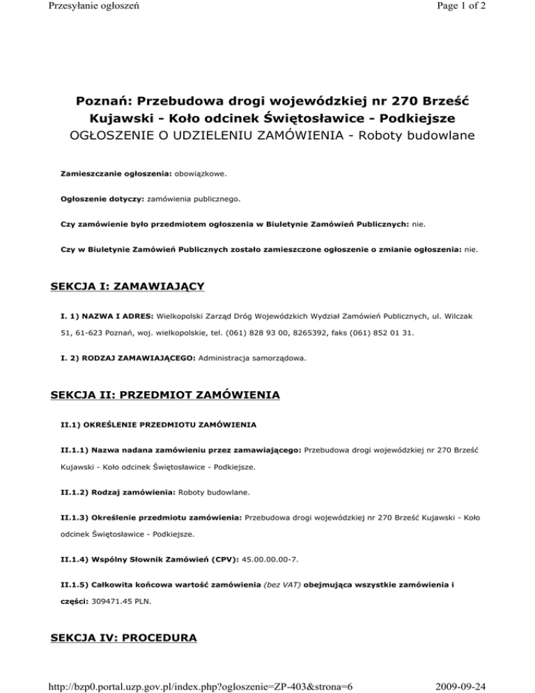 Przesyłanie ogłoszeń Page 1 of 2 Poznań: Przebudowa drogi wojewódzkiej nr 270 Brześć Kujawski - Koło odcinek Świętosławice - Podkiejsze OGŁOSZENIE O UDZIELENIU ZAMÓWIENIA - Roboty budowlane Zamieszczanie ogłoszenia: obowiązkowe. Ogłoszenie dotyczy: zamówienia publicznego. Czy zamówienie było przedmiotem ogłoszenia w Biuletynie Zamówień Publicznych: nie. Czy w Biuletynie Zamówień Publicznych zostało zamieszczone ogłoszenie o zmianie ogłoszenia: nie. SEKCJA I: ZAMAWIAJĄCY I. 1) NAZWA I ADRES: Wielkopolski Zarząd Dróg Wojewódzkich Wydział Zamówień Publicznych, ul. Wilczak 51, 61-623 Poznań, woj. wielkopolskie, tel. (061) 828 93 00, 8265392, faks (061) 852 01 31. I. 2) RODZAJ ZAMAWIAJĄCEGO: Administracja samorządowa. SEKCJA II: PRZEDMIOT ZAMÓWIENIA II.1) OKREŚLENIE PRZEDMIOTU ZAMÓWIENIA II.1.1) Nazwa nadana zamówieniu przez zamawiającego: Przebudowa drogi wojewódzkiej nr 270 Brześć Kujawski - Koło odcinek Świętosławice - Podkiejsze. II.1.2) Rodzaj zamówienia: Roboty budowlane. II.1.3) Określenie przedmiotu zamówienia: Przebudowa drogi wojewódzkiej nr 270 Brześć Kujawski - Koło odcinek Świętosławice - Podkiejsze. II.1.4) Wspólny Słownik Zamówień (CPV): 45.00.00.00-7. II.1.5) Całkowita końcowa wartość zamówienia (bez VAT) obejmująca wszystkie zamówienia i części: 309471.45 PLN. SEKCJA IV: PROCEDURA http://bzp0.portal.uzp.gov.pl/index.php?ogloszenie=ZP-403&strona=6 2009-09-24 Przesyłanie ogłoszeń Page 2 of 2 IV.1) TRYB UDZIELENIA ZAMÓWIENIA: Zamówienie z wolnej ręki IV.2) INFORMACJE ADMINISTRACYJNE Zamówienie dotyczy projektu/programu finansowanego ze środków Unii Europejskiej: nie SEKCJA V: UDZIELENIE ZAMÓWIENIA V.1) DATA UDZIELENIA ZAMÓWIENIA: 24.09.2009. V.2) LICZBA OTRZYMANYCH OFERT: 1. V.3) NAZWA I ADRES WYKONAWCY, KTÓREMU UDZIELONO ZAMÓWIENIA: Skanska S.A., ul. Gen. J. Zajączka 9, 01-518 Warszawa, kraj/woj. mazowieckie. V.4) INFORMACJA O CENIE WYBRANEJ OFERTY ORAZ O NIE PODLEGAJĄCYCH ODRZUCENIU OFERTACH Z NAJNIśSZĄ I NAJWYśSZĄ CENĄ (bez VAT) Cena wybranej oferty: 309471.45 Oferta z najniŜszą ceną: 309471.45 oferta z najwyŜszą ceną: 309471.45 Waluta: PLN. http://bzp0.portal.uzp.gov.pl/index.php?ogloszenie=ZP-403&strona=6 2009-09-24