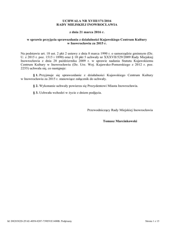 UCHWAŁA NR XVIII/171/2016 RADY MIEJSKIEJ INOWROCŁAWIA z dnia 21 marca 2016 r. w sprawie przyjęcia sprawozdania z działalności Kujawskiego Centrum Kultury w Inowrocławiu za 2015 r. Na podstawie art. 18 ust. 2 pkt 2 ustawy z dnia 8 marca 1990 r. o samorządzie gminnym (Dz. U. z 2015 r. poz. 1515 i 1890) oraz § 10 pkt 5 uchwały nr XXXVII/529/2009 Rady Miejskiej Inowrocławia z dnia 28 października 2009 r. w sprawie nadania Statutu Kujawskiemu Centrum Kultury w Inowrocławiu (Dz. Urz. Woj. Kujawsko-Pomorskiego z 2012 r. poz. 2255) uchwala się, co następuje: § 1. Przyjmuje się sprawozdanie z działalności Kujawskiego Centrum Kultury w Inowrocławiu za 2015 r. stanowiące załącznik do uchwały. § 2. Wykonanie uchwały powierza się Prezydentowi Miasta Inowrocławia. § 3. Uchwała wchodzi w życie z dniem podjęcia. Przewodniczący Rady Miejskiej Inowrocławia Tomasz Marcinkowski Id: D828382D-2FAE-4058-8207-739E91E1400B. Podpisany Strona 1 z 15 Załącznik do Uchwały Nr XVIII/171/2016 Rady Miejskiej Inowrocławia z dnia 21 marca 2016 r. Kujawskie Centrum Kultury w Inowrocławiu jest samorządową instytucją kultury wpisaną do rejestru instytucji kultury miasta Inowrocławia pod numerem 2 i posiada osobowość prawną. Funkcję dyrektora KCK do 30 czerwca 2015 roku sprawowała mgr Grażyna Ozorowska, a od 1 lipca instytucją kieruje mgr Monika Śliwińska. Do 5 grudnia 2009 roku placówka nosiła nazwę Inowrocławski Dom Kultury. Zgodnie ze statutem, celem Kujawskiego Centrum Kultury jest działanie na rzecz mieszkańców Inowrocławia w zakresie upowszechniania kultury poprzez przygotowanie różnych grup odbiorców do twórczego i aktywnego udziału w życiu kulturalnym oraz realizację zadań w zakresie wychowania przez sztukę. Działalność merytoryczna Kujawskiego Centrum Kultury przejawia się w różnorodnych formach, obejmując edukację kulturalną oraz wychowanie przez sztukę, gromadzenie, dokumentowanie, tworzenie, ochronę i udostępnianie dóbr kultury, sprawowanie opieki nad zabytkami gromadzonymi w Centrum, upowszechnianie i promocję dziejów miasta i Kujaw oraz prezentację wybitnych postaci związanych z miastem i regionem. Ponadto KCK stwarza warunki dla rozwoju folkloru oraz rękodzieła ludowego i artystycznego, aktywności kulturalnej i artystycznej, w tym amatorskiego ruchu artystycznego, a także aktywności hobbystycznej oraz zainteresowania wiedzą i sztuką. Zakres działalności Centrum obejmuje również inicjowanie działań artystycznych i kulturalnych oraz różnych form spędzania wolnego czasu, prezentację i promocję twórczości profesjonalnej oraz amatorskiego ruchu artystycznego, a także współpracę z innymi podmiotami w zakresie organizowania przedsięwzięć o charakterze kulturalnym, patriotycznym i społecznym. Uczestnictwo w zajęciach, kołach zainteresowań i zespołach artystycznych stanowi doskonałą okazję do obcowania z kulturą, a także daje możliwość rozwijania talentów i zaspokajania własnych potrzeb estetycznych. Zespoły artystyczne, szczególnie dziecięce i młodzieżowe, działające przy Kujawskim Centrum Kultury, stanowią dobrą wizytówkę placówki i Inowrocławia, zapewniając oprawę artystyczną wielu imprez miejskich. Zespoły biorą również udział w przeglądach, konkursach i turniejach. Kujawskie Centrum Kultury ma w swojej administracji Teatr Miejski, znajdujący się przy placu Klasztornym 2 z salą teatralną na 372 miejsc siedzących (323 w sali głównej, 49 na balkonie). W teatrze znajduje się 6 garderób dla artystów. Obiekt dysponuje profesjonalnym nagłośnieniem, oświetleniem i mechaniką sceny. KCK prowadzi także Galerię Miejską i Galerię „Tymczasem” (pl. Klasztorny 2), Salę Wystaw Czasowych (ul. Kasztelańska 22) oraz Galerię w Ratuszu (sala kominkowa w Ratuszu, ul. Roosevelta 36), w których odbywają się cykliczne wystawy twórców profesjonalnych i nieprofesjonalnych (od 1 lipca zmieniono profil galerii). Id: D828382D-2FAE-4058-8207-739E91E1400B. Podpisany Strona 2 z 15 Zadaniem Centrum jest prowadzenie sekcji i kół zainteresowań, edukacja kulturalna w różnych dziedzinach, prezentowanie dokonań kulturalnych poprzez organizowanie wystaw, koncertów, przedstawień teatralnych i innych przedsięwzięć artystycznych, a także organizacja, współorganizacja i koordynacja zdarzeń kulturalnych, artystycznych oraz patriotycznych i społecznych. W strukturze Kujawskiego Centrum Kultury działa Instytut Prymasa Józefa Glempa, studio nagrań, a także dwie stałe ekspozycje: Wystawa Solnictwa i Wystawa Archeologiczna Askaukalis Inowrocław. Celem Instytutu Prymasa Józefa Glempa jest promocja duchowej kultury Kujaw na tle życia i pamiątek Prymasa Polski Seniora Józefa Kardynała Glempa. Zadania Instytutu realizowane są poprzez działalność edukacyjną, w szczególności organizację konferencji popularnych i wystaw. W ramach działalności Instytutu w uznaniu szczególnych dokonań społecznych w wymiarze uniwersalnym przyznawane są statuetki „Ku chwale”. W styczniu 2015 roku podczas obchodów drugiej rocznicy śmierci J. E. Kardynała Józefa Glempa statuetkę otrzymał arcybiskup Tomasz Peta, metropolita Astany. Działa również strona internetowa www.instytutprymasa.pl , która dokumentuje działalność Instytutu. Stała Wystawa Solnictwa, nawiązująca do związków Inowrocławia z solą i nieistniejącą już kopalnią, działa przy placu Klasztornym 2. Ekspozycja składa się z kilku odtworzonych pomieszczeń kopalnianych, w tym przodka, kaplicy, szatni, a także warzelni, sali przedstawiającej historię solnictwa (replika panwi glinianych, plansze z opisami, mapy), sali komputerowej (stanowiska z możliwością przeglądania zdjęć i filmów z inowrocławskiej kopalni) z ekspozycją poświęconą górniczej orkiestrze, sali ekspozycyjnej (kolekcja narzędzi górniczych, medali, strojów górniczych oraz kufli z karczm piwnych) i multimedial