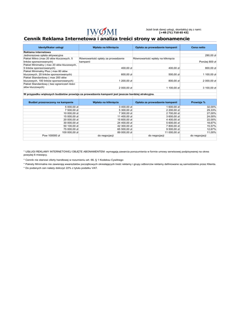 Jeżeli brak danej usługi, skontaktuj się z nami: [+48 (71) 710 65 43] Cennik Reklama Internetowa i analiza treści strony w abonamencie Identyfikator usługi Wpłata na kliknięcia Opłata za prowadzenie kampanii Reklama internetowa Jednorazowa opłata aktywacyjna Pakiet Mikro (max 20 słów kluczowych, 5 Równowartość opłaty za prowadzenie Równowartość wpłaty na kliknięcia linków sponsorowanych) kampanii Pakiet Minimalny ( max 20 słów kluczowych, 5 linków sponsorowanych) 400,00 zł 400,00 zł Pakiet Minimalny Plus ( max 80 słów kluczowych, 20 linków sponsorowanych) 600,00 zł 500,00 zł Pakiet Standardowy ( max 200 słów kluczowych, 100 linków sponsorowanych) 1 200,00 zł 800,00 zł Pakiet Standardowy ( bez ograniczeń ilości słów kluczowych) 2 000,00 zł 1 100,00 zł Cena netto 290,00 zł Poniżej 800 zł 800,00 zł 1 100,00 zł 2 000,00 zł 3 100,00 zł W przypadku większych budżetów prowizja za prowadzenia kampanii jest jeszcze bardziej atrakcyjna. Budżet przeznaczony na kampanie Wpłata na kliknięcia Pow 100000 zł Opłata za prowadzenie kampanii 3 400,00 zł 5 300,00 zł 7 300,00 zł 11 400,00 zł 15 600,00 zł 24 400,00 zł 42 300,00 zł 65 500,00 zł 89 000,00 zł 5 000,00 zł 7 500,00 zł 10 000,00 zł 15 000,00 zł 20 000,00 zł 30 000,00 zł 50 100,00 zł 75 000,00 zł 100 000,00 zł do negocjacji Prowizja % 1 600,00 zł 2 200,00 zł 2 700,00 zł 3 600,00 zł 4 400,00 zł 5 600,00 zł 7 800,00 zł 9 500,00 zł 11 000,00 zł do negocjacji 32,00% 29,33% 27,00% 24,00% 22,00% 18,67% 15,57% 12,67% 11,00% do negocjacji * USŁUGI REKLAMY INTERNETOWEJ OBJĘTE ABONAMENTEM: wymagają zawarcia porozumienia w formie umowy serwisowej podpisywanej na okres powyżej 6 miesięcy. * Cennik nie stanowi oferty handlowej w rozumieniu art. 66, § 1 Kodeksu Cywilnego * Pakiety Minimalne nie zawierają wwarsztatów początkowych okreslających treść reklamy i grupy odbiorców reklamy definiowane są samodzielnie przez Klienta. * Do podanych cen należy doliczyć 22% z tytułu podatku VAT.