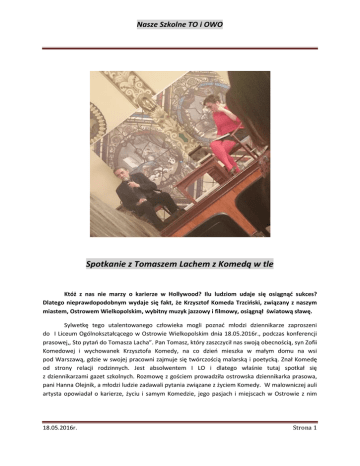 Nasze Szkolne TO i OWO Spotkanie z Tomaszem Lachem z Komedą w tle Któż z nas nie marzy o karierze w Hollywood? Ilu ludziom udaje się osiągnąć sukces? Dlatego nieprawdopodobnym wydaje się fakt, że Krzysztof Komeda Trzciński, związany z naszym miastem, Ostrowem Wielkopolskim, wybitny muzyk jazzowy i filmowy, osiągnął światową sławę. Sylwetkę tego utalentowanego człowieka mogli poznać młodzi dziennikarze zaproszeni do I Liceum Ogólnokształcącego w Ostrowie Wielkopolskim dnia 18.05.2016r., podczas konferencji prasowej,, Sto pytań do Tomasza Lacha”. Pan Tomasz, który zaszczycił nas swoją obecnością, syn Zofii Komedowej i wychowanek Krzysztofa Komedy, na co dzień mieszka w małym domu na wsi pod Warszawą, gdzie w swojej pracowni zajmuje się twórczością malarską i poetycką. Znał Komedę od strony relacji rodzinnych. Jest absolwentem I LO i dlatego właśnie tutaj spotkał się z dziennikarzami gazet szkolnych. Rozmowę z gościem prowadziła ostrowska dziennikarka prasowa, pani Hanna Olejnik, a młodzi ludzie zadawali pytania związane z życiem Komedy. W malowniczej auli artysta opowiadał o karierze, życiu i samym Komedzie, jego pasjach i miejscach w Ostrowie z nim 18.05.2016r. Strona 1 Nasze Szkolne TO i OWO związanych. Młodych dziennikarzy interesowały odpowiedzi na pytania, jakim człowiekiem był w szkole, w gronie przyjaciół, w domu? Gość odpowiadał chętnie i wyczerpująco. Krzysztof Komeda Trzciński urodził się w Poznaniu w 1931r. Mieszkał w Częstochowie, Wałbrzychu. Do Ostrowa wraz z rodziną przeprowadził się w 1947r. Był drobny, niewysokiego wzrostu, o włosach koloru blond, z rudą poświatą latem, z lekko słabszą jedną nogą, po przebytej chorobie Heinego - Medina. I te właśnie cechy były przyczyną introwertyzmu Komedy. Uczęszczał do klasy o profilu humanistycznym ówczesnego Gimnazjum Męskiego, obecnie I LO, szkoły istniejącej od 1845r., zasłużonej dla wielkopolskiego szkolnictwa i tutaj otrzymał w 1950r. świadectwo maturalne. Z pseudonimem artystycznym ,,Komeda” związana jest zabawna historia. Mały Krzyś bawiąc się w wojnę, napisał na drzwiach ,,Komeda”, zamiast „Komenda”, co wywołało wśród kolegów kpiny pod jego adresem. Od tej chwili został Komedą. W ostrowskim liceum Komeda założył w 1948r. szkolny zespół muzyczny ,,Carioca”. Zaczął swingować i interesować się jazzem, razem ze swoimi przyjaciółmi, wbrew woli jego rodziców, którzy chcieli, aby syn był pianistą, gdyż w I połowie lat 50 jazz był muzyką zakazaną. Również w Ostrowie zaprzyjaźnił się z Witoldem Kujawskim. Kontrabasista jazzowy przechodząc koło mieszkania Państwa Trzcińskich usłyszał improwizacje, gdy Komeda grał mazurka Chopina. Młody artysta nie zdawał sobie sprawy, że te improwizacje to właśnie jazz. Dzięki szczęśliwemu zbiegowi okoliczności Komeda zaistniał w krakowskim środowisku jazzowym. Pod presją rodziców studiował medycynę. Studia w Akademii Medycznej w Poznaniu ukończył z wyróżnieniem w 1956r. Zaraz po studiach uciekł do Krakowa, gdzie odbywał się turniej jazzowy i gdzie poznał swoją przyszłą żonę i menedżerkę, Zosię. Występy Sekstetu Komedy, festiwale jazzowe oraz praca nad muzyką do filmów i spektakli pochłaniały kolejne lata artysty. Jako kompozytor filmowy zadebiutował w 1958r. muzyką do etiudy Romana Polańskiego „Dwaj ludzie z szafą”. W 1967r. na zaproszenie reżysera udał się do Hollywood. W 1968r. odniósł sukces komponując muzykę do jego filmu ,,Dziecko Rosemary”, ze słynną "Kołysanką" jako motywem przewodnim, a muzyka Komedy została nominowana do Oscara. Osiągnięta sława pozwoliła na korzystanie z wielu luksusów, o których nie mógł marzyć przeciętny artysta. Komedę było stać na realizację swoich zainteresowań. Od zawsze marzył o szybkich, sportowych samochodach, więc w jego zasięgu było porsche 911 i ford mustang. Uwielbiał też pływać i jeździć na nartach. Na sukces Komedy miał wpływ nie tylko talent, ale i nieprzeciętna pracowitość. Doceniony został też jego indywidualizm. Jak sam Pan Tomasz wspomniał, był pracoholikiem i perfekcjonistą. Tworzył rocznie średnio osiem kompozycji filmowych, wyjątkowych, które zdobywały nagrody. Dla porównania, współczesny artysta komponuje około czterech utworów. Po zakończeniu kompozycji urządzał spotkania w domu, gdzie zapraszał przyjaciół, przedstawiał efekty swojej pracy w celu wyłapania ewentualnych powtórzeń z innych utworów. Komeda był już wówczas tak znanym artystą, że spośród wielu kontraktów wybierał tylko te, które go interesowały. W 1968 r. podpisał intratny kontrakt z wytwórnią Paramount Pictures. Nic nie zapowiadało wielkiego nieszczęścia. 18.05.2016r. Strona 2 Nasze Szkolne TO i OWO W tym czasie przyjaźnił się z Markiem Hłaską, który również przyjechał do Los Angeles na zaproszenie Polańskiego. Niefortunny upadek nocą w pobliżu domu, którego świadkiem był Hłasko, spowodował ciąg dramatycznych zdarzeń: pobyt w szpitalu w Los Angeles, operacje, transport do Warszawy i śmierć artysty 23 kwietnia 1969 roku. W Hollywood był 16 miesięcy. Zmarł mając 38 lat, będąc u szczytu sławy. Krzysztof Komeda dla pana Tomasza, który poznał go mając pięć lat, a więc wówczas dziecka, potem młodzieńca, był bardziej „kumplem” niż ojcem, „dobrym człowiekiem, który przedkładał ponad wszystko negocjacje”. Dlatego z problemem wolał przyjść do niego, niż do swojej matki. Do mamy i ojczyma mówił po imieniu. Krzysztof Komeda był pionierem jazzu nowoczesnego w Polsce. Miał wpływ na rozwój międzynarodowej sceny jazzowej. Napisał muzykę do 65 filmów. Jak określił pan Tomasz Lach, ”był chodzącą muzyką”. W Ostrowie o tym wybitnym artyście przypominają między innymi kino „Komeda”, Zespół Szkół Muzycznych i Festiwal Filmowy jego imienia. Wędr