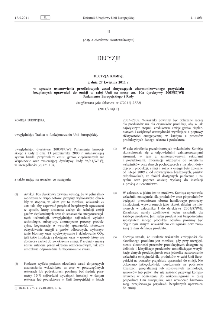 17.5.2011 PL Dziennik Urzędowy Unii Europejskiej L 130/1 II (Akty o charakterze nieustawodawczym) DECYZJE DECYZJA KOMISJI z dnia 27 kwietnia 2011 r. w sprawie ustanowienia przejściowych zasad dotyczących zharmonizowanego przydziału bezpłatnych uprawnień do emisji w całej Unii na mocy art. 10a dyrektywy 2003/87/WE Parlamentu Europejskiego i Rady (notyfikowana jako dokument nr C(2011) 2772) (2011/278/UE) 2007–2008. Wskaźniki powinny być obliczane raczej dla produktów niż dla czynników produkcji, aby w jak największym stopniu zredukować emisje gazów cieplar nianych i zwiększyć oszczędności wynikające z poprawy efektywności energetycznej w każdym z procesów produkcyjnych danego sektora i podsektora. KOMISJA EUROPEJSKA, uwzględniając Traktat o funkcjonowaniu Unii Europejskiej, uwzględniając dyrektywę 2003/87/WE Parlamentu Europej skiego i Rady z dnia 13 października 2003 r. ustanawiającą system handlu przydziałami emisji gazów cieplarnianych we Wspólnocie oraz zmieniającą dyrektywę Rady 96/61/WE (1), w szczególności jej art. 10a, (3) W celu określenia przedmiotowych wskaźników Komisja skonsultowała się z odpowiednimi zainteresowanymi stronami, w tym z zainteresowanymi sektorami i podsektorami. Informacje niezbędne do określenia wskaźników oraz danych pochodzących z instalacji doty czących produkcji, emisji i zużycia energii były zbierane od lutego 2009 r. od stowarzyszeń branżowych, państw członkowskich, ze źródeł dostępnych publicznie i na rynku oraz poprzez ankietę wysłaną do instalacji z prośbą o uczestnictwo. (4) W zakresie, w jakim jest to możliwe, Komisja opracowała wskaźniki emisyjności dla produktów oraz półproduktów będących przedmiotem obrotu handlowego pomiędzy instalacjami, wytworzonych jako skutek działań wymie nionych w załączniku I do dyrektywy 2003/87/WE. Zasadniczo należy zdefiniować jeden wskaźnik dla każdego produktu. Jeśli jeden produkt jest bezpośrednim substytutem innego produktu, obydwa powinny być objęte tym samym wskaźnikiem emisyjności oraz zwią zaną z nim definicją produktu. (5) Komisja uznała, że ustalenie wskaźnika emisyjności dla określonego produktu jest możliwe, gdy przy uwzględ nieniu złożoności procesów produkcyjnych dostępne są definicje i klasyfikacje produktów umożliwiające weryfi kację danych produkcyjnych oraz jednolite zastosowanie wskaźnika emisyjności dla produktów w całej Unii Euro pejskiej na potrzeby przydziału uprawnień do emisji. Nie dokonano jakiegokolwiek rozróżnienia na podstawie lokalizacji geograficznej lub stosowanych technologii, surowców lub paliw, aby nie zakłócić przewagi kompa ratywnej w odniesieniu do niskoemisyjności w całej gospodarce Unii Europejskiej oraz wzmocnić harmoni zację przejściowego przydziału bezpłatnych uprawnień do emisji. a także mając na uwadze, co następuje: (1) (2) Artykuł 10a dyrektywy zawiera wymóg, by w pełni zhar monizowane wspólnotowe przepisy wykonawcze określały w stopniu, w jakim jest to możliwe, wskaźniki ex ante tak, aby zapewnić przydział bezpłatnych uprawnień w sposób, który dostarcza zachęt do redukcji emisji gazów cieplarnianych oraz do stosowania energooszczęd nych technologii, uwzględniając najbardziej wydajne technologie, substytuty, alternatywne procesy produk cyjne, kogenerację o wysokiej sprawności, skuteczne odzyskiwanie energii z gazów odlotowych, wykorzys tanie biomasy oraz wychwytywanie i składowanie CO2, jeśli takie instalacje są dostępne, oraz w sposób, który nie dostarcza zachęt do zwiększenia emisji. Przydziały muszą zostać ustalone przed okresem rozliczeniowym, tak aby umożliwić odpowiednie funkcjonowanie rynku. Punktem wyjścia podczas określania zasad dotyczących ustanawiania wskaźników ex ante w poszczególnych sektorach lub podsektorach powinny być średnie para metry 10 % najbardziej wydajnych instalacji w danym sektorze lub podsektorze w Unii Europejskiej w latach (1) Dz.U. L 275 z 25.10.2003, s. 32. L 130/2 (6) (7) (8) PL Dziennik Urzędowy Unii Europejskiej Wartości wskaźników emisyjności powinny obejmować wszystkie emisje bezpośrednie związane z produkcją, w tym emisje związane z produkcją mierzalnego ciepła wykorzystywanego do produkcji, bez względu na to, czy to mierzalne ciepło zostało wyprodukowana na miejscu, czy też przez inną instalację. Przy określaniu wartości wskaźników emisyjności odjęto emisje związane z produkcją energii elektrycznej oraz z eksportem mierzalnego ciepła, w tym emisje, których uniknięto dzięki alternatywnej produkcji ciepła lub energii elek trycznej w przypadku procesów egzotermicznych lub produkcji energii elektrycznej bez emisji bezpośrednich. Jeżeli odjęcie emisji związanych z eksportem mierzalnego ciepła nie było możliwe, takie ciepło nie powinno kwali fikować się do przydziału bezpłatnych uprawnień do emisji gazów cieplarnianych. W celu zagwarantowania, że wskaźniki emisyjności prowadzą do redukcji emisji gazów cieplarnianych – uwzględniając fakt, że w odniesieniu do niektórych procesów produkcyjnych, w których emisje bezpośrednie kwalifikujące się do przydziału bezpłatnych emisji i emisje pośrednie z produkcji energii elektrycznej niekwalifikujące się do przydziału bezpłatnych uprawnień w oparciu o dyrektywę 2003/87/WE są do pewnego stopnia wymienne – całkowite emisje, w tym również emisje pośrednie związane z produkcją energii elek trycznej, zostały uwzględnione przy określaniu wartości wskaźników emisyjności, aby zapewnić równe szanse instalacjom paliwowym i elektrochłonnym. Na potrzeby przydziału uprawnień do emisji na podstawie danych wskaźników emisyjności należy uwzględniać jedynie udział emisji bezpośrednich w całości emisji w celu unik nięcia sytuacji, w których bezpłatne emisje przydzielane są w odniesieniu do emisji związanych z energią elek tryczną. Dla ok