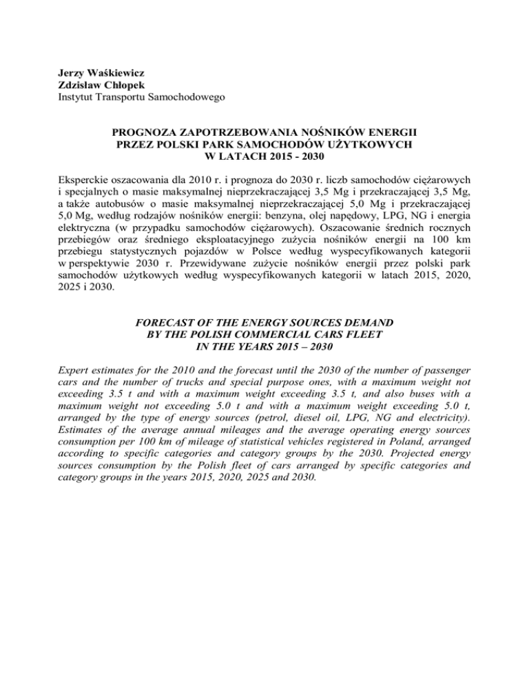 Jerzy Waśkiewicz Zdzisław Chłopek Instytut Transportu Samochodowego PROGNOZA ZAPOTRZEBOWANIA NOŚNIKÓW ENERGII PRZEZ POLSKI PARK SAMOCHODÓW UŻYTKOWYCH W LATACH 2015 - 2030 Eksperckie oszacowania dla 2010 r. i prognoza do 2030 r. liczb samochodów ciężarowych i specjalnych o masie maksymalnej nieprzekraczającej 3,5 Mg i przekraczającej 3,5 Mg, a także autobusów o masie maksymalnej nieprzekraczającej 5,0 Mg i przekraczającej 5,0 Mg, według rodzajów nośników energii: benzyna, olej napędowy, LPG, NG i energia elektryczna (w przypadku samochodów ciężarowych). Oszacowanie średnich rocznych przebiegów oraz średniego eksploatacyjnego zużycia nośników energii na 100 km przebiegu statystycznych pojazdów w Polsce według wyspecyfikowanych kategorii w perspektywie 2030 r. Przewidywane zużycie nośników energii przez polski park samochodów użytkowych według wyspecyfikowanych kategorii w latach 2015, 2020, 2025 i 2030. FORECAST OF THE ENERGY SOURCES DEMAND BY THE POLISH COMMERCIAL CARS FLEET IN THE YEARS 2015 – 2030 Expert estimates for the 2010 and the forecast until the 2030 of the number of passenger cars and the number of trucks and special purpose ones, with a maximum weight not exceeding 3.5 t and with a maximum weight exceeding 3.5 t, and also buses with a maximum weight not exceeding 5.0 t and with a maximum weight exceeding 5.0 t, arranged by the type of energy sources (petrol, diesel oil, LPG, NG and electricity). Estimates of the average annual mileages and the average operating energy sources consumption per 100 km of mileage of statistical vehicles registered in Poland, arranged according to specific categories and category groups by the 2030. Projected energy sources consumption by the Polish fleet of cars arranged by specific categories and category groups in the years 2015, 2020, 2025 and 2030. Transport Samochodowy 4-2013 Wprowadzenie Przedstawiona w niniejszym artykule prognoza stanowi uzupełnienie prezentowanych wyników badań dotyczących przyszłościowego zapotrzebowania nośników energii przez polski park samochodów osobowych, przedstawionych w numerze 3/2013 kwartalnika „Transport Samochodowy”. Przedmiotem artykułu są eksperckie prognozy aktywności1 (zapotrzebowania nośników energii) przez park samochodów użytkowych w Polsce do 2030 r. Posługując się obowiązującymi definicjami kategorii i typów pojazdów [1], przyjęto następujące grupy kategorii pojazdów, których dotyczy prognoza: samochody ciężarowe o maksymalnej masie nieprzekraczającej 3,5 Mg (kategorii N1), autobusy o maksymalnej masie nieprzekraczającej 5,0 Mg (kategorii M2), samochody specjalne o maksymalnej masie nieprzekraczającej 3,5 Mg (kategorii M i N), samochody ciężarowe i ciągniki siodłowe z naczepami oraz samochody specjalne kategorii N2 i N3 (o maksymalnej masie przekraczającej 3,5 Mg), a także autobusy kategorii M3 (o maksymalnej masie przekraczającej 5,0 Mg). Prognozę zużycia nośników energii przez park samochodów użytkowych przygotowano uwzględniając prognozy następujących zasadniczych czynników decydujących o wielkości popytu na te nośniki [3]: prognozy liczb pojazdów, prognozy średnich rocznych przebiegów pojazdów, prognozy średniego eksploatacyjnego zużycia nośników energii na 100 km przebiegu pojazdów. Ogólne zużycie paliw silnikowych według ich rodzajów przez park samochodów użytkowych stanowi sumę iloczynów poszczególnych czynników według odpowiednich grup kategorii pojazdów. Przedstawiony wariant prognozy zapotrzebowania na nośniki energii bazuje na przewidywanych wartościach kształtowania się czynników determinujących przyszłościowy rozwój transportu samochodowego w Polsce, który uznano przy obecnym stanie posiadanej wiedzy, za najbardziej prawdopodobny. 1. Prognoza liczebności parku samochodów użytkowych 1.1. Prognoza liczebności samochodów ciężarowych Liczba samochodów ciężarowych zarejestrowanych w Polsce wg stanu na koniec 2010 r. wyniosła 2 981,6 tys. szt. (2 920,8 tys. szt. w 2012 r.), w tym 214,6 tys. ciągników siodłowych (258,2 tys. szt. w 2012 r.) [4]. Oszacowana na podstawie danych GUS liczba samochodów ciężarowych o masie maksymalnej nieprzekraczającej 3,5 Mg zarejestrowanych w Polsce wg stanu na koniec 2010 r. wynosiła 2 170,6 tys. szt. (2 303,4 tys. szt. w 2012 r.), a o masie maksymalnej przekraczającej 3,5 Mg wynosiła 811 tys. szt. (875,5 tys. szt.). 1 „Aktywnością”, zgodnie z ustawą z dnia 17 lipca 2009 r. o systemie zarządzania emisjami gazów cieplarnianych i innych substancji, jest działalność (w tym przypadku sektora transportu drogowego), której skutkiem jest emisja zanieczyszczeń (tu z silników spalinowych) [2]. 6 Prognoza zapotrzebowania nośników energii… Prognozowane liczby samochodów ciężarowych wg grup masy maksymalnej są uwarunkowane przede wszystkim wielkością pracy przewozowej przewidywanej do wykonania przez polski park ciężarowy i prognozowanej średniej wydajności pracy przewozowej statystycznego pojazdu. Przewidując zmiany średniej rocznej wydajności pracy przewozowej statystycznego samochodu ciężarowego w okresie prognozy zakłada się, że cechami techniczno eksploatacyjnymi, które w sposób szczególny będą wpływać na wzrost tej wydajności w skali dotyczącej całości polskiego transportu samochodowego będą: wzrost wykorzystania taboru, wzrost wykorzystania przebiegu, wzrost wykorzystania czasu pracy. Kształtowaniu się tych wskaźników powinny sprzyjać przewidywane zmiany strukturalne w polskim transporcie ciężarowym, wpływające m.in. na unowocześnienie struktury parku ciężarowego, zmiany struktury wielkości przedsiębiorstw zarobkowego transportu samochodowego, a także rozwój logistyki, wykorzystanie nowoczesnych technologii informacyjno komunikacyjnych w transporcie, rozwój nowoczesnej infrastruktury drogowej, w tym sieci autostrad, dróg ekspresowych itp. Według opracowa