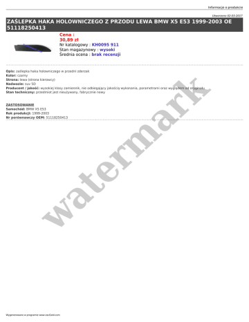 Informacje o produkcie Utworzono 02-03-2017 ZAŚLEPKA HAKA HOLOWNICZEGO Z PRZODU LEWA BMW X5 E53 1999-2003 OE 51118250413 Cena : 30,89 zł Nr katalogowy : KH0095 911 Stan magazynowy : wysoki Średnia ocena : brak recenzji w at ZASTOSOWANIE Samochód: BMW X5 E53 Rok produkcji: 1999-2003 Nr porównawczy OEM: 51118250413 er m ar k Opis: zaślepka haka holowniczego w przedni zderzak Kolor: czarny Strona: lewa (strona kierowcy) Nadwozie: suv 5D Producent / jakość: wysokiej klasy zamiennik, nie odbiegający jakością wykonania, parametrami oraz wyglądem od oryginału Stan techniczny: przedmiot jest nieużywany, fabrycznie nowy Wygenerowano w programie www.oscGold.com