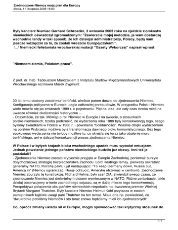 Zjednoczone Niemcy mają plan dla Europy środa, 11 listopada 2009 16:00 Były kanclerz Niemiec Gerhard Schroeder, 3 września 2003 roku na zjeździe ziomkostw niemieckich oświadczył zgromadzonym: "Zawierzcie mojej metodzie, ja wam dostarczę wschodnie landy w taki sposób, że ich dzisiejsi administratorzy, Polacy, będą nam jeszcze wdzięczni za to, że zostali wreszcie Europejczykami". /.../ Niemiecki felietonista wrocławskiej mutacji "Gazety Wyborczej" napisał wprost: "Niemcom ziemia, Polakom praca". Z prof. dr. hab. Tadeuszem Marczakiem z Instytutu Studiów Międzynarodowych Uniwersytetu Wrocławskiego rozmawia Marek Zygmunt. 20 lat temu obalony został mur berliński, wkrótce potem doszło do zjednoczenia Niemiec. Konfiguracja polityczna w Europie uległa całkowitej przebudowie. W przypadku Polski i Niemiec wiele mówiło się po zmianach 1989 r. o pojednaniu. Piękna idea, ale cały czas trzeba mieć na uwadze również okoliczności historyczne ... - Oczywiście, że tak. Mówiąc o roli Niemiec w Europie i na świecie, o stosunkach polsko-niemieckich, trzeba podkreślić, że wydarzenia roku 1989 były konsekwencją tego, czego byliśmy świadkami w Polsce w 1980 r. - powstania "Solidarności". Właśnie dzięki wydarzeniom na polskim Wybrzeżu możliwa była transformacja dawnego bloku komunistycznego. Bez tego epokowego wydarzenia nie byłoby możliwe to, co określa się teraz jako obalenie muru berlińskiego, ani w dalszej konsekwencji proces zjednoczenia Niemiec. W Polsce i w byłych krajach bloku wschodniego upadek muru wywołał entuzjazm. Jednak powstanie jednego państwa niemieckiego budziło już obawy. Inni też je podzielali? - Zjednoczenie Niemiec zostało krytycznie przyjęte w Europie Zachodniej, ponieważ burzyło dotychczasową strategię bezpieczeństwa Zachodu. Lord Hastings Ismay, pierwszy sekretarz generalny NATO, filozofię paktu ujął następująco: "To keep Germany down, Russia out, America in" (Niemcy ograniczać, Rosję odrzucić, Amerykę utrzymać w centrum). Zjednoczenie Niemiec zburzyło tę konstrukcję. Richard Helms, były szef CIA, stwierdził swego czasu, że zjednoczenie Niemiec jest śmiertelnym ciosem wymierzonym w NATO. Różne perturbacje, jakie dzisiaj obserwujemy w łonie zachodniego sojuszu, są w dużej mierze tego konsekwencją. Perspektywa połączenia obu państw niemieckich niepokoiła np. ówczesną premier Wielkiej Brytanii Margaret Thatcher. Były kanclerz Niemiec Helmut Kohl przytacza w swoich pamiętnikach kąśliwe uwagi pani Thatcher na ten temat. Miała ona np. powiedzieć, że "dwukrotnie pobiliśmy Niemców i oto teraz znowu będziemy mieli ich zjednoczonych". Co, oprócz zmiany układu sił w Europie, mogło spowodować taki krytyczny stosunek do 1/6 Zjednoczone Niemcy mają plan dla Europy środa, 11 listopada 2009 16:00 zjednoczenia Niemiec? - Na pewno powody były różne i wypływały z brytyjskiej racji stanu. Ale chciałbym zwrócić przede wszystkim uwagę na pewien polski aspekt niepokojący brytyjską panią premier. Otóż jak przytacza w swoich wspomnieniach Helmut Kohl, Margaret Thatcher była święcie przekonana, że zjednoczone Niemcy wysuną roszczenia terytorialne wobec Polski i zakwestionują w takiej czy w innej formie granicę na Odrze i Nysie Łużyckiej. Niejako wizualnie zostało to przedstawione we wspomnieniach Kohla w następujący sposób: angielska pani premier wyciąga ze swojej torebki mapę, na której miała zaznaczone polskie ziemie zachodnie oraz czeskie Sudety, i mówi do Kohla, że tego właśnie będą chcieli z powrotem Niemcy. Na ten aspekt bezpośrednio nas dotyczący musimy stale zwracać uwagę, zwłaszcza że w 1990 roku niemiecki tygodnik "Der Spiegel" opublikował wywiad, w którym Margaret Thatcher stwierdziła m.in., że Kohl mówił jej, iż Niemcy nigdy nie uznają granicy na Odrze i Nysie Łużyckiej. O tym jednak nie wiedzieliśmy, kiedy 20 lat temu w Krzyżowej, podczas słynnej Mszy Pojednania, kanclerz Helmut Kohl i premier Tadeusz Mazowiecki wymienili znak pokoju. To spotkanie chcieliśmy traktować jako początek prawdziwego pojednania między naszymi narodami, ale na zasadzie uznania powojennych realiów i tego, co zostało zbudowane po 1945 roku w celu umocnienia pokoju w Europie... - Granica polsko-niemiecka była i jest jednym z podstawowych elementów tego właśnie pokoju. Na pewno rok 1989, Msza Pojednania powinny otworzyć drogę do unormowania pewnych zaszłości między Polską a Niemcami, które spowodowała II wojna światowa. Chciałbym w tym kontekście podkreślić szczególnie problem zniszczeń wojennych Polski i odszkodowań dla naszego kraju. Po II wojnie światowej trwały u nas prace nad obliczeniem wielkości tych strat. Dotyczyły one tzw. Ziem Dawnych, które znalazły się po II wojnie światowej w granicach państwa polskiego. Na wschodzie teren ten był ograniczony linią Bugu, a na zachodzie przedwojenną granicą polsko-niemiecką. Okazało się, że ogół strat wojennych Polski sięgał prawie 50 mld USD według wartości dolara z 1937 roku. Dzisiaj, żeby mieć wyobrażenie o ogromie wojennych strat naszego kraju, trzeba by to wielokrotnie pomnożyć. Należałoby więc oczekiwać, że w nowej sytuacji po zjednoczeniu Niemiec problem ten czym prędzej zostanie postawiony na wokandzie spraw polsko-niemieckich. Tak jednak się nie stało. Jest to wielkie zaniedbanie ze strony polskiej dyplomacji. To zaniechanie zaowocowało tym, że mamy obecnie do czynienia z absurdalną sytuacją, kiedy to Niemcy zgłaszają roszczenia majątkowe wobec Polski. Ta kwestia jest w mniej lub bardziej jawnej formie stale obecna w naszej codzienności. Najdobitniej ilustruje to wypowiedź byłego kanclerza Niemiec Gerharda Schroedera, który 3 września 2003 roku na zjeździe ziomkostw niemieckich oświadczył zgromadzonym: "Zawierzcie mojej metodzie, ja wam dostarczę wschodnie landy w taki sposób, że ich dzisiejsi administratorzy, Polacy, będą