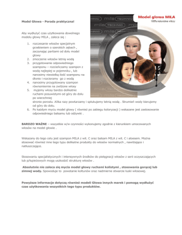 Model Głowa - Porada praktyczna! Aby wydłużyć czas użytkowania dowolnego modelu głowy MILA , zaleca się : 1. rozczesanie włosów specjalnym grzebieniem o szerokich zębach , zaczynając partiami od dołu model głowy 2. zmoczenie włosów letnią wodą 3. przygotowanie odpowiedniego szamponu – rozcieńczamy szampon z wodą najlepiej w pojemniku , lub nanosimy niewielką ilość szamponu na dłonie i rozcieramy go z wodą 4. nanosimy przygotowany szampon równomiernie na zwilżone włosy 5. myjemy włosy bardzo delikatnie ruchami posuwistymi od góry do dołu po wierzchniej stronie porostu .Kilka razy powtarzamy i spłukujemy letnią wodą . Strumień wody kierujemy od góry do dołu. 6. Po każdym myciu model głowy ( również po zabiegu koloryzacji ) wskazane jest zastosowanie odpowiedniego balsamu lub odżywki . BARDZO WAŻNE – wszystkie w/w czynności wykonujemy zgodnie z kierunkiem umocowanych włosów na model głowie . Wskazany do tego celu jest szampon MILA z wit. C oraz balsam MILA z wit. C i aloesem. Można stosować również inne tego typu delikatne produkty do włosów normalnych , nawilżające i natłuszczające. Stosowaniu specjalistycznych i intensywnych środków do pielęgnacji włosów z serii oczyszczających lub p/łupieżowych mogą uszkodzić strukturę włosów . Absolutnie nie zaleca się mycia model głowy ruchami kolistymi , stosowania gorącej lub zimnej wody. Spowoduje to powstanie kołtunów oraz nadmierne otwarcie łuski włosowej. Powyższe informacje dotyczą również modeli Głowa innych marek i pomogą wydłużyć czas użytkowania wszystkich tego typu produktów.