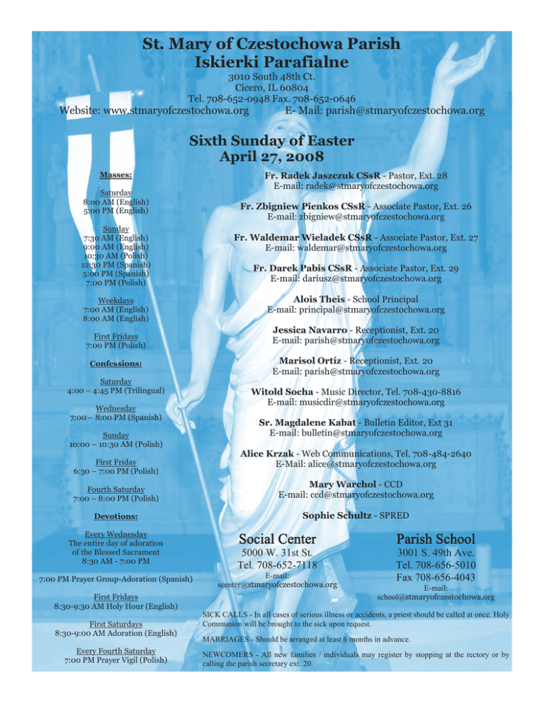 St. Mary of Czestochowa Parish Iskierki Parafialne 3010 South 48th Ct. Cicero, IL 60804 Tel. 708-652-0948 Fax. 708-652-0646 Website: www.stmaryofczestochowa.org E- Mail: [email protected] Sixth Sunday of Easter April 27, 2008 Masses: Saturday 8:00 AM (English) 5:00 PM (English) Sunday 7:30 AM (English) 9:00 AM (English) 10:30 AM (Polish) 12:30 PM (Spanish) 5:00 PM (Spanish) 7:00 PM (Polish) Weekdays 7:00 AM (English) 8:00 AM (English) First Fridays 7:00 PM (Polish) Confessions: Saturday 4:00 – 4:45 PM (Trilingual) Wednesday 7:00 – 8:00 PM (Spanish) Sunday 10:00 – 10:30 AM (Polish) First Friday 6:30 – 7:00 PM (Polish) Fr. Radek Jaszczuk CSsR - Pastor, Ext. 28 E-mail: [email protected] Fr. Zbigniew Pienkos CSsR - Associate Pastor, Ext. 26 E-mail: [email protected] Fr. Waldemar Wieladek CSsR - Associate Pastor, Ext. 27 E-mail: [email protected] Fr. Darek Pabis CSsR - Associate Pastor, Ext. 29 E-mail: [email protected] Alois Theis - School Principal E-mail: [email protected] Jessica Navarro - Receptionist, Ext. 20 E-mail: [email protected] Marisol Ortíz - Receptionist, Ext. 20 E-mail: [email protected] Witold Socha - Music Director, Tel. 708-430-8816 E-mail: [email protected] Sr. Magdalene Kabat - Bulletin Editor, Ext 31 E-mail: [email protected] Alice Krzak - Web Communications, Tel. 708-484-2640 E-Mail: [email protected] Fourth Saturday 7:00 – 8:00 PM (Polish) Mary Warchol - CCD E-mail: [email protected] Devotions: Sophie Schultz - SPRED Every Wednesday The entire day of adoration of the Blessed Sacrament 8:30 AM - 7:00 PM 7:00 PM Prayer Group-Adoration (Spanish) First Fridays 8:30-9:30 AM Holy Hour (English) First Saturdays 8:30-9:00 AM Adoration (English) Every Fourth Saturday 7:00 PM Prayer Vigil (Polish) Social Center Parish School 5000 W. 31st St. Tel. 708-652-7118 3001 S. 49th Ave. Tel. 708-656-5010 Fax 708-656-4043 E-mail: [email protected] E-mail: [email protected] SICK CALLS - In all cases of serious illness or accidents, a priest should be called at once. Holy Communion will be brought to the sick upon request. MARRIAGES - Should be arranged at least 6 months in advance. NEWCOMERS - All new families / individuals may register by stopping at the rectory or by calling the parish secretary ext. 20. Sunday 7:00 April 27, Sixth Sunday of Easter 7:30 Parishioners 9:00 †Dr. Edward Kabat (Sister Magdalene Kabat) 10:30 Dziękczynna z prośbą o dalsze bł. w 10 rocz ślubu dla Józef i Halina Obrochta †Halina Czykier (husband) †Anna Maciarowski †Anna i Józef Maciarowscy †Zenon Czykier (Elizabeth Villa) †Wiktoria Nieć (5 rocz. śm) 12:30 †Nicolasa V. Huerta (anniv. de fallecimiento, la familia Huerto-De Avila) 5:00 Por los feligreses 7:00 Za parafian April 28, Monday, Peter Chanel, priest, martyr 7:00 †Clarence C. Crawford (Mr. James Wilfinger) 8:00 Speedy recover for Linda Gavin (uncle Bob) April 29-Tuesday, Catherine of Sienna, virgin, doctor 7:00 †George Bochniarz (Norbert Sladek) 8:00 †Holy Souls in Book of Remembrance April 30, Wednesday, Pius V, pope 7:00 Parishioners 8:00 †Deceased members of the Warren family 8:30 Eucharistic Adoration until 7PM 7:00 El Círculo de Oración May 1, Thursday, Easter Weekday 7:00 †Holy Souls in Book of Remembrance 8:00 Parishioners May 2, Friday, Athanasius, bishop, doctor 7:00 Parishioners 8:00 †Holy Souls in Book of Remembrance 8:30- First Friday Adoration 7PM Polish Mass May 3, Saturday, Philip & James, apostles 8:00 Parishioners 8:30 First Saturday Adoration 10:00 1st Holy Communion Mass - St. Mary’s School 12:30 1st Holy Communion Mass - Religious Ed. Class 5:00 †Maria Leon (Oliva-Ayala) Iskierki Parafialne †Toni Caputo & Mary Albanese (family) †Loretta Zima (Helen Strzelczyk) †Marie Zalesiak (Rita Mejka) Polish Mass-N M P Królowej Polski May 4, Sunday, ASCENSION OF THE LORD 7:30 Parishioners 9:00 †Virlene Athern (Brian, husband) †Gen Kowalski (Florence Glosniak) 10:30 †Halina Czykier (husband) †Jan & Bronisława Sowinski (family & friends) †Józef Pałka (12 rocz. śm.) †Aniela i Stanisława Tylka (rocz. śm.) 12:30 †Olga Villa (Elizabeth Villa) †Francisco Villa (Elizabeth Villa) 5:00 Por los feligreses 7:00 Za parafian Lector Schedule May 3, 2008 5pm Martha Stolarski, Sr. Magdalene May 4, 2008 7:30 John Kociolko 9:00 Eric Batrez, Marissa Martinez 10:30 Jarek Szyszak, Adrian Ślęzak 12:30 Marisol Ortiz, Aldo Ibarra Linda Ramirez, Roberto Pasillas 5:00 Alex O. Nuñez, Griselda Avitia, Enrique Garcia 7:00 Polish lectors Eucharistic Ministers May 3, 2008 5pm Joanne Napoletano, Jean Yunker May 4, 2008 7:30 Ed Hennessy 9:00 Rafael Ayala, Christine Zaragoza, Georgia Czarnecki, Myra Rodriguez 10:30 Priests & Polish Ministers 12:30 Juana Salas, MaCruz Rodriguez, Marisol Ortiz 5:00 Ma Trinidad Torres, Ma Clara Nova 7:00 Priests and Polish Ministers W EDDING BANNS There is a promise of marriage between…. II. Krystyna Styrczula & Andrzej Basiorka I. Tamara Lynn Hastings & Jarosław Oliszewicz St. Mary of Czestochowa Sunday Collection April 20, 2008 The parents of St. Mary of Czestochowa School are sponsoring a Family Fiesta for the benefit of the school on Sunday, April 27th from 1:30pm to 6pm in Makuch Hall. Please join them for great entertainment, raffles, craft tables, food and more! Choirs from the following High Schools will provide the entertainment: ► 1:30pm Maria High School ► 2:00pm St. Joseph High School ► 3:00pm Queen of Peace High School ► 4:00pm Fenwick High School The Split-the-Pot drawing will take place at 5:00pm. Admission is a free will offering at the door. Please call (708) 6565010 ext. 56 for more information. Mothers’ Day will be celebrated on Sunday May 11, 2008. If you would like to remember your Mother, Stepmother, Grandmother, Aunt or anyone who is “mother” to you, with a spiritual gift - . a special Mass intention - please pick up a MOTHERS’ DAY MASS INTENTION ENVELOPE which can be found at all entrances of the church. Your “special person” 